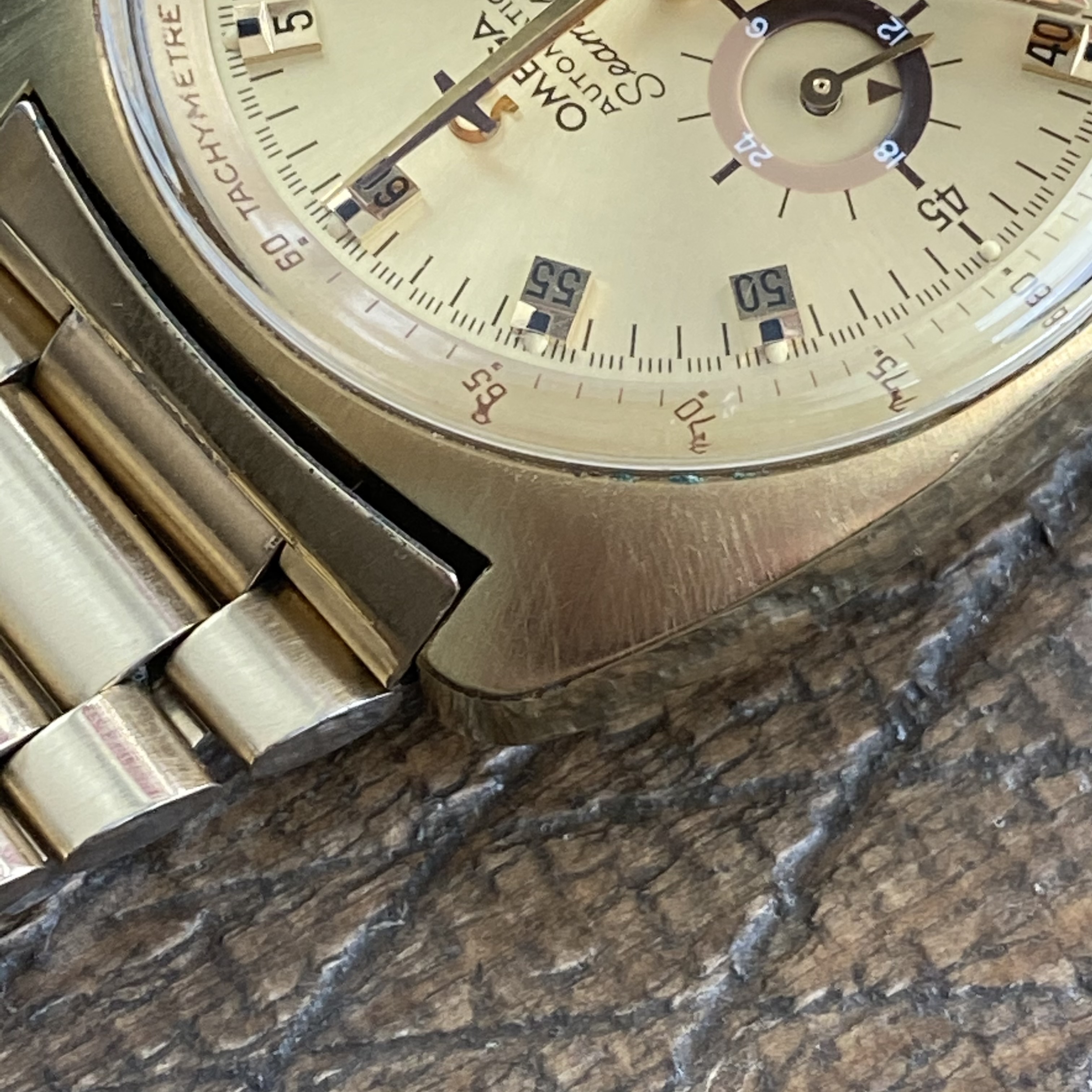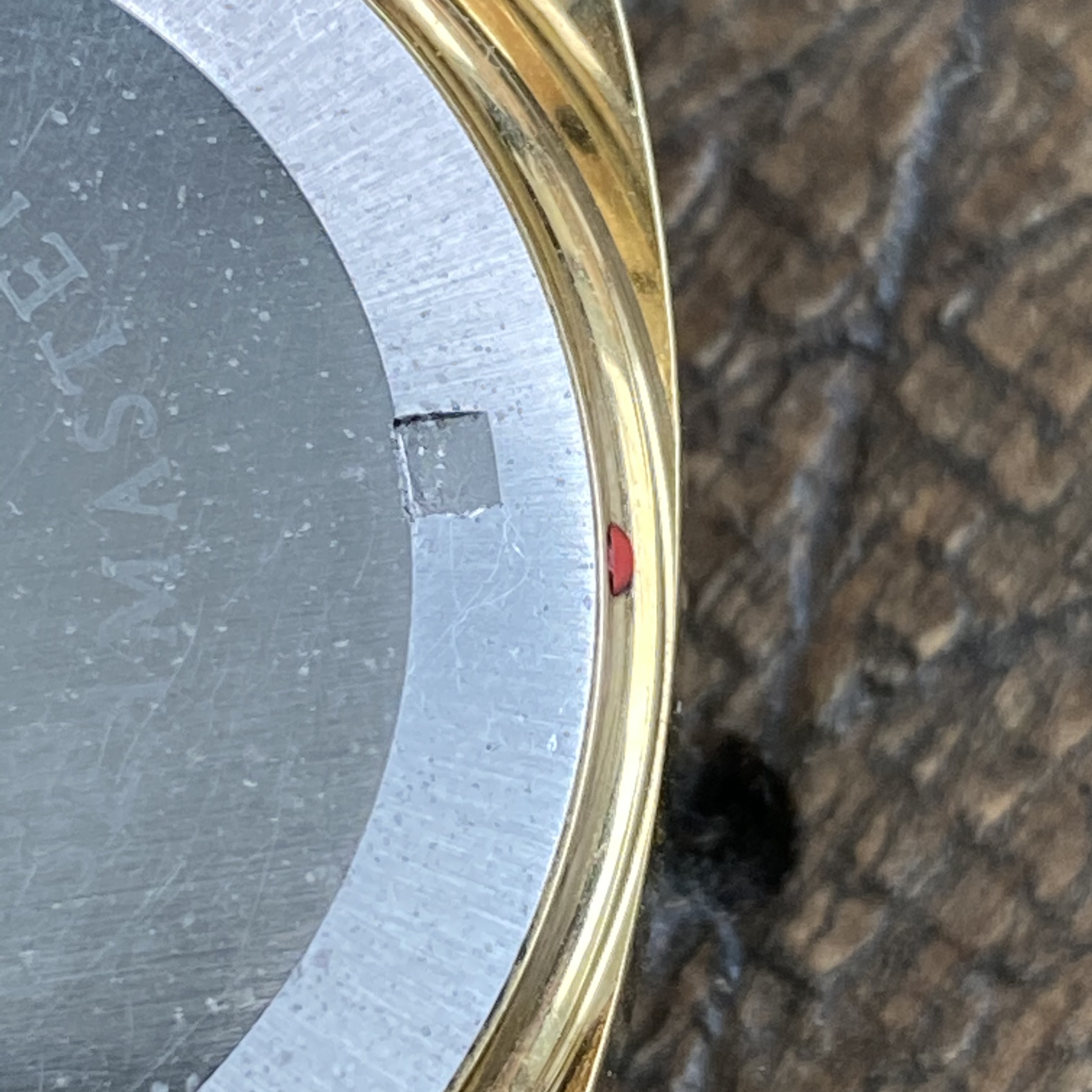 Cushion style case is unpolished and in good condition. It retains most of its sharp edges but does show some surface marks, oxidation, scratches and some minor loss of plating along a small corner of the case. Slight dent at 9:00. Original plating is in good condition and 20 micron stamp between the lugs still visible. PLEASE REVIEW PHOTOS. I tried to include closeups of the dent, the missed plating, and the oxidation.