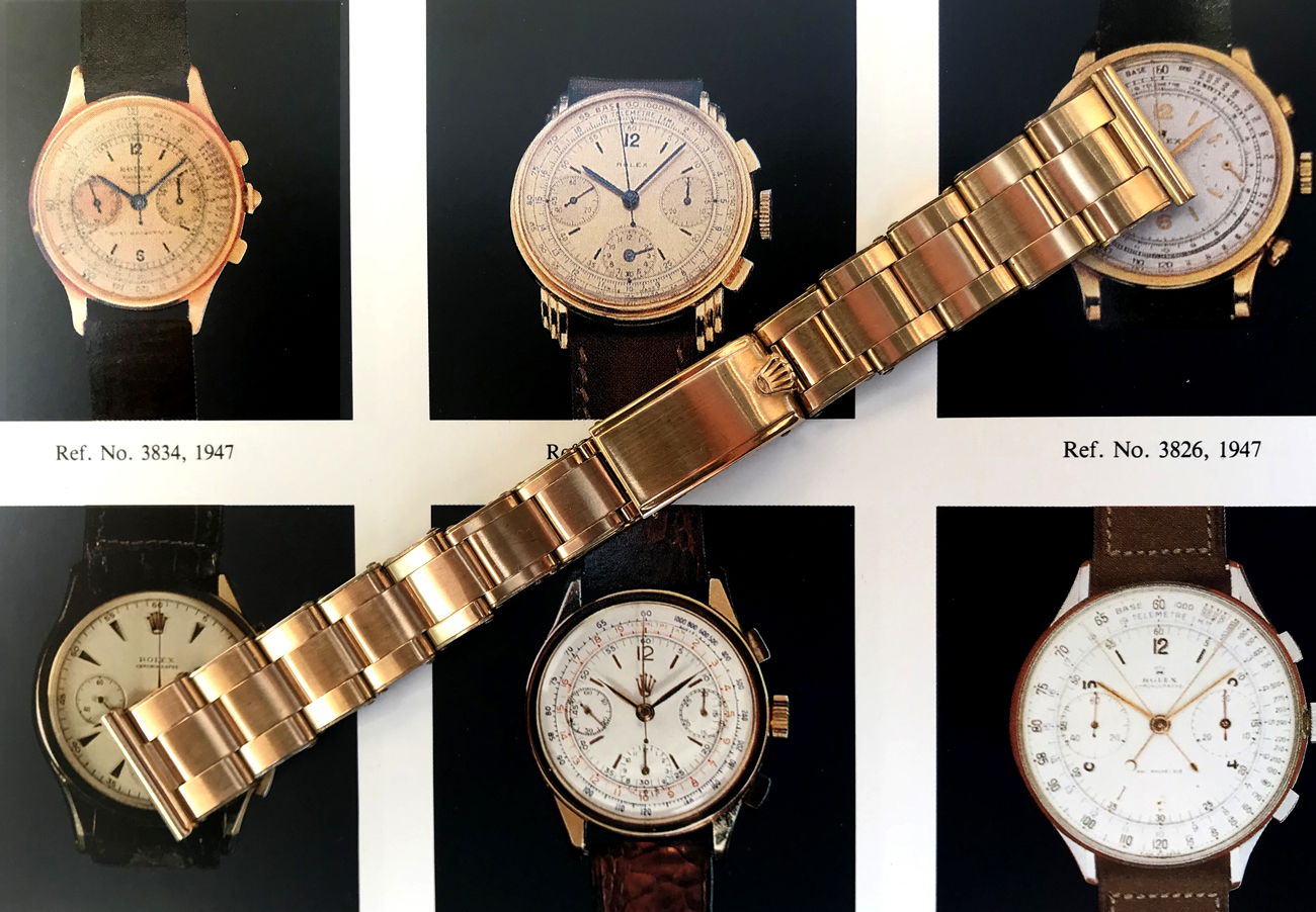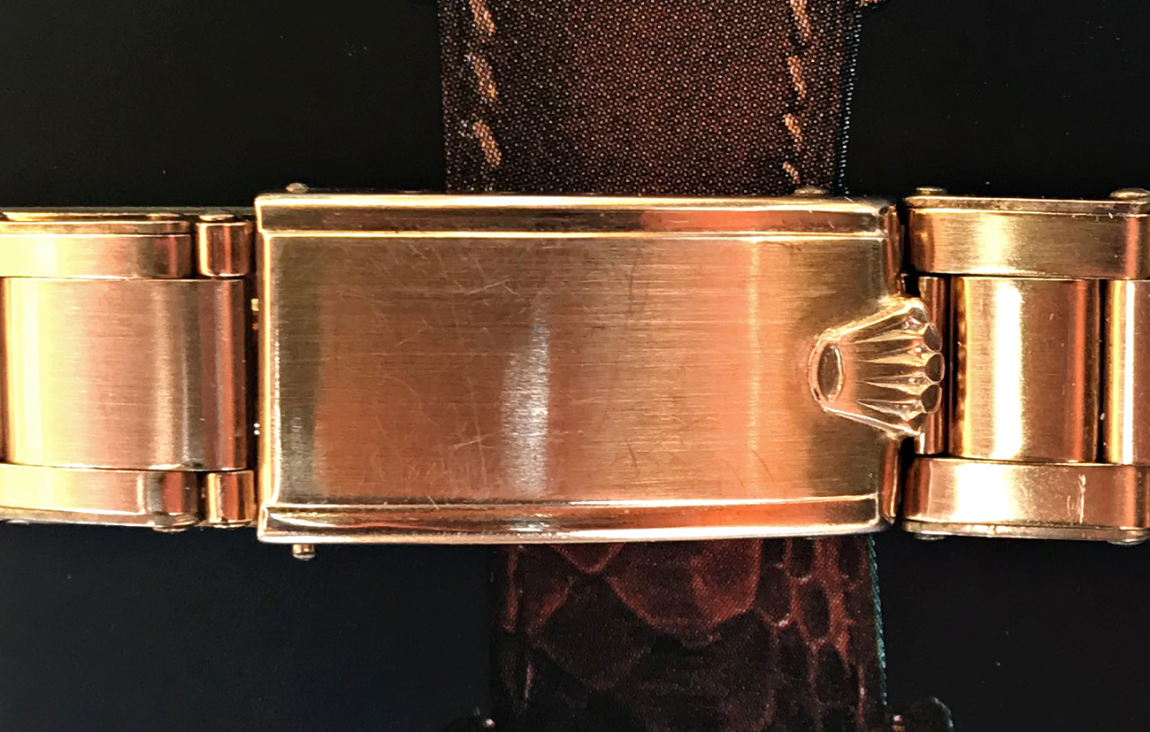 ·Up for sale is this highly uncommon and absolutely Near Mint genuine Rolex pink gold-plated stretch Rivet Oyster bracelet dated “3 51” on the clasp and featuring desirable pre-flush fit straight ends. This hard to find stretch Oyster fits any 19mm lug width Rolex of the era in either solid pink gold or two-tone pink & steel, including certain pre-Daytona chronographs and other highly desirable late ‘40s/early to mid-‘50s complications. You would be hard pressed to find another 1950s plated Oyster bracelet in this condition, as aside from some superficial scratches to the clasp it is essentially pristine. Despite its age, it remains factory-tight, unpolished, the deployant clasp closure is crisp and secure and the stretch links expand firmly but smoothly - a sure sign of a rarely used bracelet.