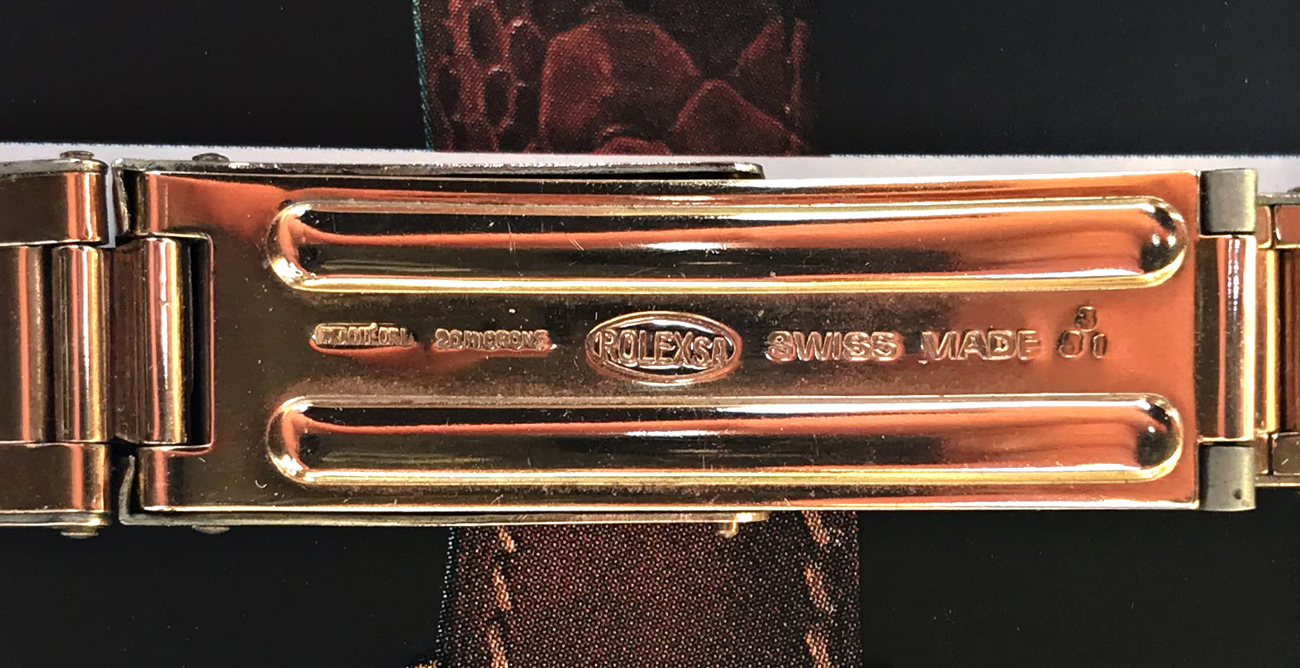 The correct complete nomenclature stamped on the inner clasp blade reads: “PLAQUE ORL/20 MICRONS/ROLEX SA/SWISS MADE/3 51.”