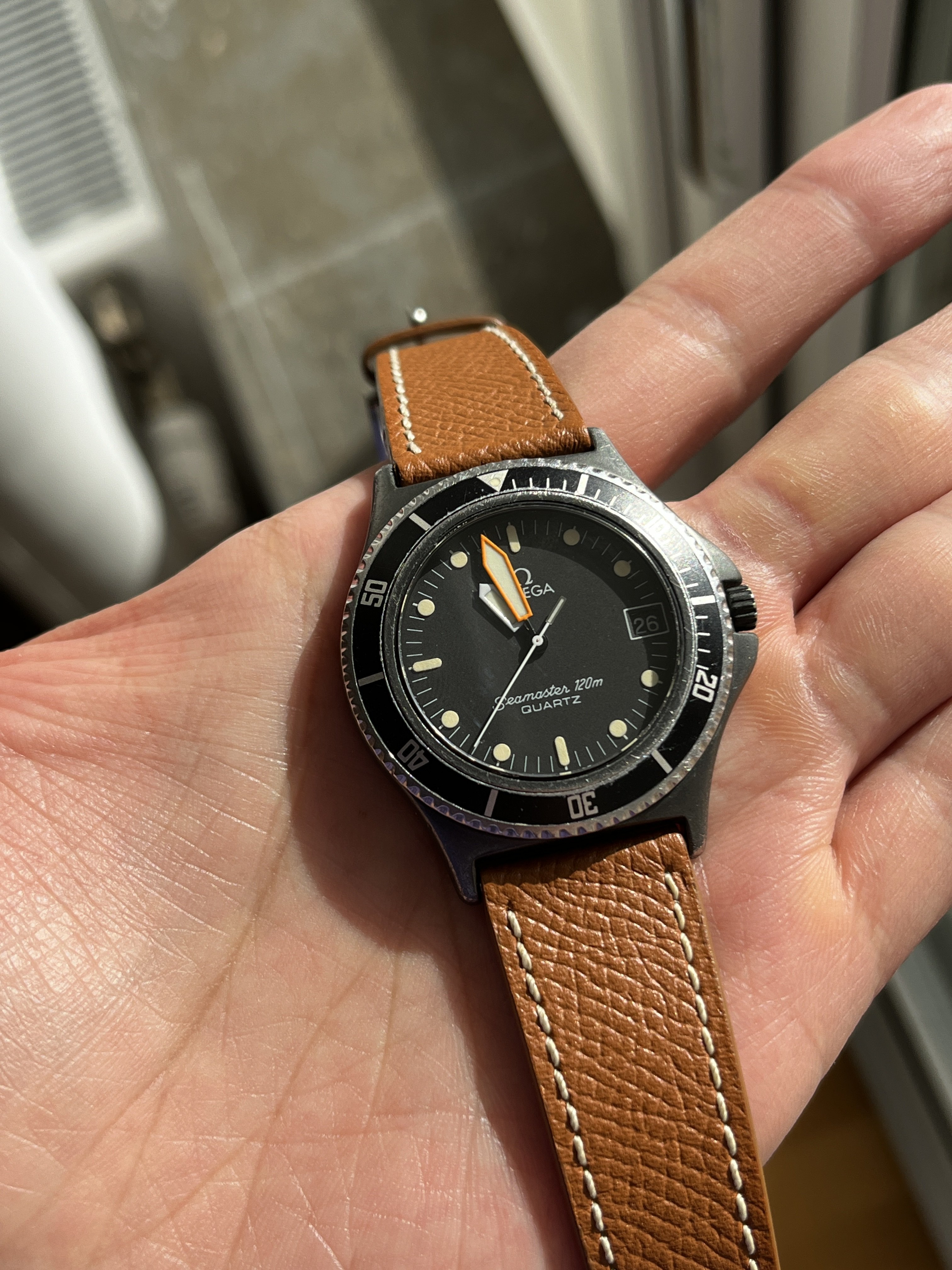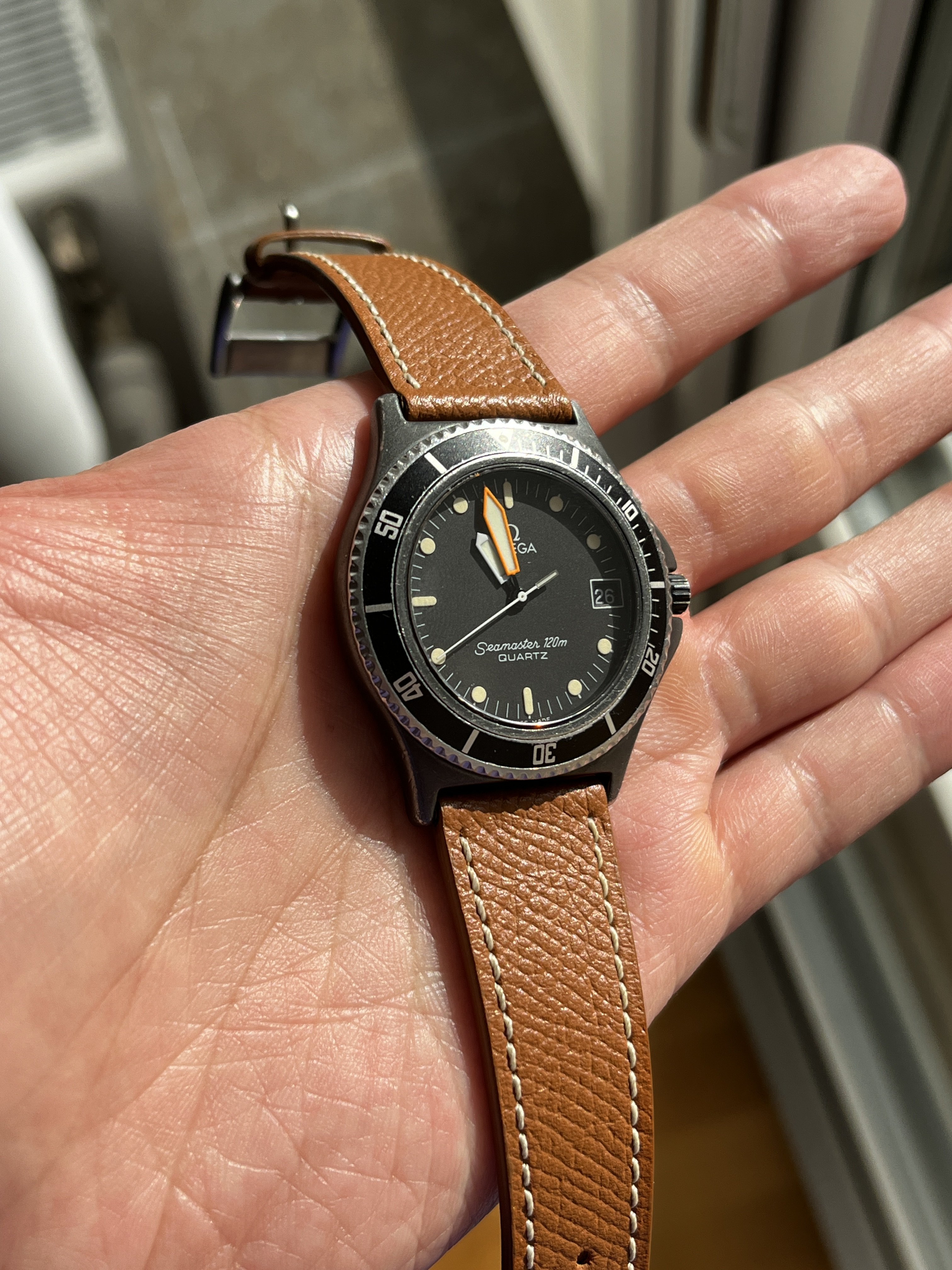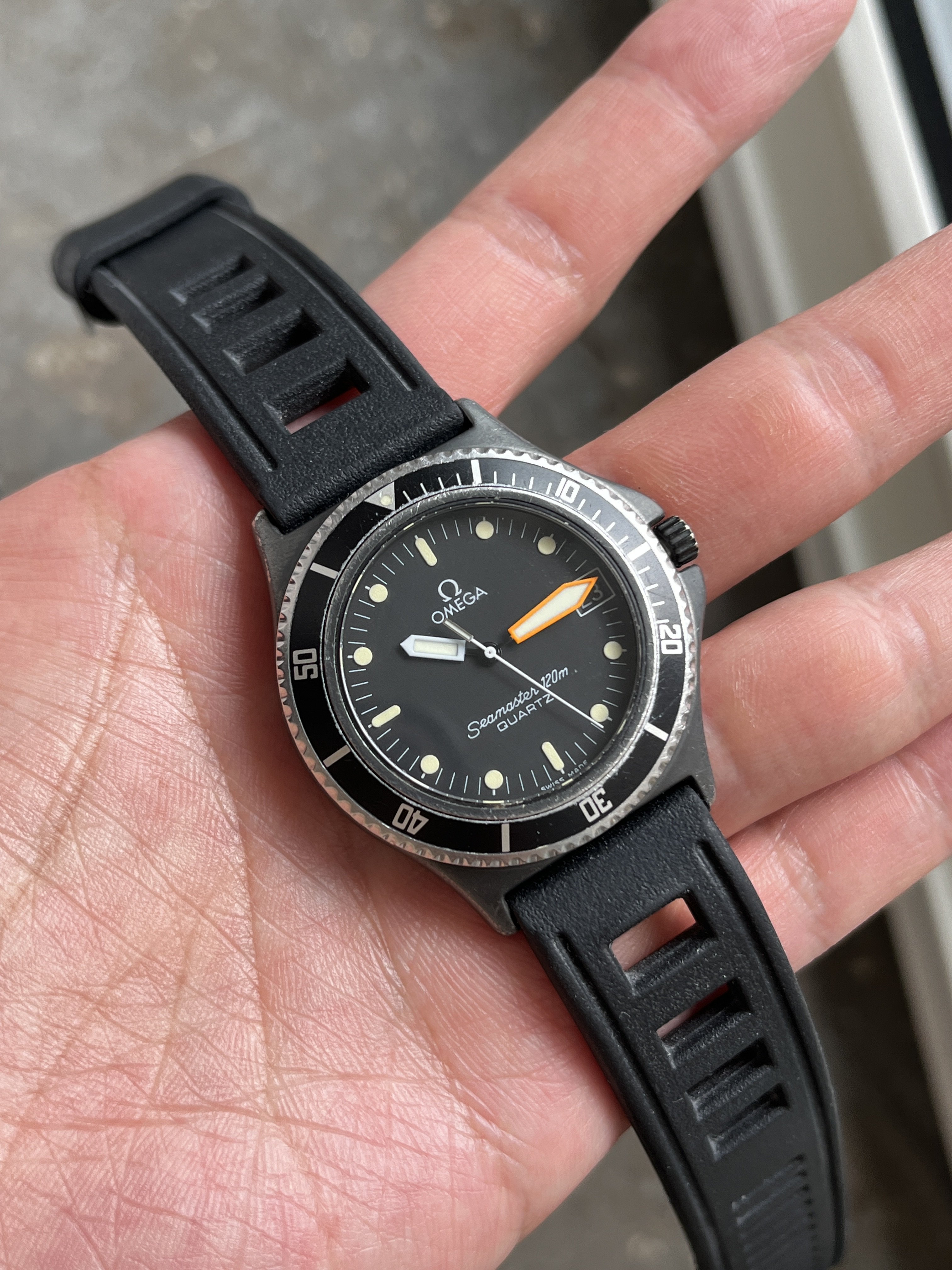 The quartz movement runs well and accurately. I don't know when it was last serviced, but the battery was changed 1,5 year ago. The case have some minor scuffs but appear honest and unpolished. The lume on the hands shines brighter than the indexes, and I assume the they've been changed before. They match quite well though. Worth to know is that the bezel is quite difficult to grip becasue of the short teeths, but it does turn with a bit of effort 😉 Watch comes on a true isofrane rubber strap. No box or papers.