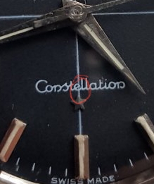 - To my eye the it has been redailed. Looking at the Omega archive the reference and caliber identity it as a 1961 Constellation De Luxe. From seeing Omega's reference images and searching for other models the crosshair shouldn't be on the dail. Furthermore the paint finish is uniform in colour with no signs of aging. The other tell was the chiped paint to the edge of the dail.