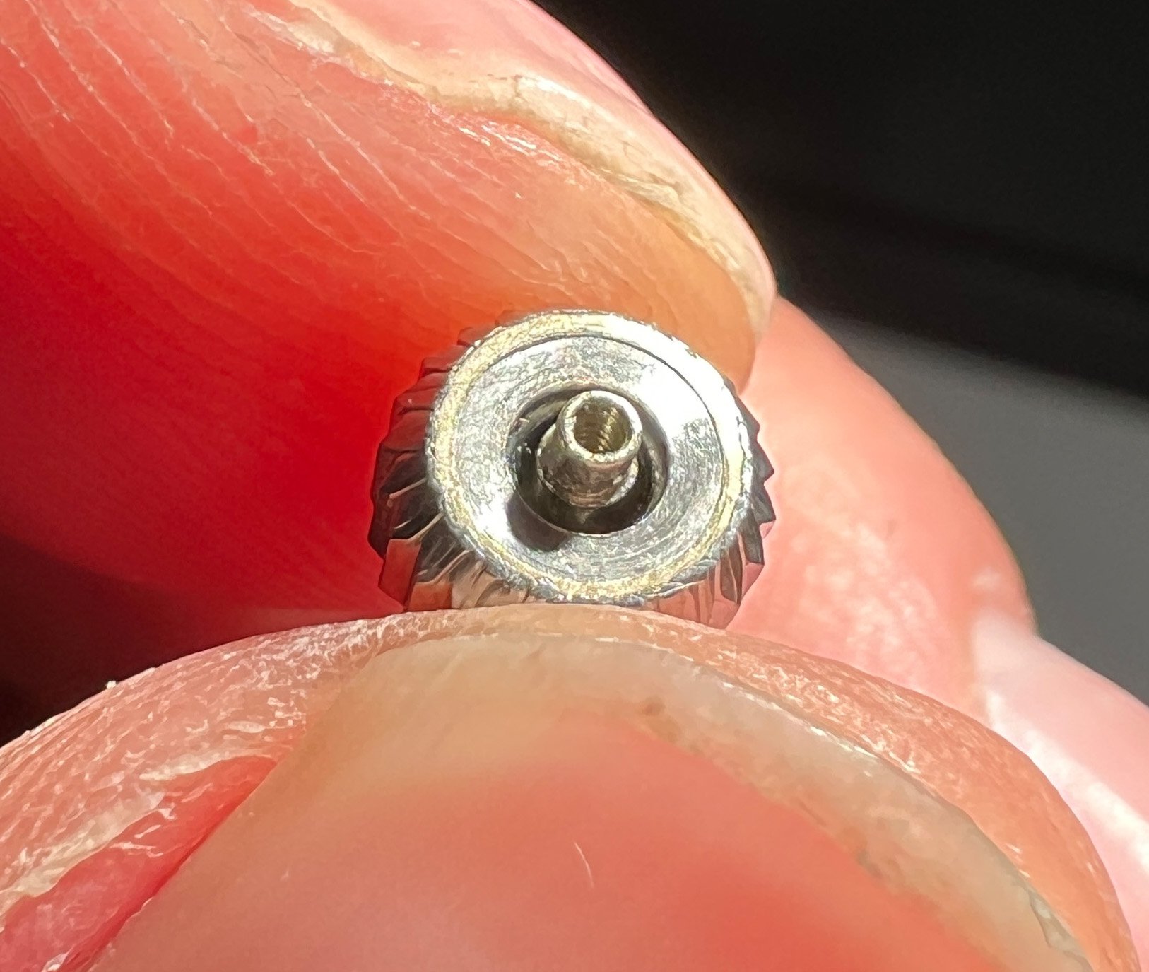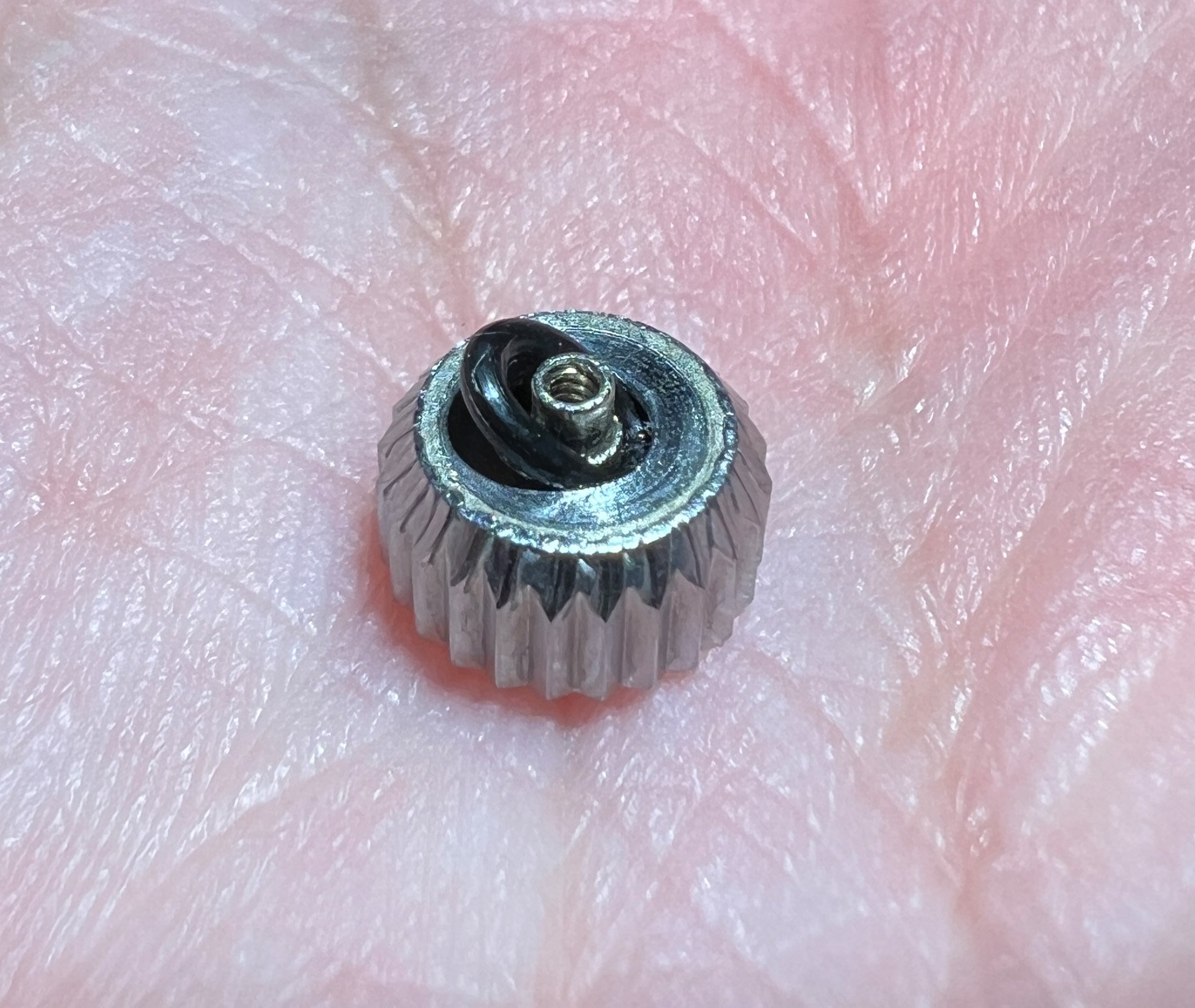 Well I've done my crown. I sprayed some wd40 into the crown and put it in a ziplock bag for five days. I dug out the gasket yesterday with a combination of a sewing pin, sharpened toothpicks, and finally an old oiler once the heavy work was done. The gasket came out in small pieces and I'm not able to be entirely sure if the WD40 contributed, except that this gasket broke up a lot easier than the rock hard Bulova Accutron 666 gasket that I did last time. I had to chip away at that one for hours.