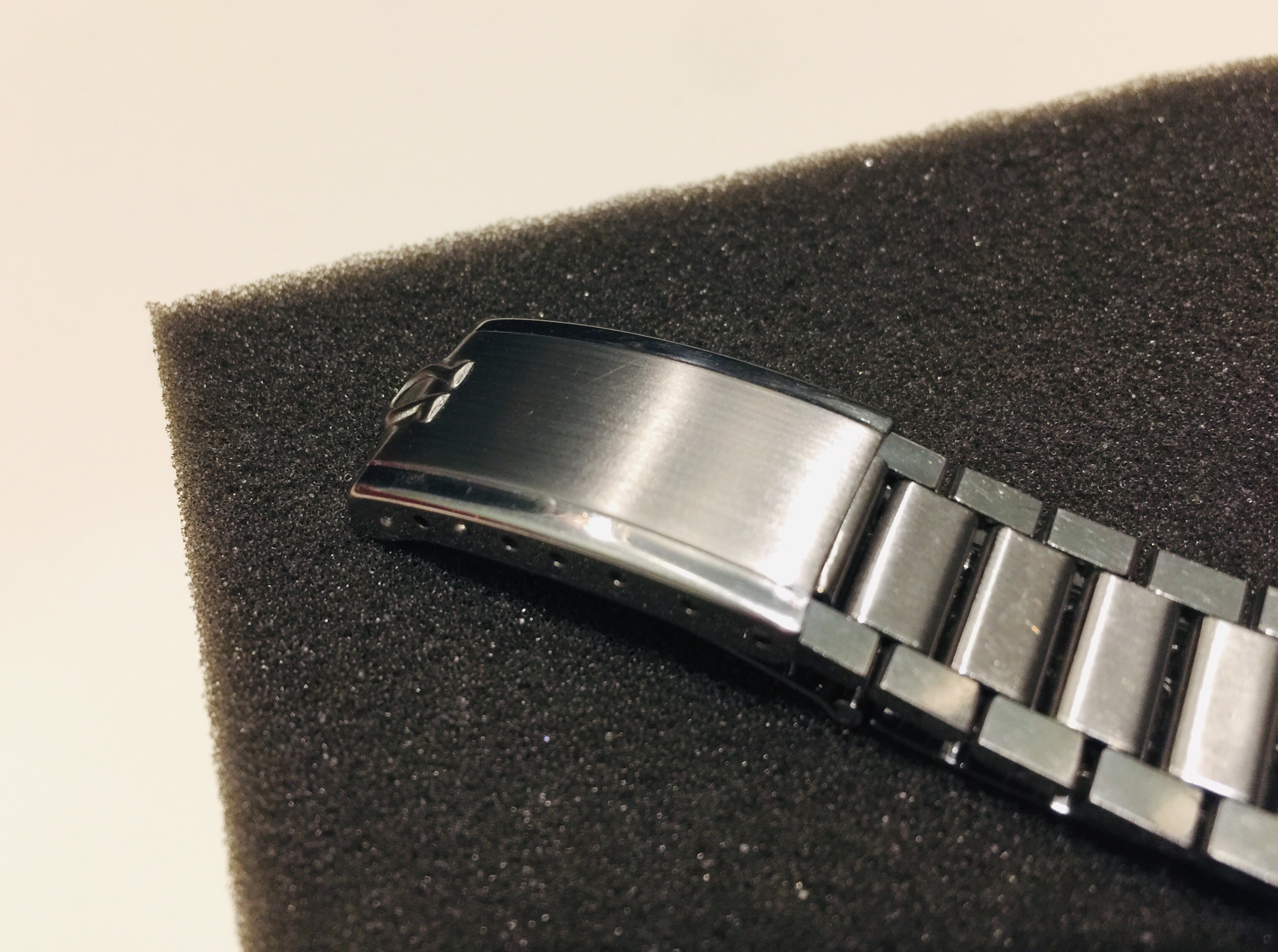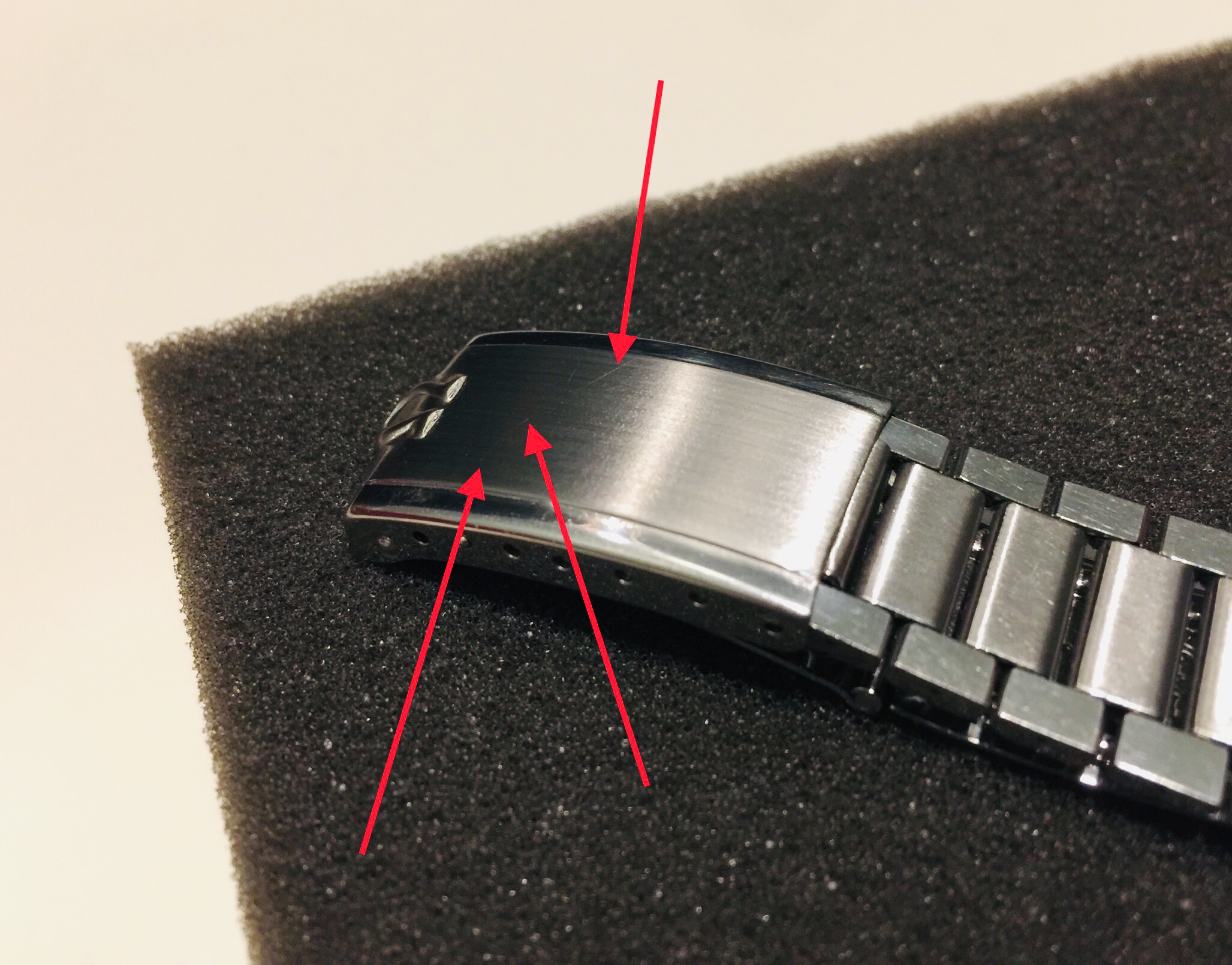 ·I tried Scotch-Brite [green] for the first time today on the scratched clasp of my 7912 bracelet. I forgot to take a “before” pic...sorry about that. Anyway, I utilized brown plastic packing tape to mask the polished surfaces and fabricated a stabilized straightedge device to obtain straight brushed lines on the clasp. I thought it went fairly well...but you can still see some remnants of the deeper scratches as indicated by the red arrows in the first pic below...