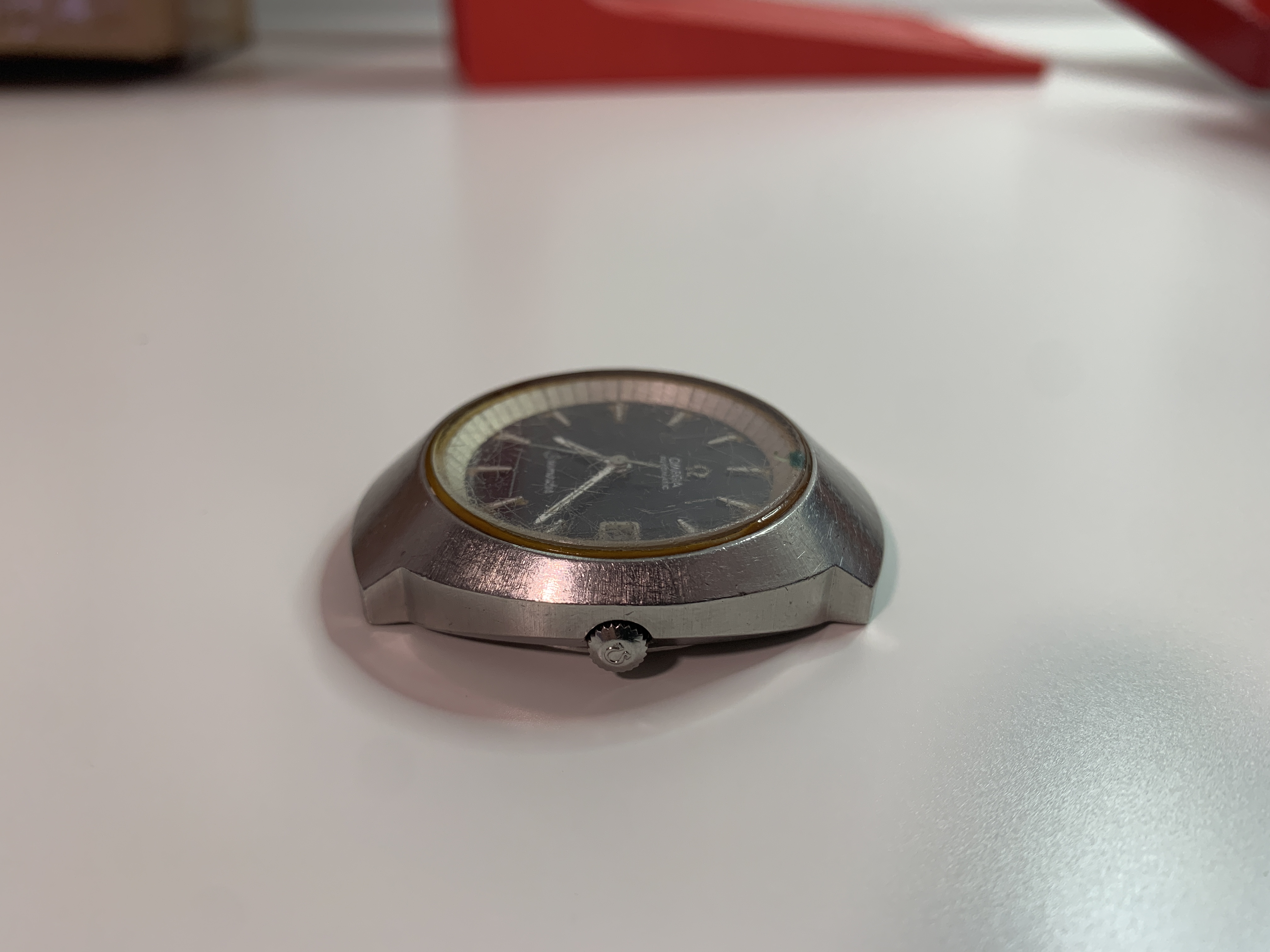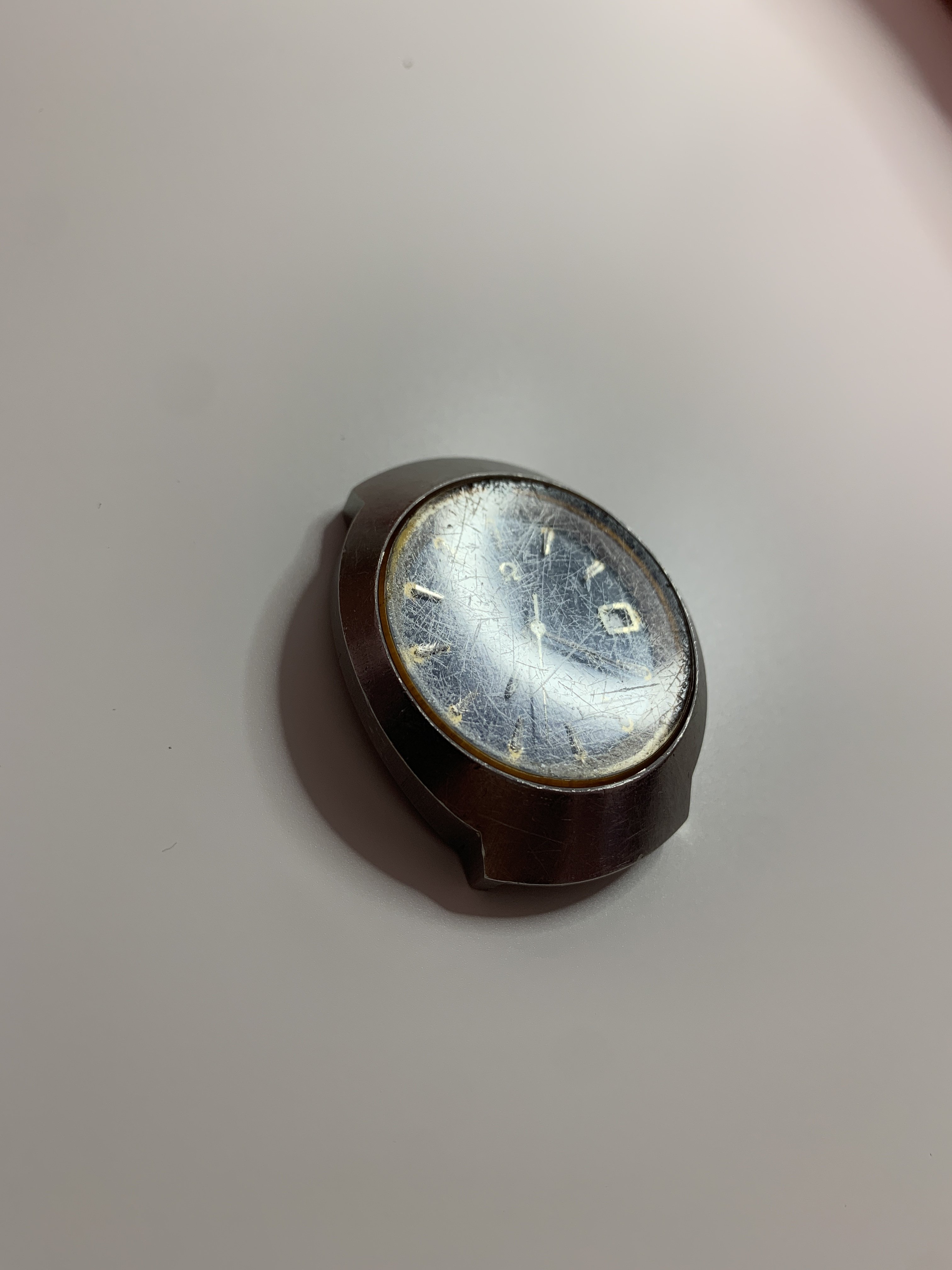 As pictured, it's got some patina, scratches to the crystal, and I can't get it running. I'm a fan of the wear and patina, but wouldn't mind the crystal to be a bit clearer. I'm thinking a service, maybe a crystal polish, and that's it? I'm unsure what the blue/green spot is.