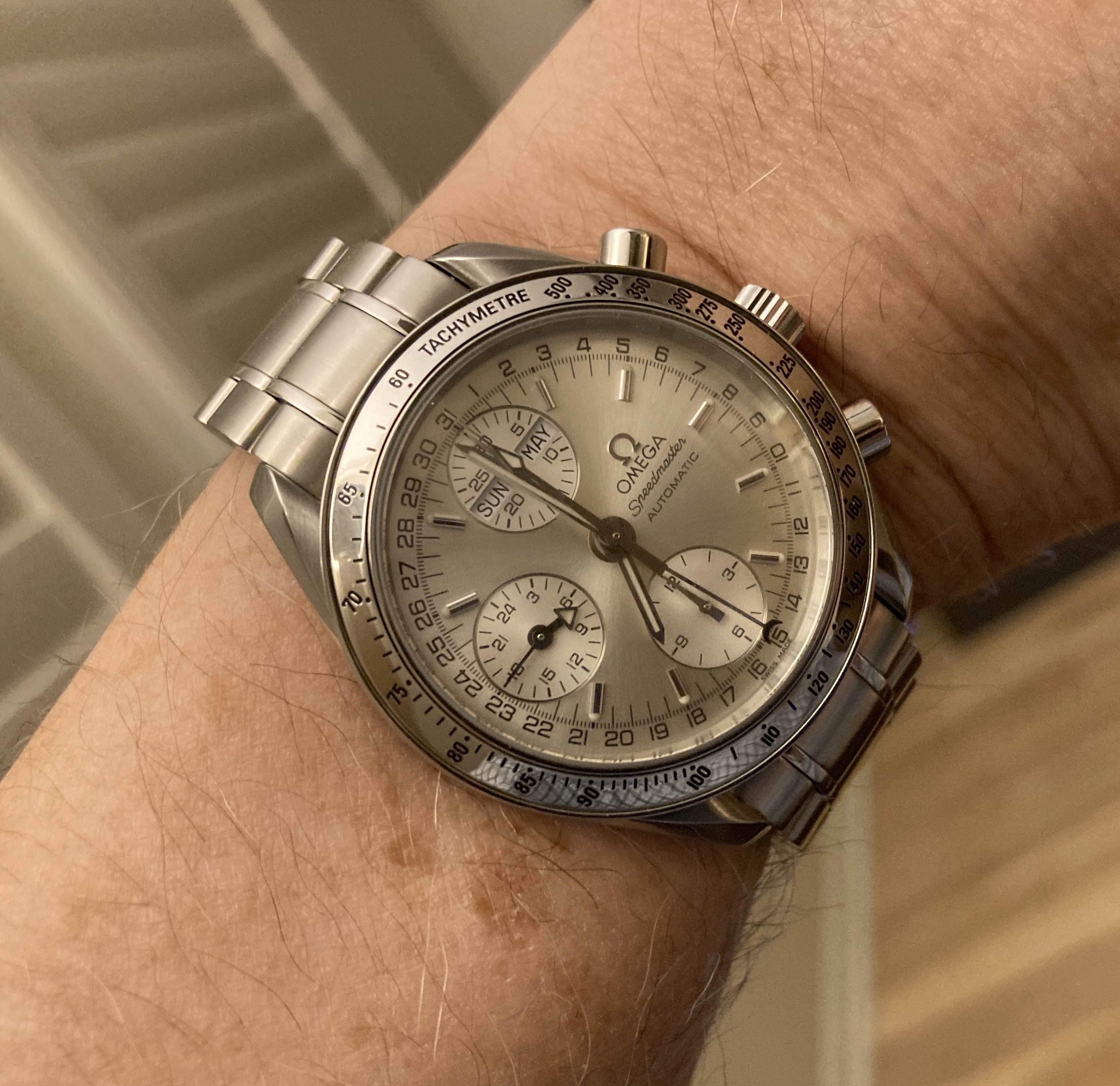 I have a silver dial Speedy Day Date (aka Triple Date), 3523.30.00, 1999 production. I love everything about the watch except for the main hands visibility. There's so much info on the dial, and the overall color scheme being largely monochromatic, it's easy for my ageing eyes to lose sight of the hands and be able to tell the time at a quick glance when on my wrist. Which is kind of job function number one, you know?