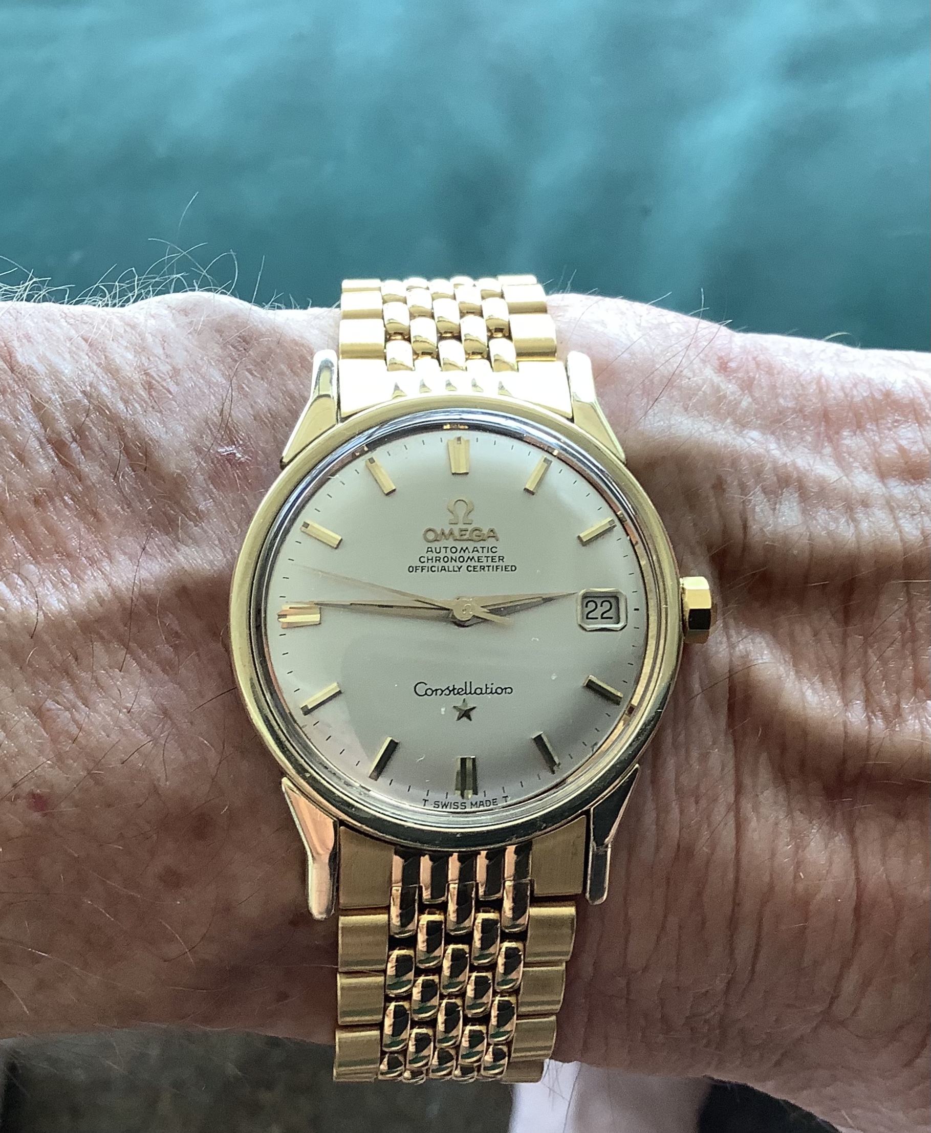 The gold tone Omega BOR bracelet arrived today. I sized it to fit my 7” wrist, and attached it to my gold tone Connie. Big difference in quality vs. the aftermarket bracelet, and the color is pretty close to the gold tone color on the case and lugs. Overall, I’m very satisfied.