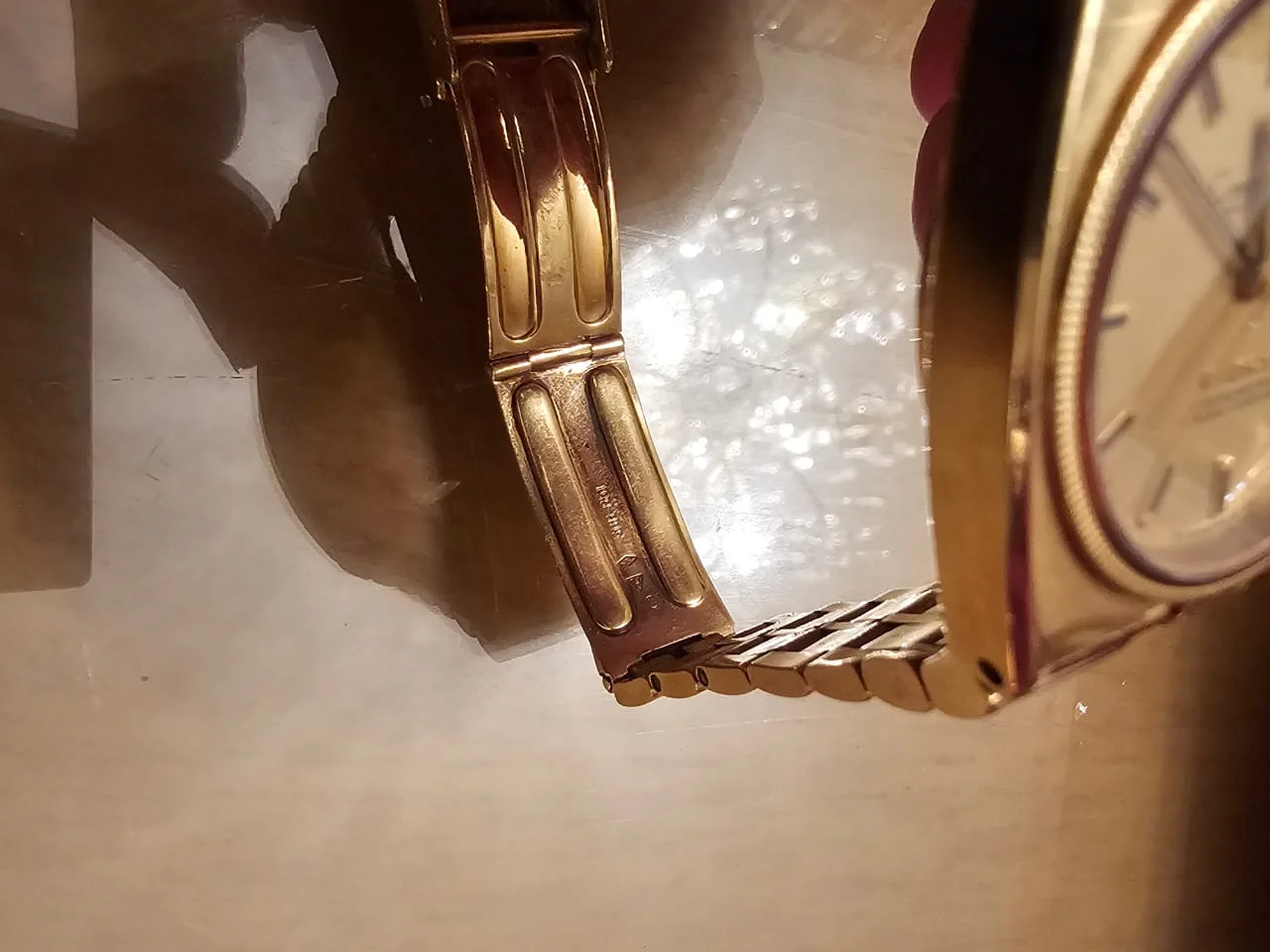 Similar style of wide, heavy bracelet. Slightly different case shape and simpler 2-hand dial (cal. 711 instead of 1001), so the head might be a bit lighter. A reasonable, honest range for total weight is ~130–145 g. Using the same “subtract ~18 g for non-gold parts” rule: