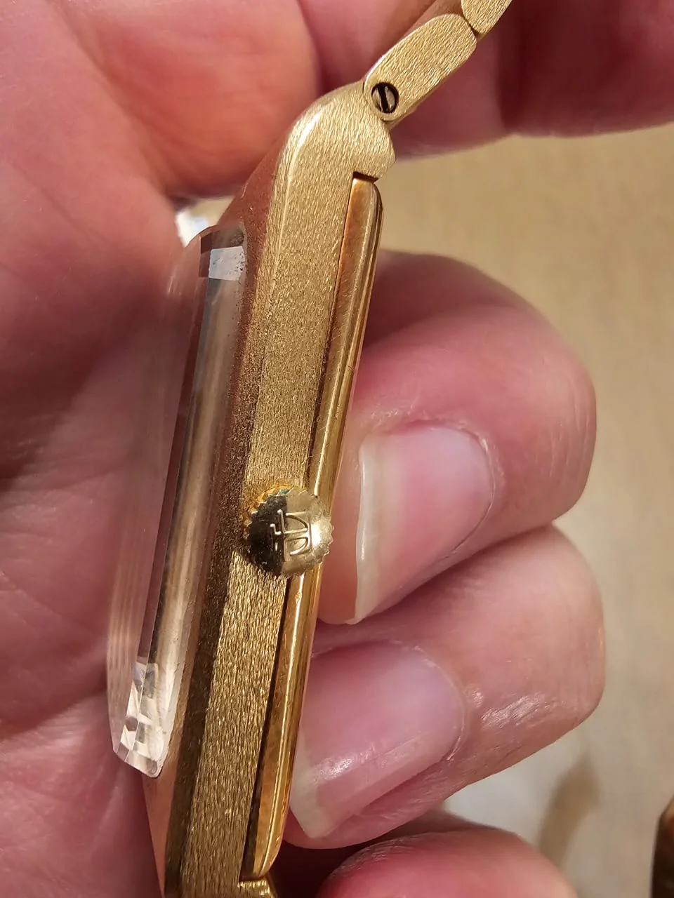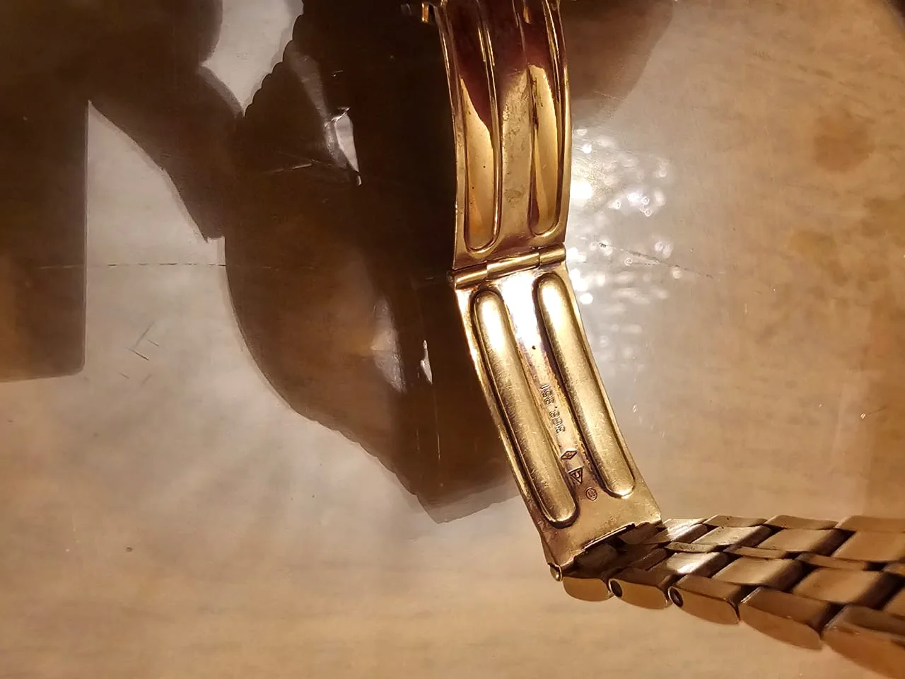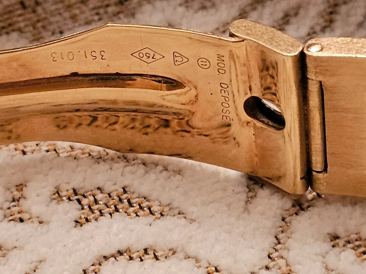 Material: case, integrated bracelet and clasp all 18k yellow gold (750) - confirmed by the stamps you see and by dealer descriptions.