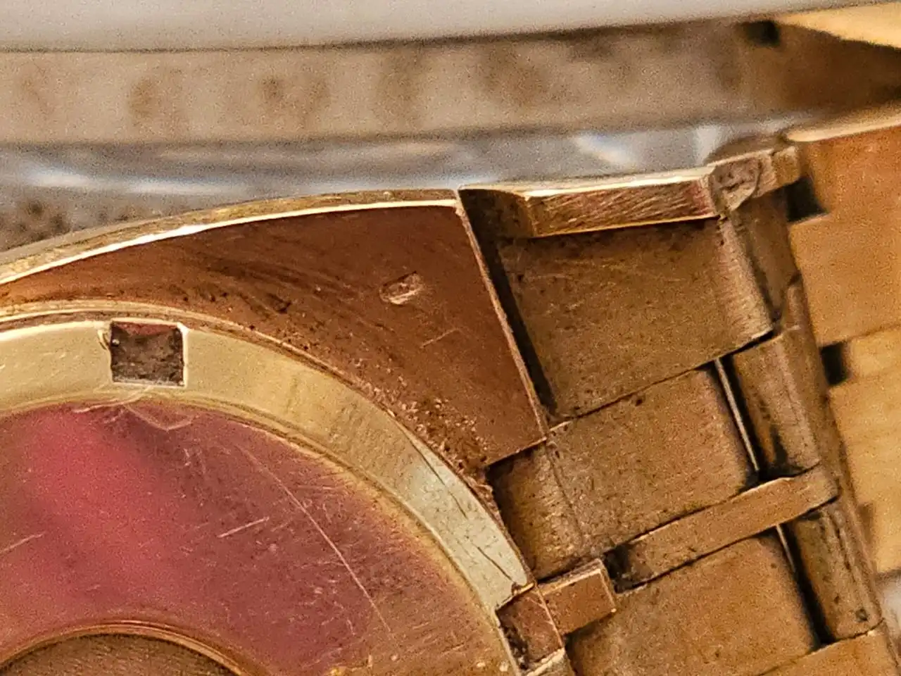Your watch shows honest wear: surface scratches, aged dial, unknown service history, but appears original and on its full-length bracelet. Taking all that into account and current very high gold prices: