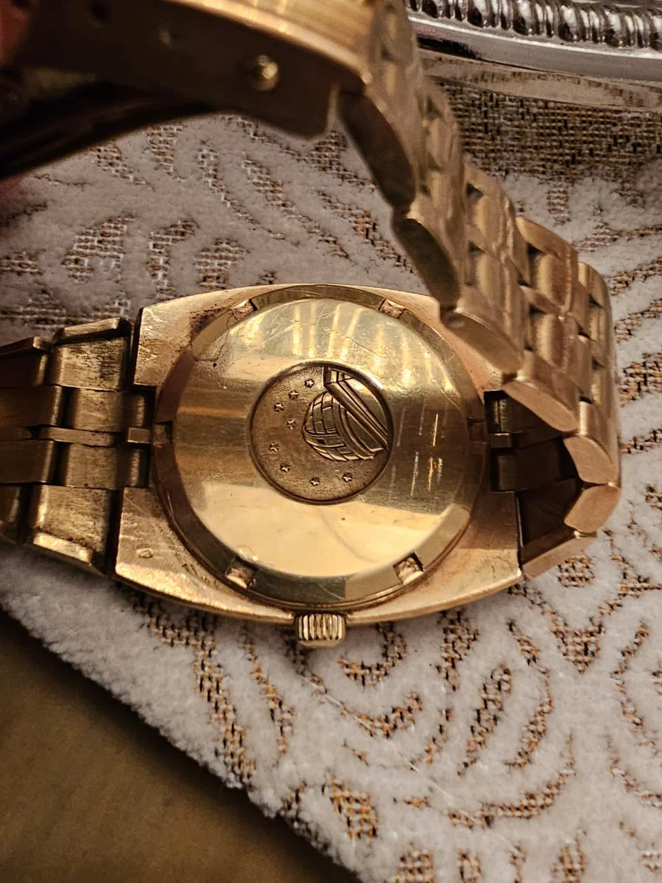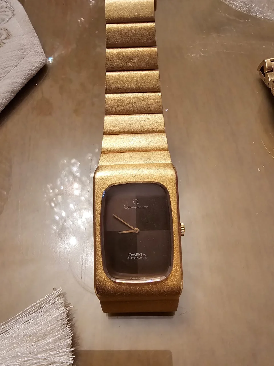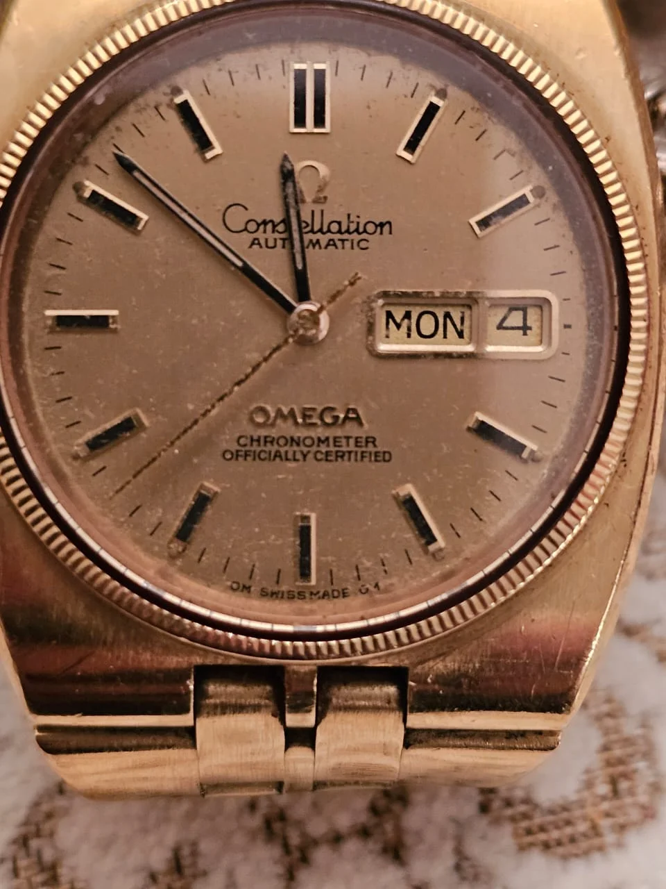 Material: all 18k yellow gold - case + bracelet, and very likely gold dial (“OM SWISS MADE” at 6 o’clock usually indicates a solid gold dial)