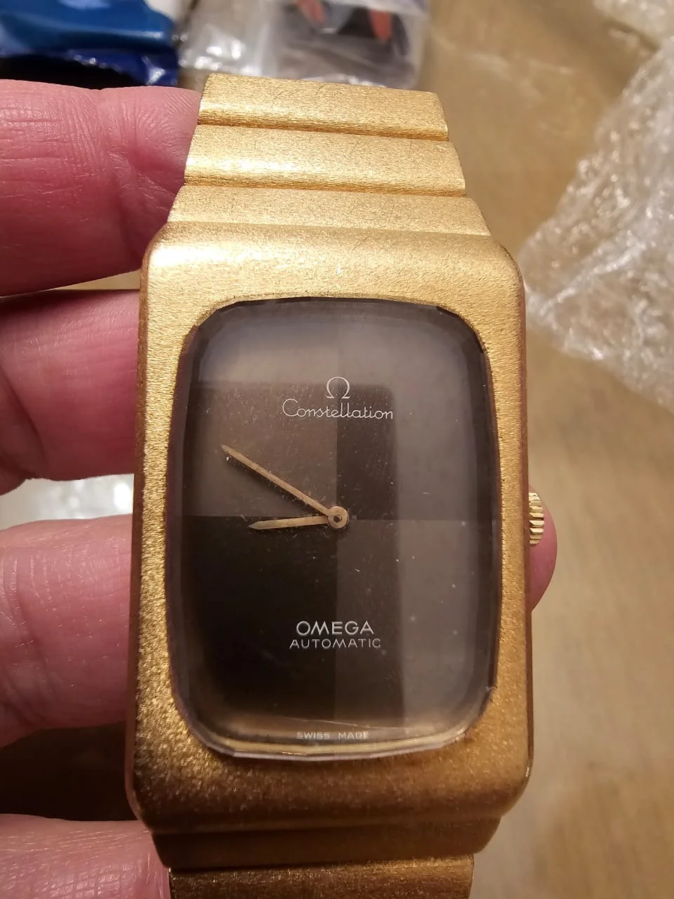Omega Constellation automatic, two-hand (no seconds), rectangular / TV-shaped case, integrated bracelet.