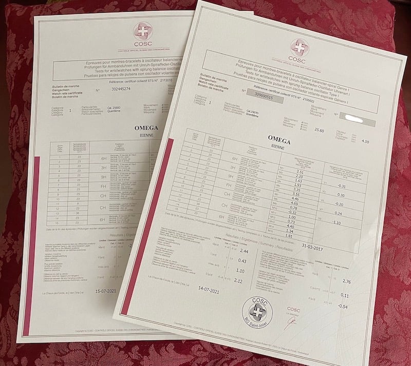 They requested photos of the 2 International Warranty Cards (which had to be fully completed) and once received they very quickly confirmed that the 2 Certificates were available at the Official Swiss Chronometer Testing Institute (COSC) in Switzerland.