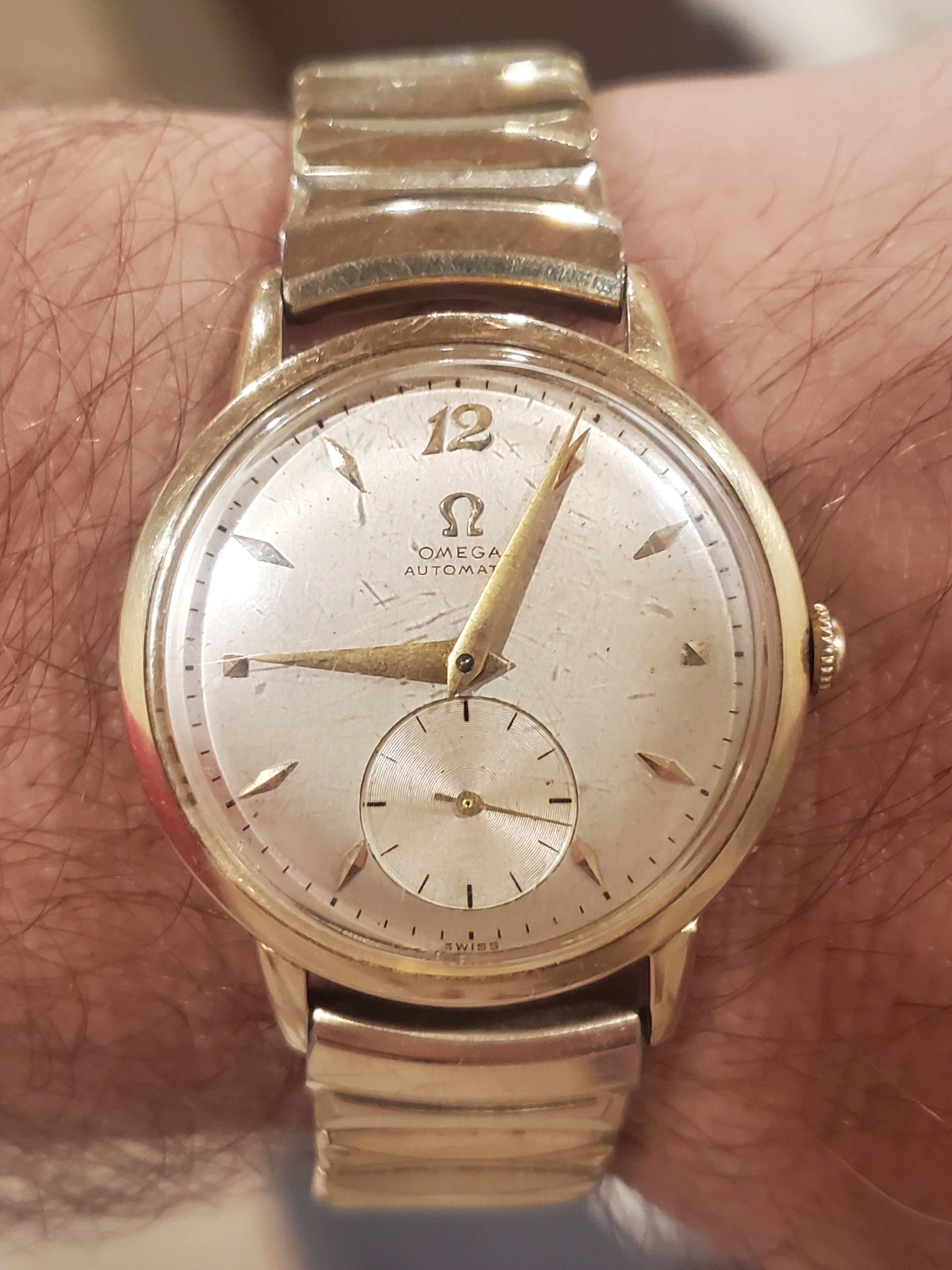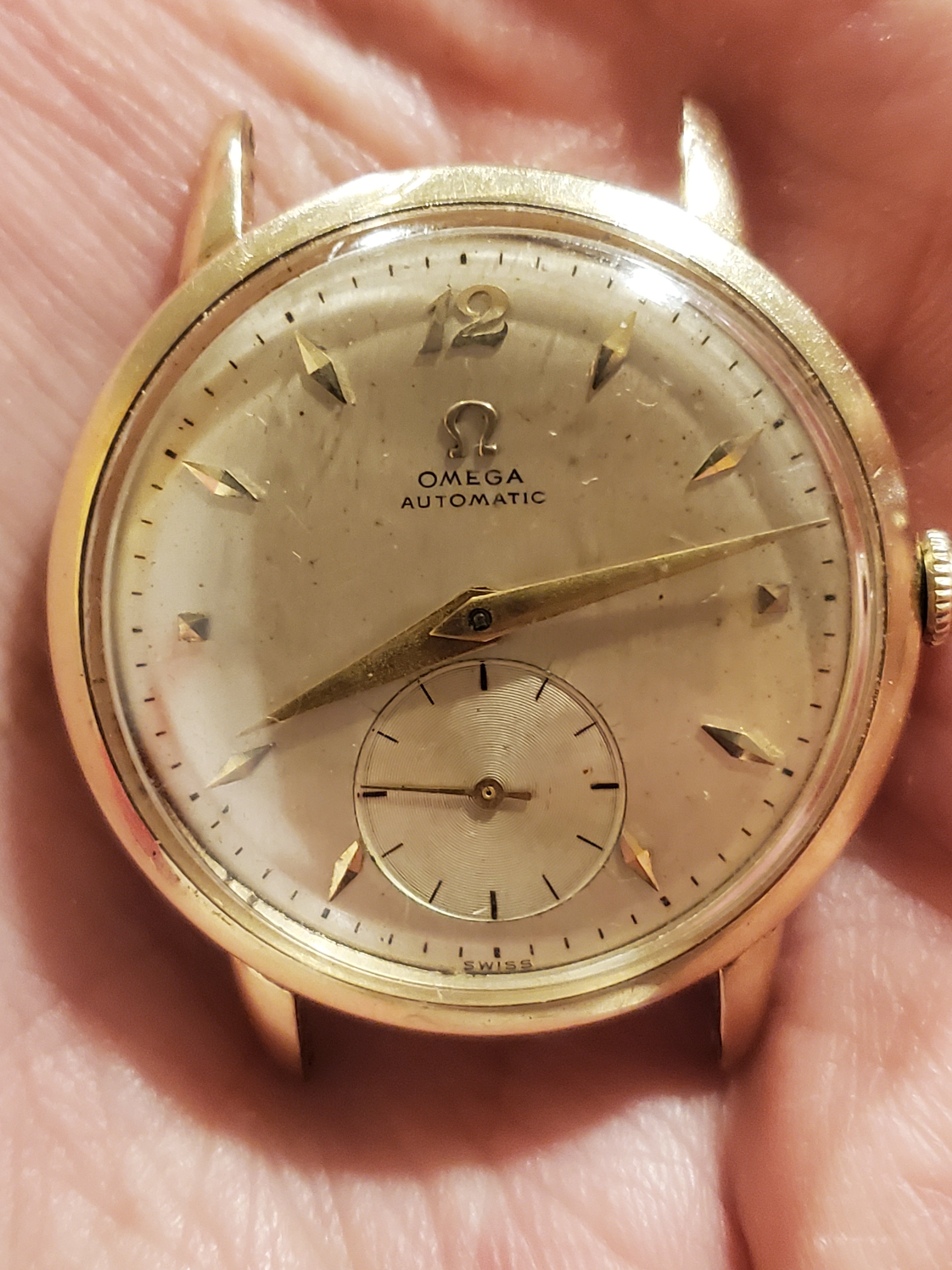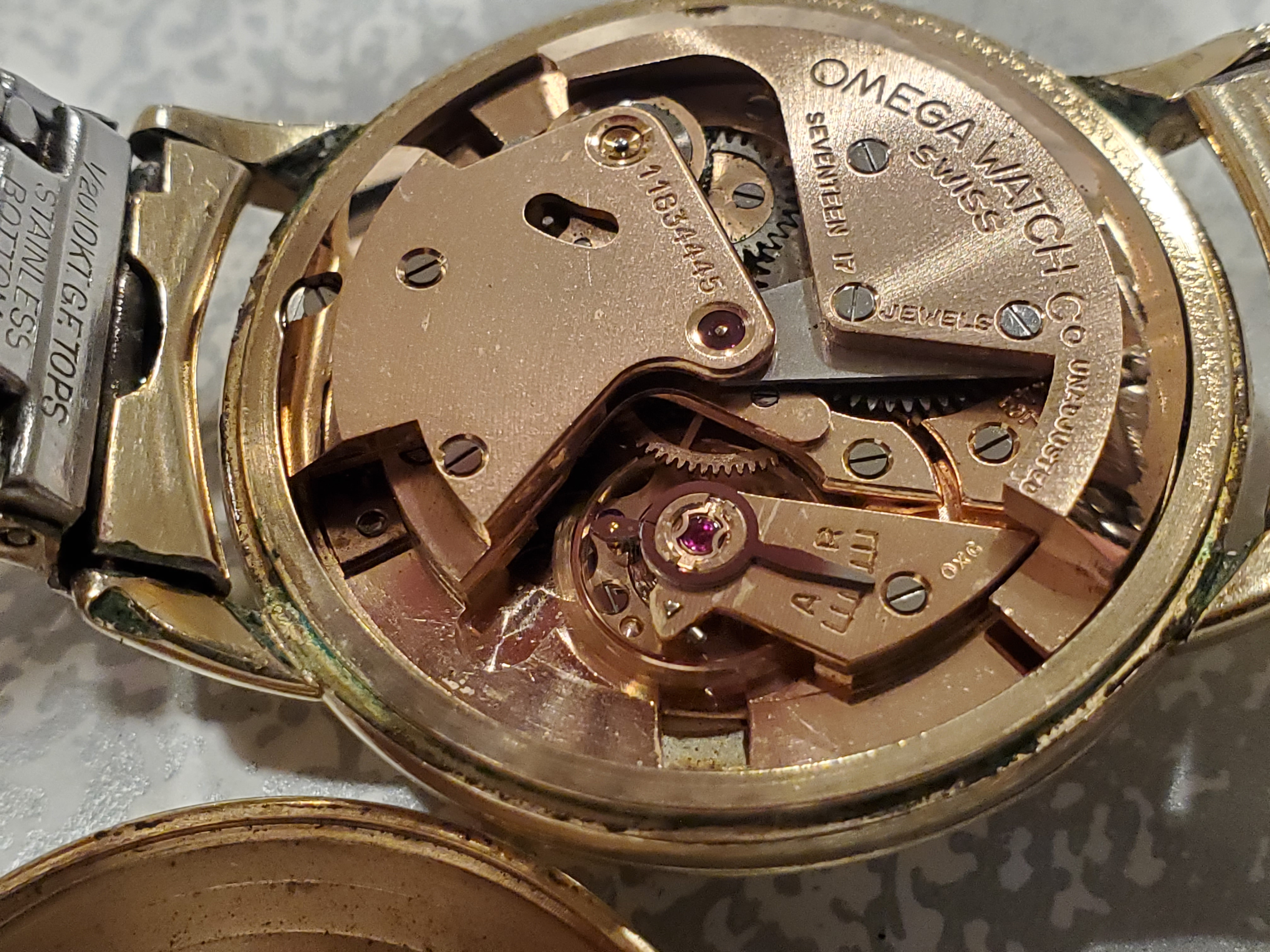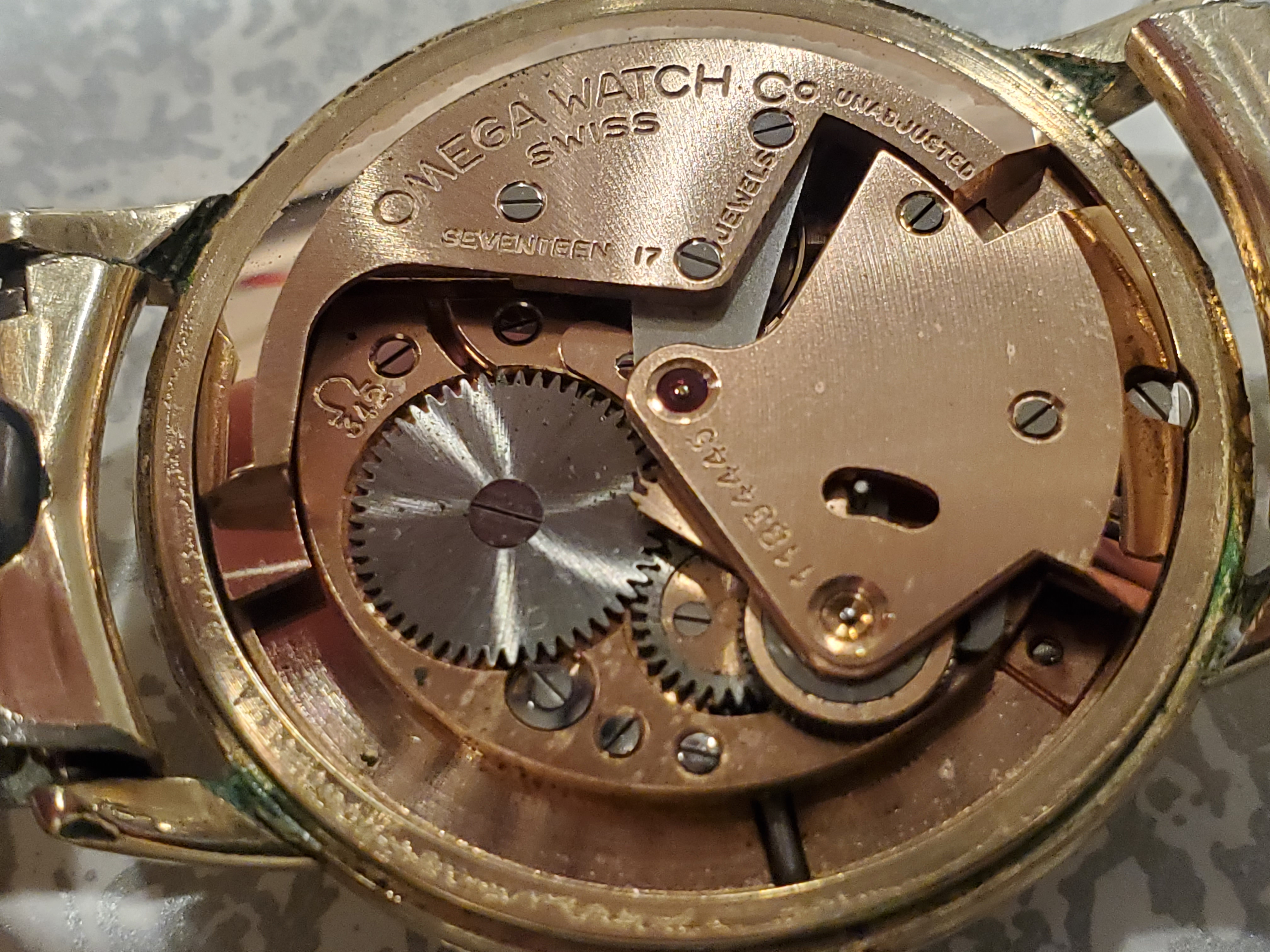 The movement is cal 342 and appears to be in good shape aside from some dirt (or maybe debris from a worn out gasket?). It needs to be serviced before use. The serial number, 11..., indicates that it was made in 1946 (even though Omega's website lists the start date for the case as 1952 https://www.omegawatches.com/watch-...h=655e7946fec05e434c1fb17caabddf8d&no_cache=1).