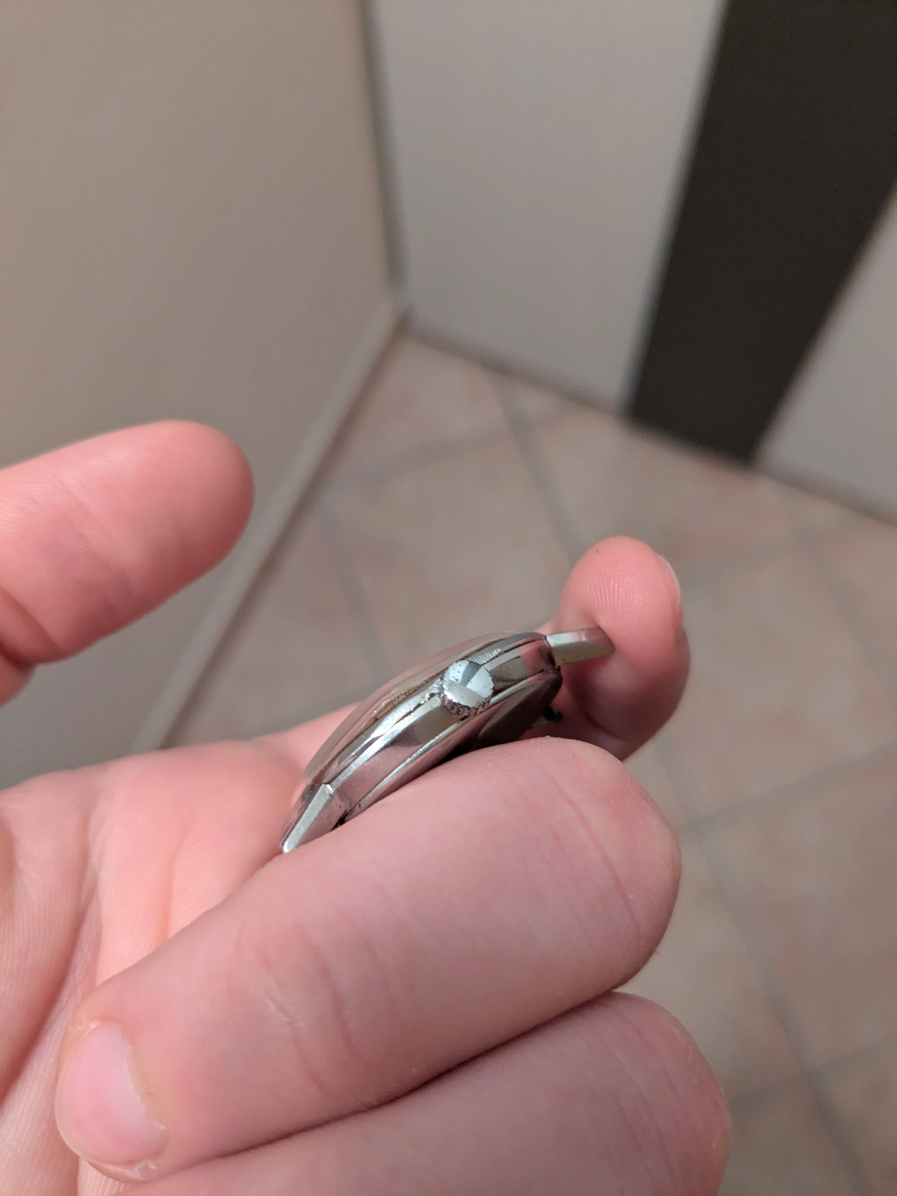 ·Hi everyone, on Christmas Eve, I unexpectedly received this watch after asking my father about any family heirlooms. It works, charges, and has a limit switch, but after charging, it takes a few seconds to restart. It has damage on the crown side, affecting the plexiglass (which seems non-original) and the case. The crown may also be a replacement.