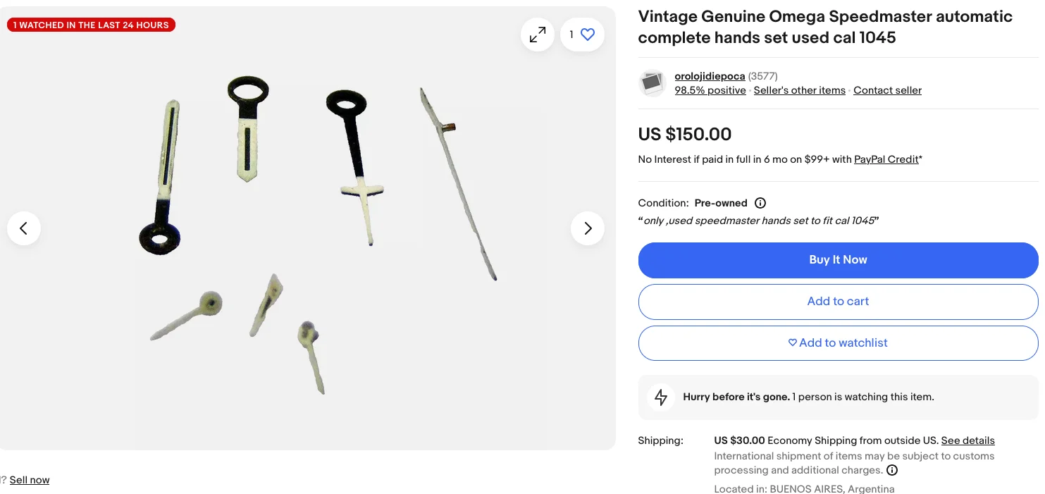 I have paid in the 30s for three hander hands. With job lots all bets are off. Sometimes there is a loose hand here and there. The Omega stuff does not show up in job lots much. Those are mostly landeron, Valjoux and Venus in that order. Lemania, is often pure unobtanium. I have been looking for a 105 hour hand for 3 years or is it thirty? Sometimes Tissot works as an alternitive, although it looks like there were efforts to keept the designs separate.