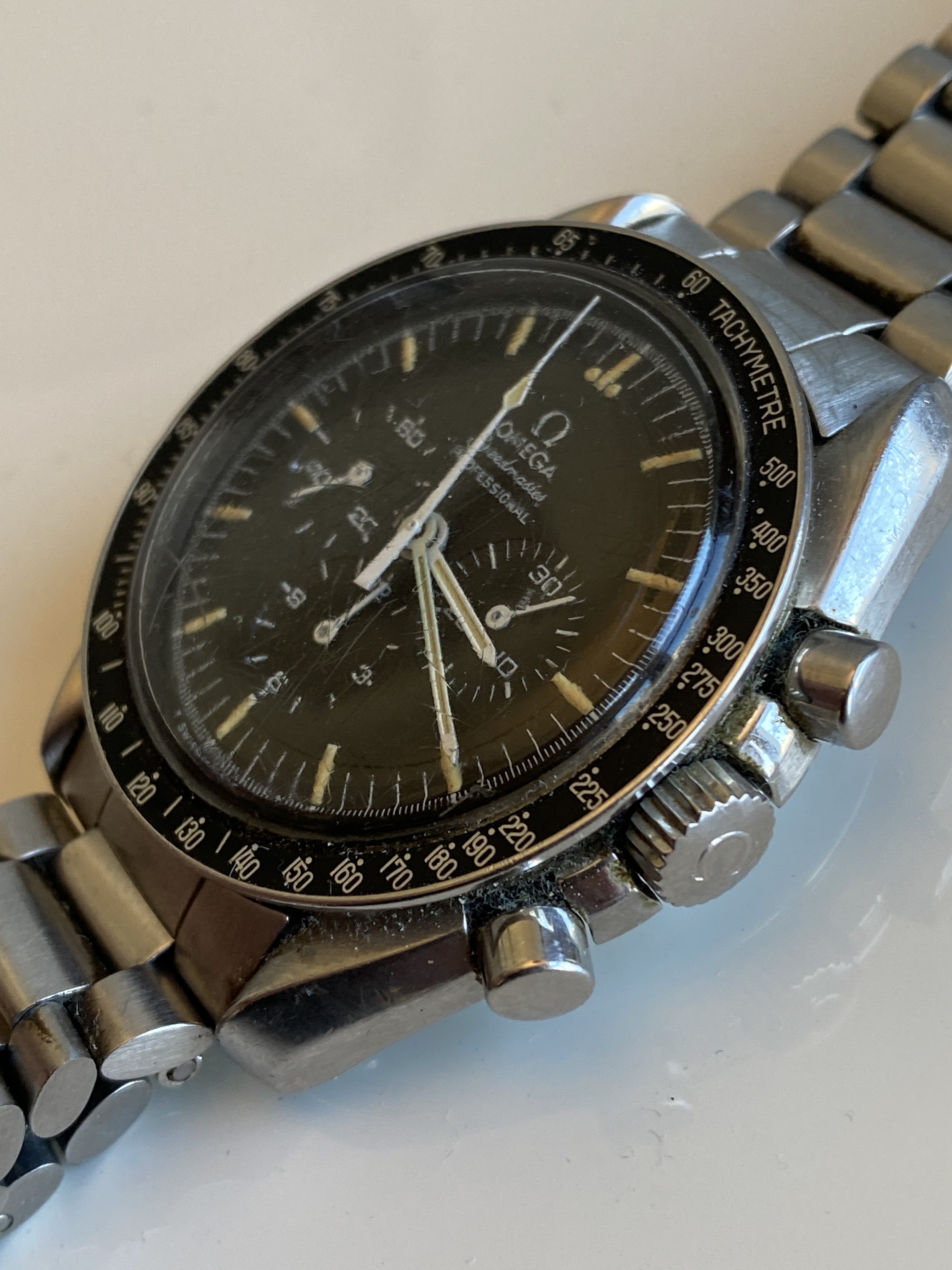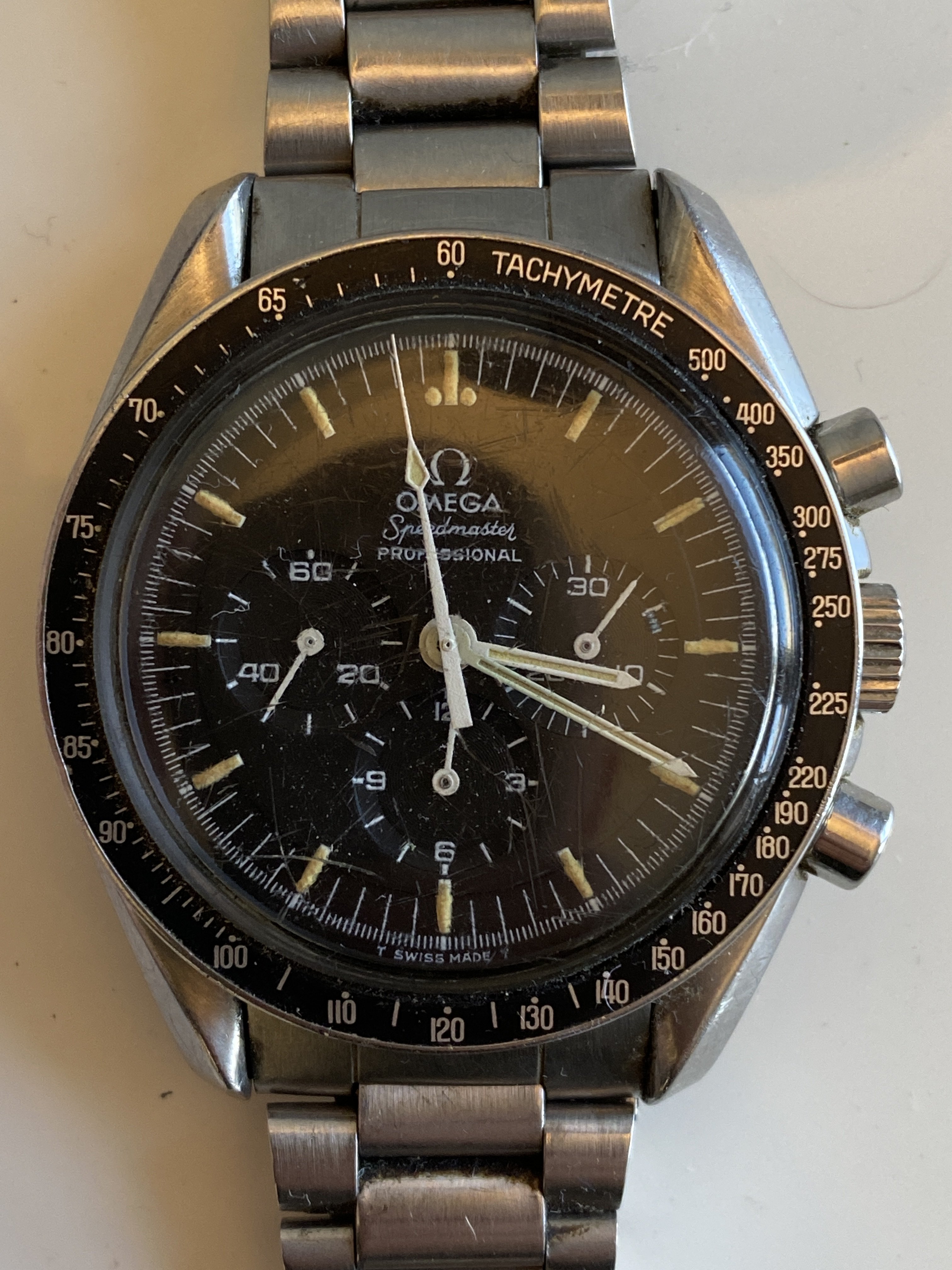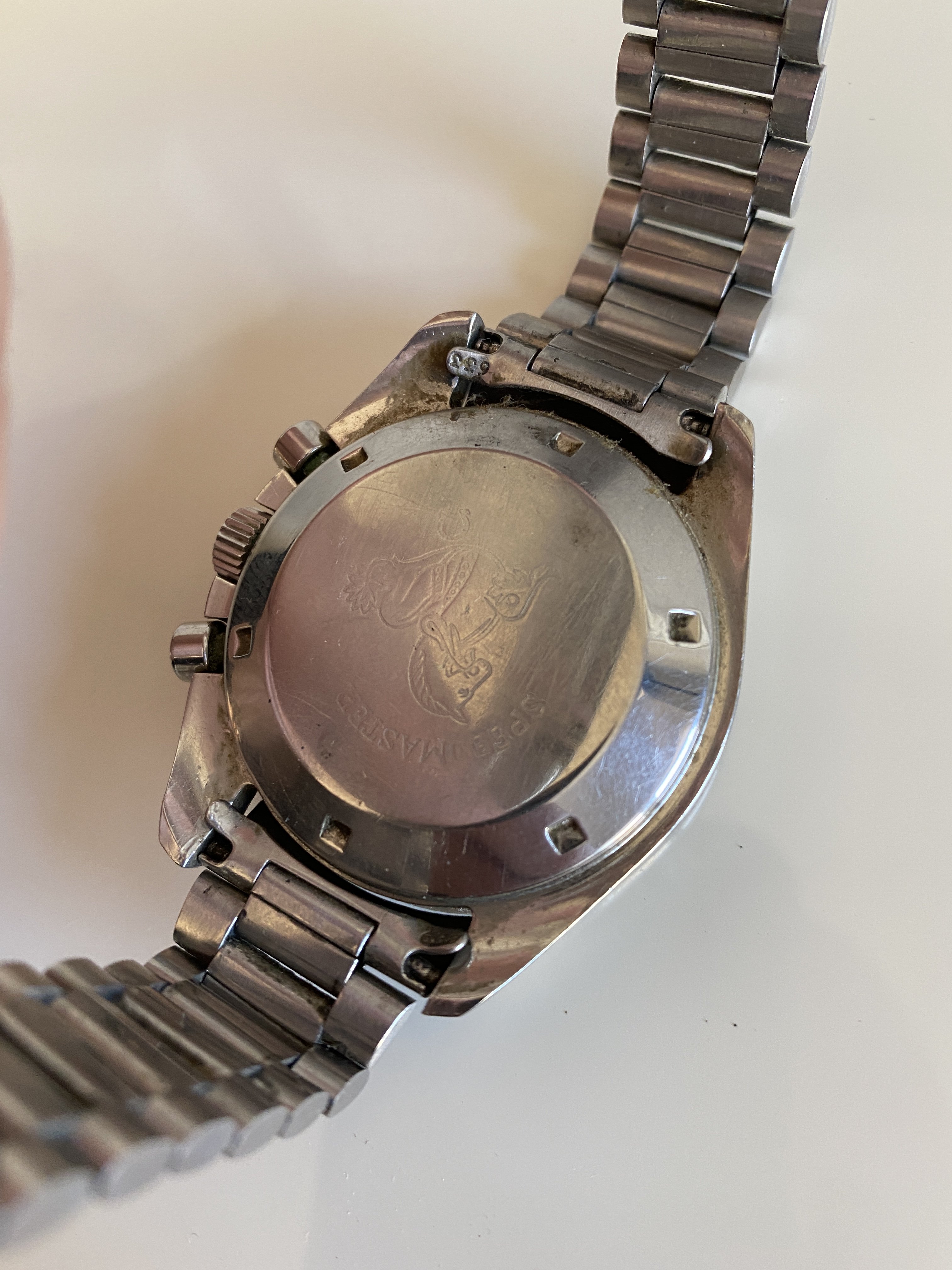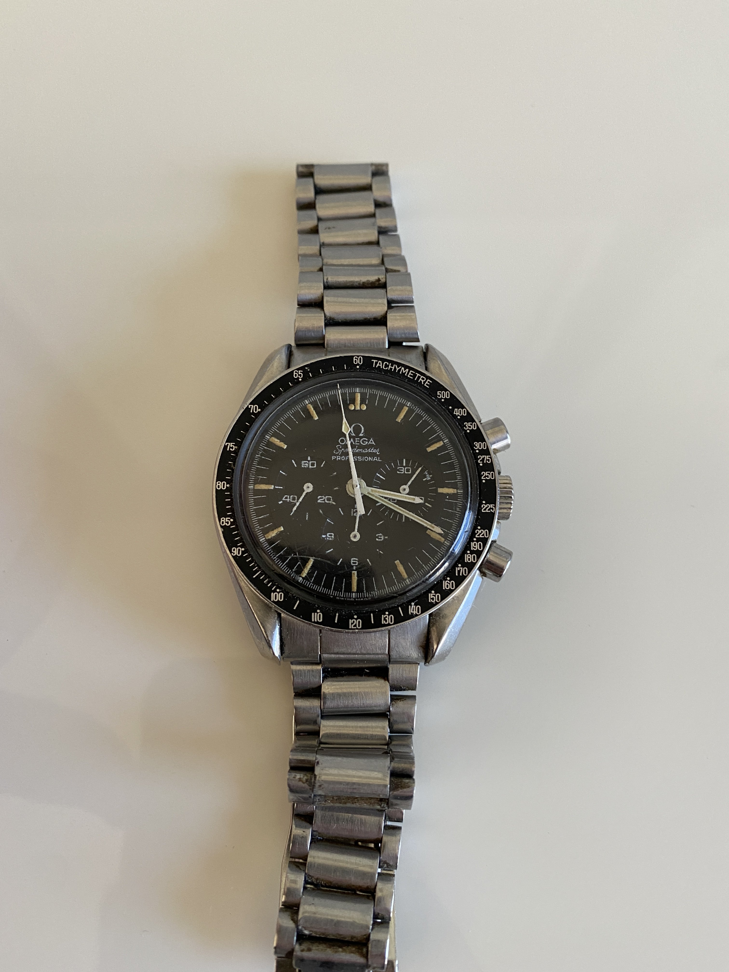 ·I thought I'd share some pics of my father's vintage Speedmaster that I've just sent off for restoration to a watchmaker I found recommended on this forum. This was given to him by his grandmother in the mid-60s, which would have been quite an expensive gift for her means at that time. We'll see what opening it reveals but it should be unadulterated, other than the movement having been replaced under warranty by Omega some time in the 70s due to water incursion and the original clasp being replaced with an unmarked one. Other than that history, I don't know much about it yet. Whatever the result it will be an heirloom I'll wear with pleasure.