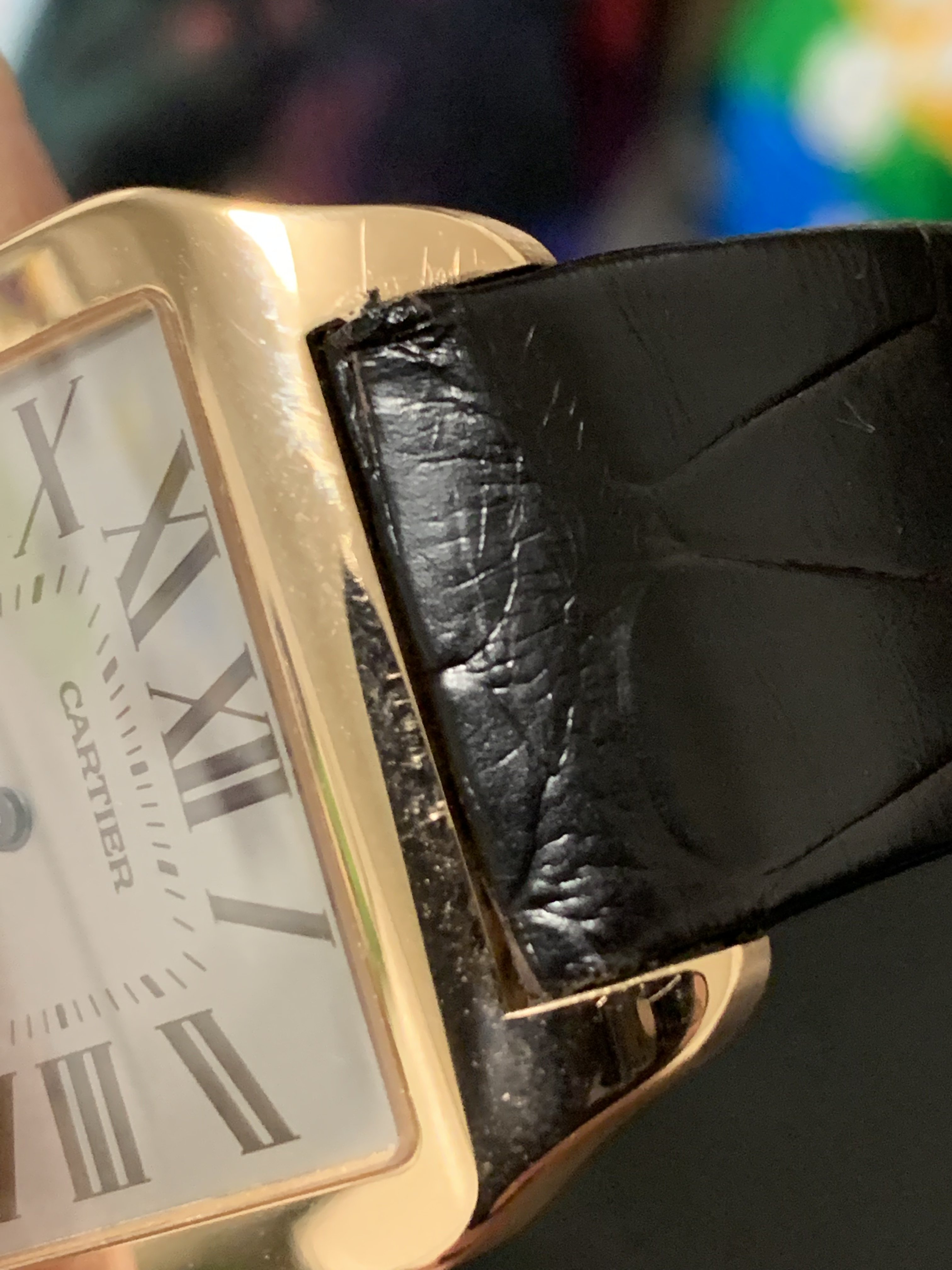 ·I ended up getting my Santos Dumont a full service from my local Cartier boutique. I was fine with the polishing because it’s a dress watch for me and I’d rather it look nice than “vintage”. I also splurged for a new strap even though I could have gotten a custom one for less money. They shipped it to me for free so I didn’t bother to pick it up at the store. However when I got it back today I saw some noticeable scratches at the front lugs where somebody tried to squeeze in a new strap. It almost looks like the strap they installed is 1-2mm too big. I’m sure they’ll offer to repolish it but extra polishing on one lug isn’t what I was aiming for