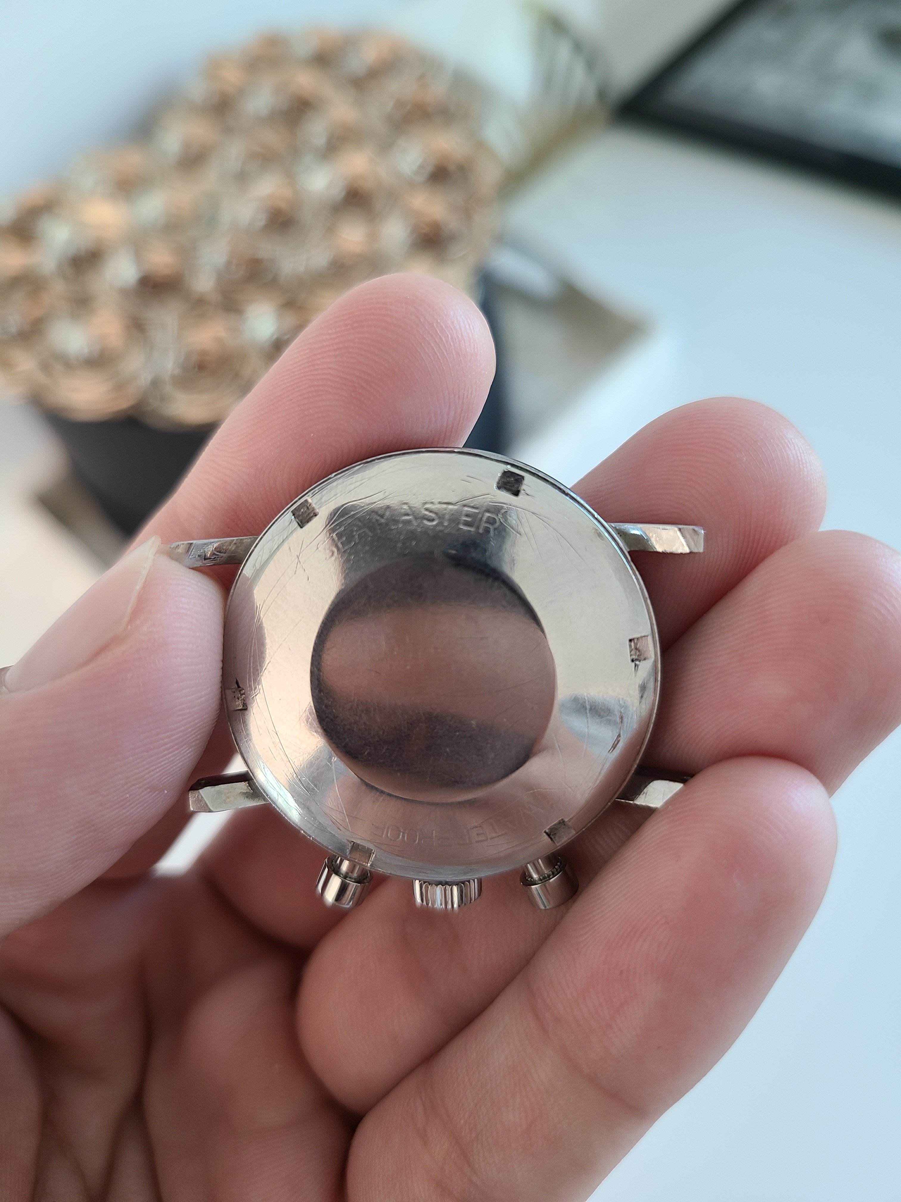 This is a pretty uncommon watch. I have only seen a handful of them online. Nice reverse panda dial driven by the legendary cal 321. There are some lume loss on the dial and some tool marks on the back from someone trying to open it.