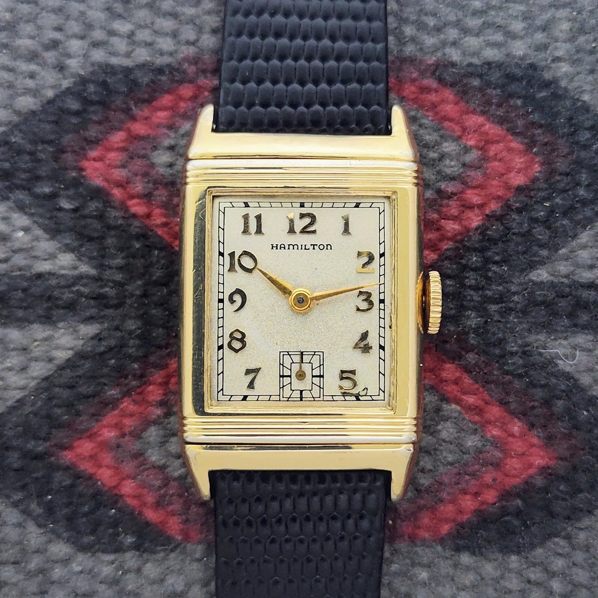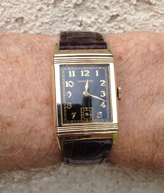 One caught my eye as it had an early, well preserved, black dial stamped “Reverso”.