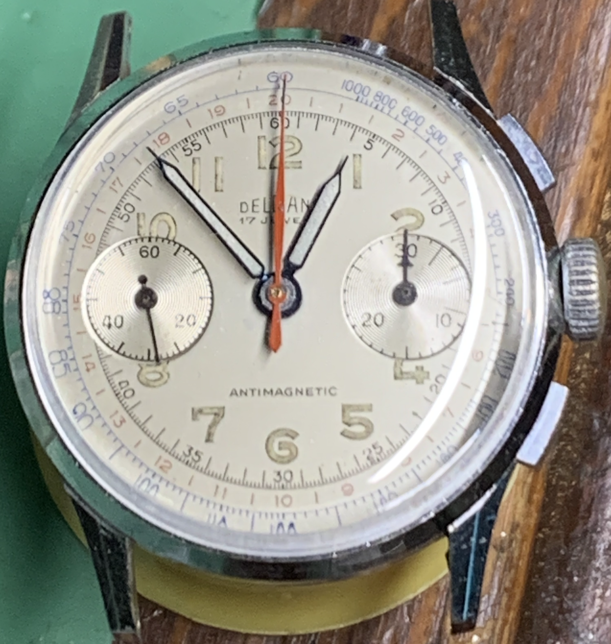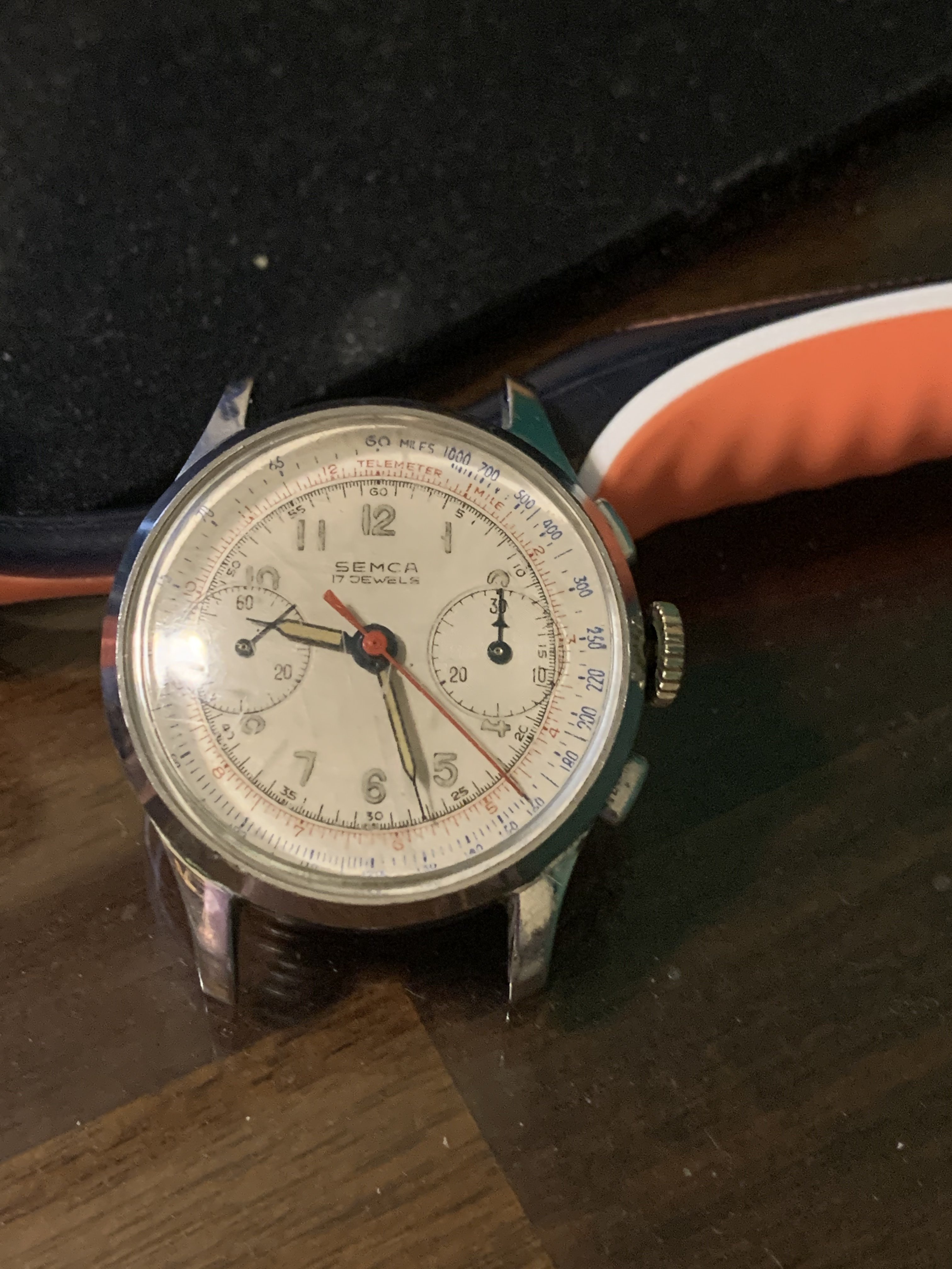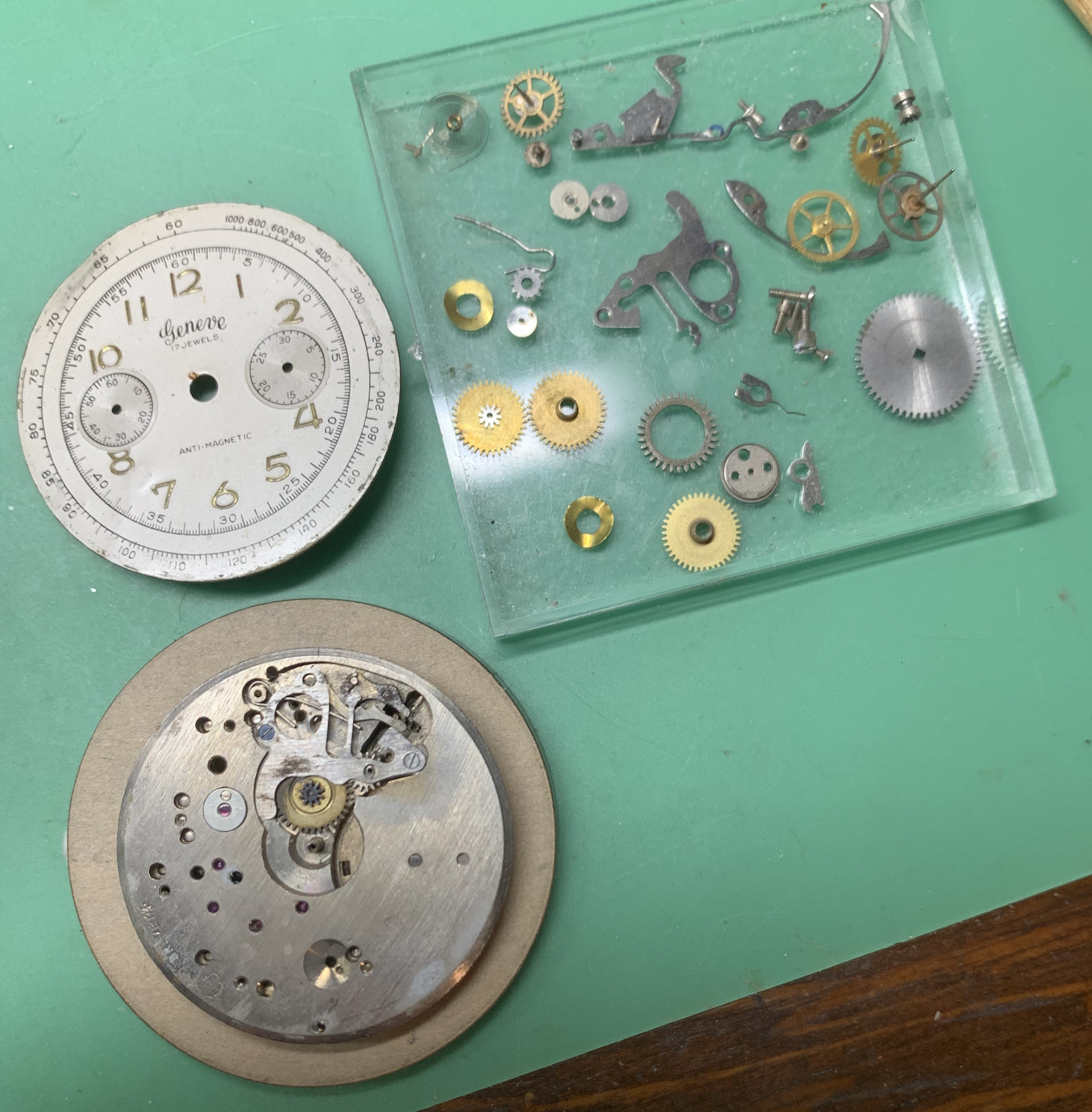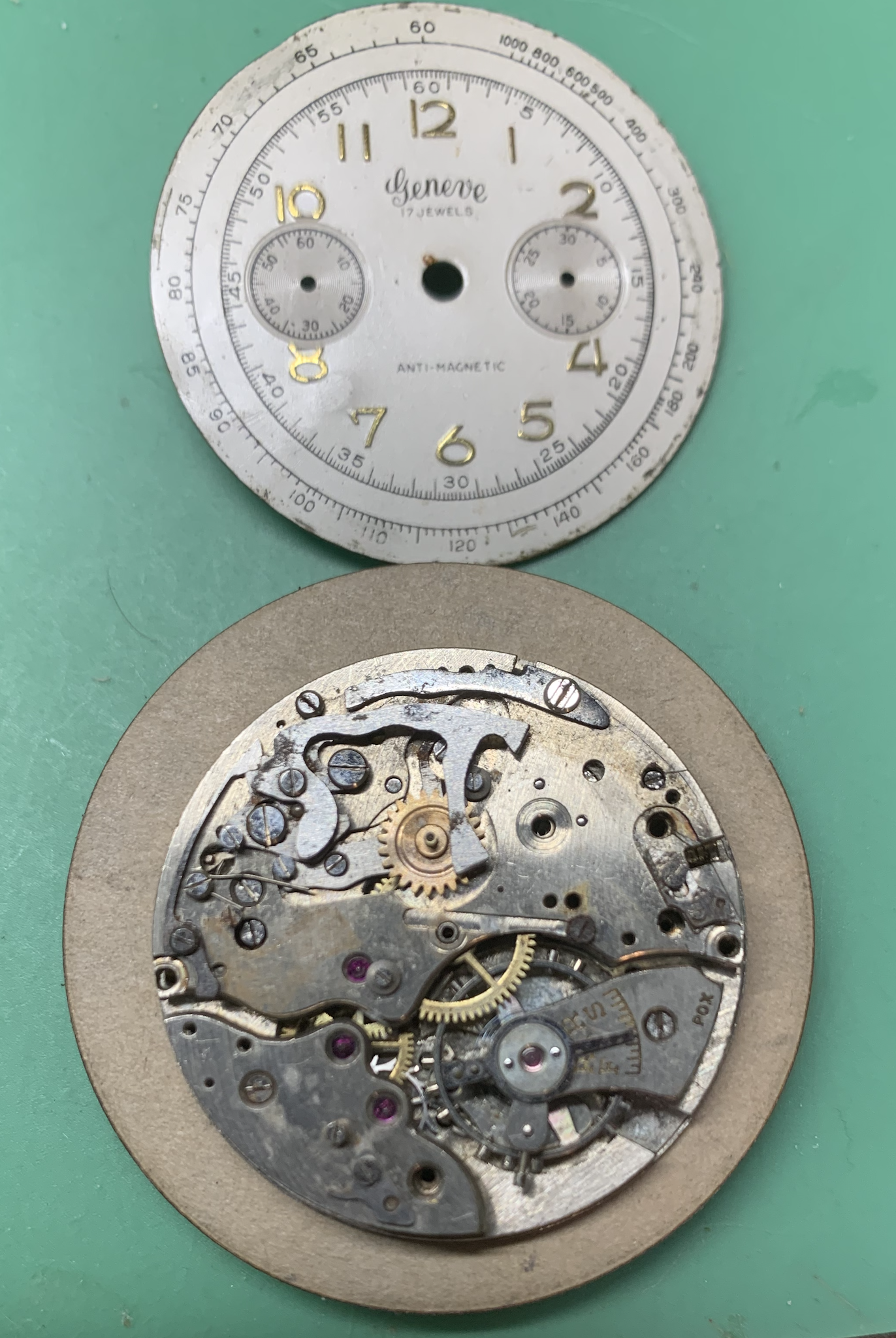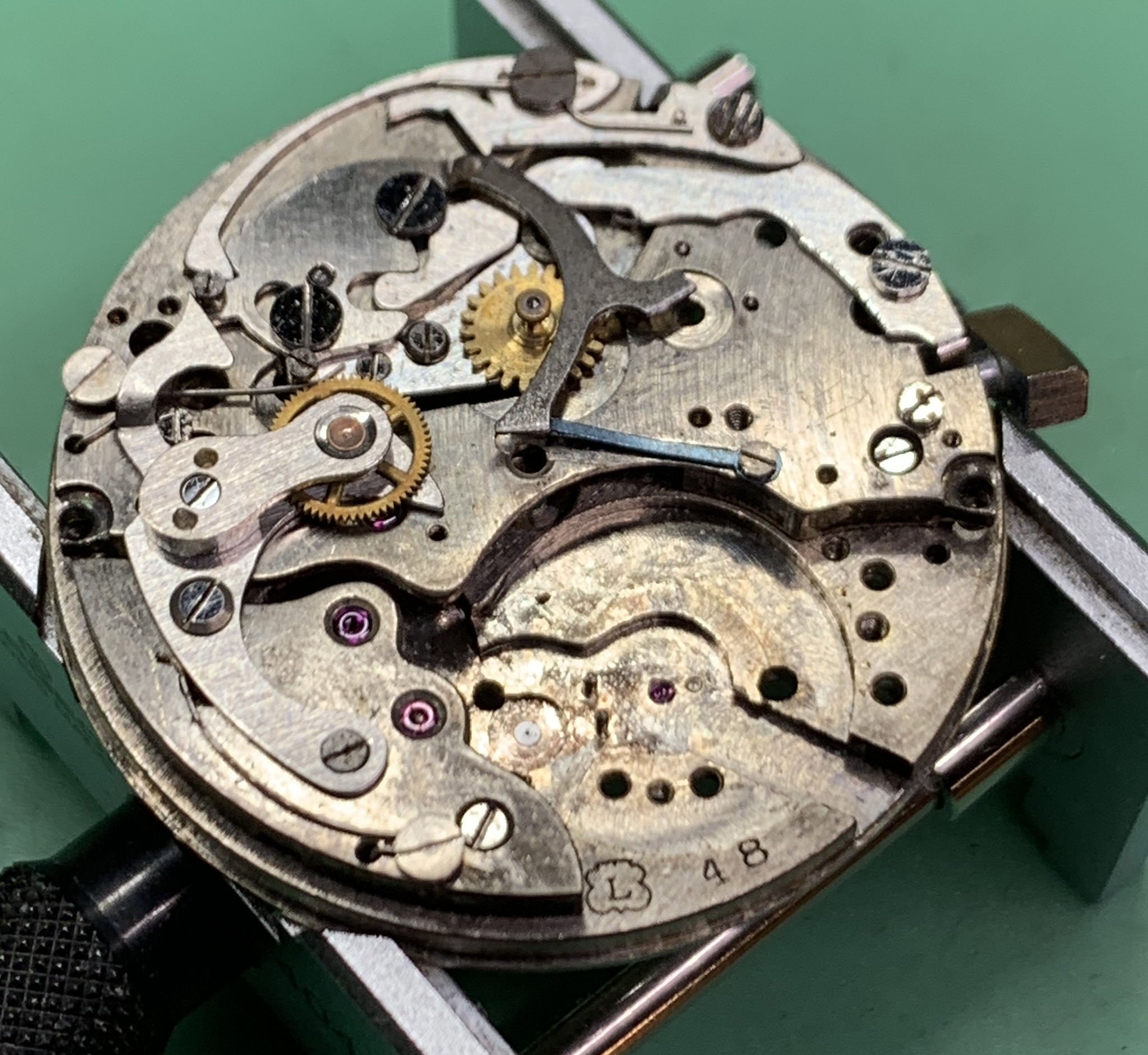 Here again, below, is the before photo of the watch which started this trip down the rabbit hole. This also is a mix of landeron parts. One which was mostly assembled was a Timecraft which has it's own thread. https://omegaforums.net/threads/on-the-bench-landeron-48.149921/#post-2046401