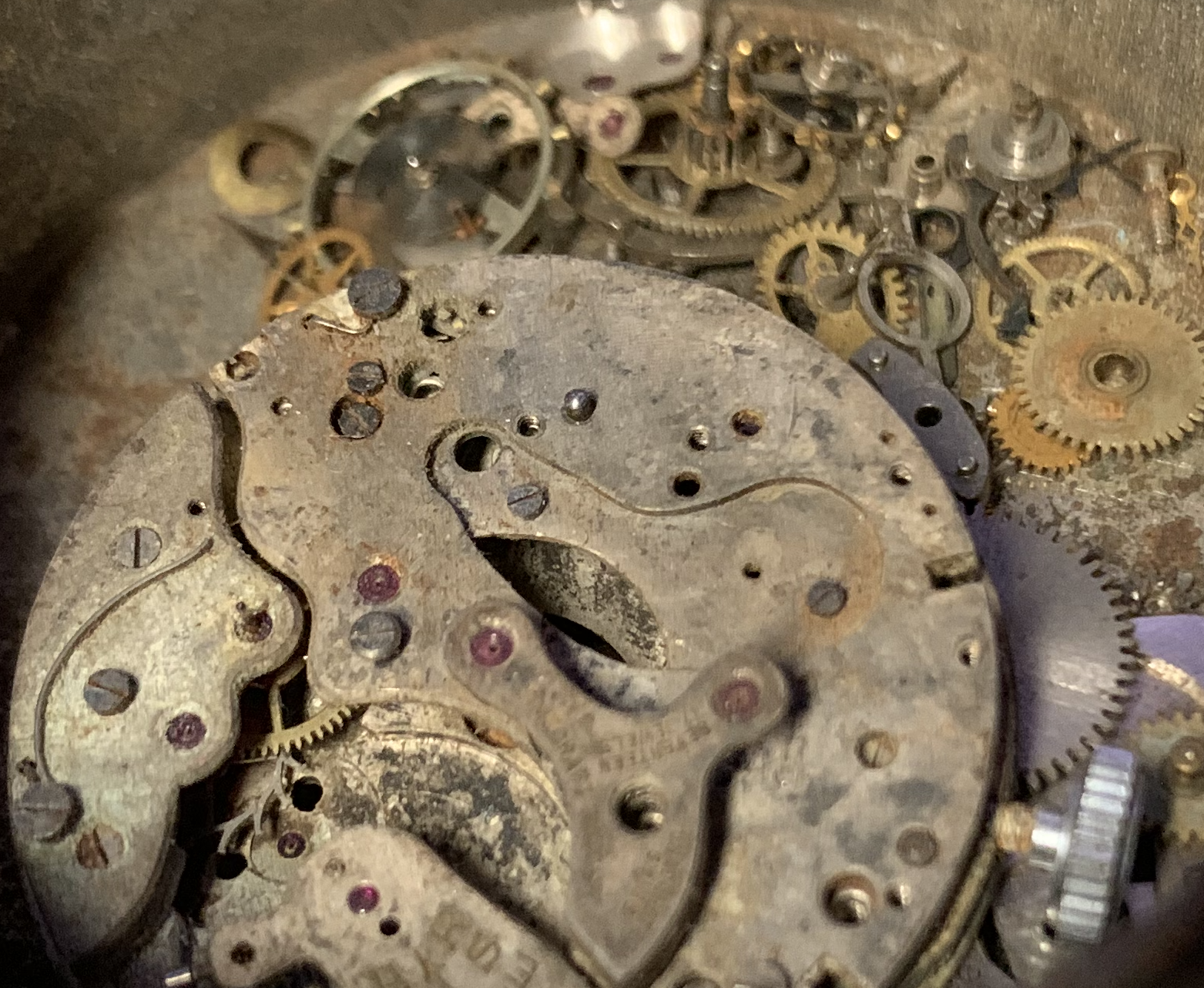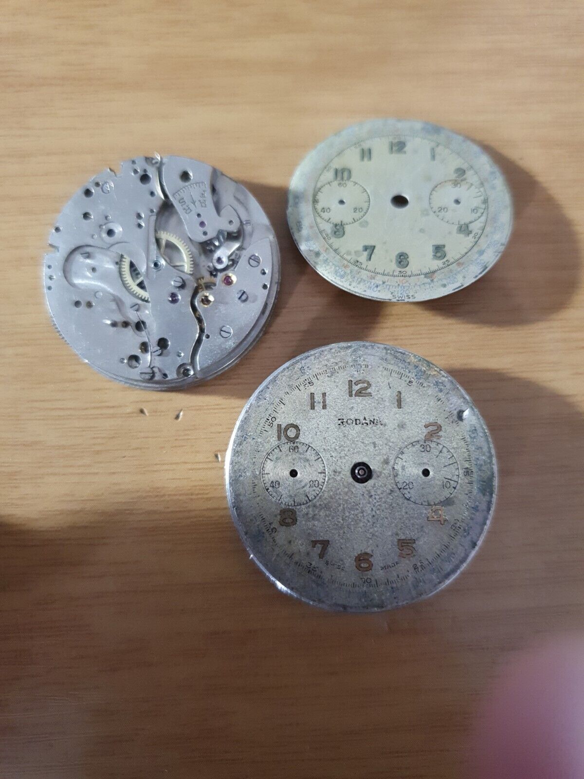 What I was mostly interested here are the dial. Note that one of the dials is not on a watch. This dial actually fits my Valjoux 23 parts watch. Hours of looking at these showed that one of the movements seemed to have most of a wheel train. Shadows shoing the extended 4th wheel pivots.