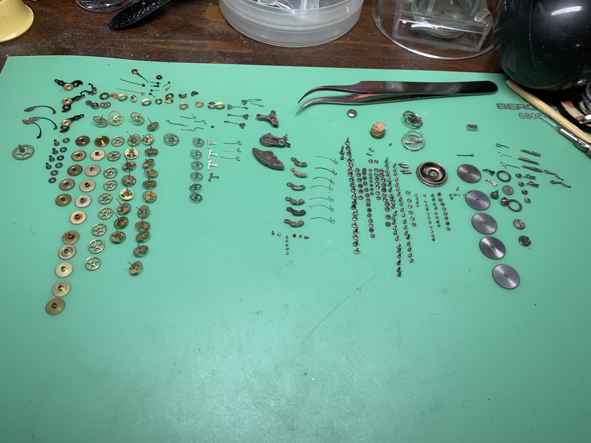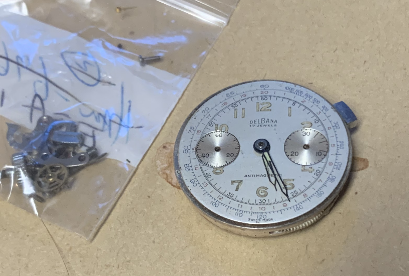 Assembling the parts back into movements helps with the organization. Some things like working with the dials and hands though are risky. With the Delbana, I now have two sets of hands. It is possible I did have the dial at one time. This does give the option to attempt to re-lume the hands.