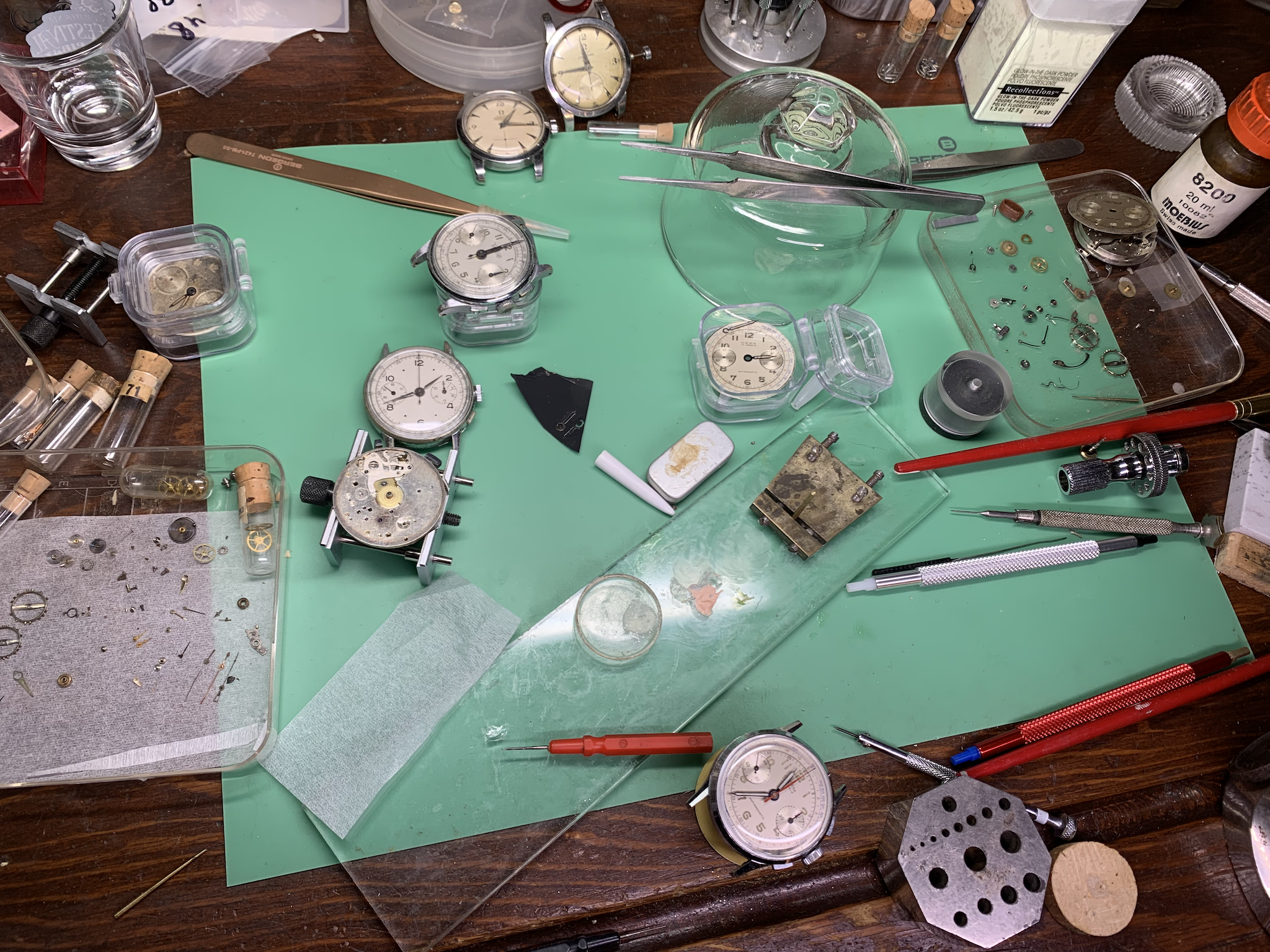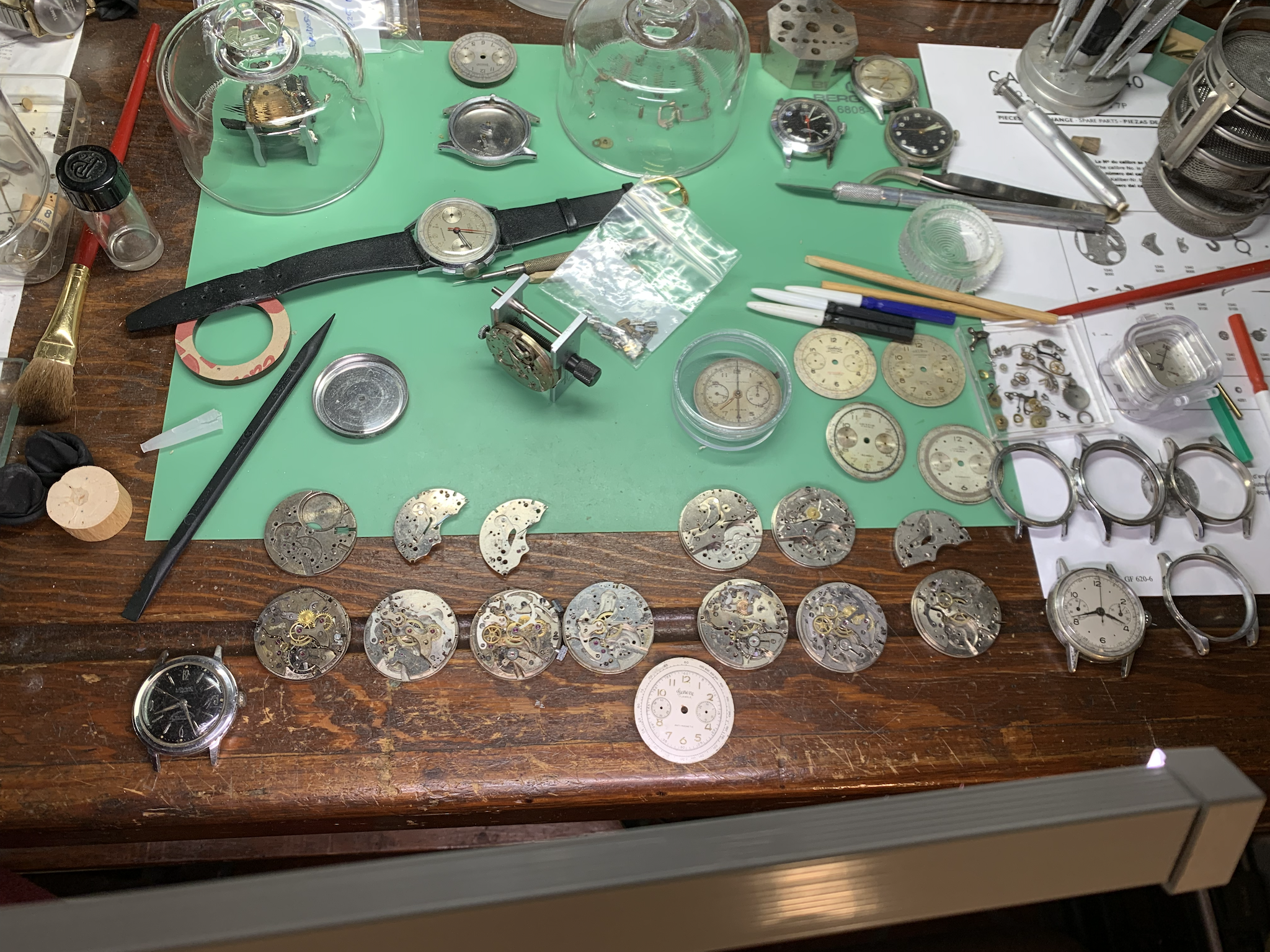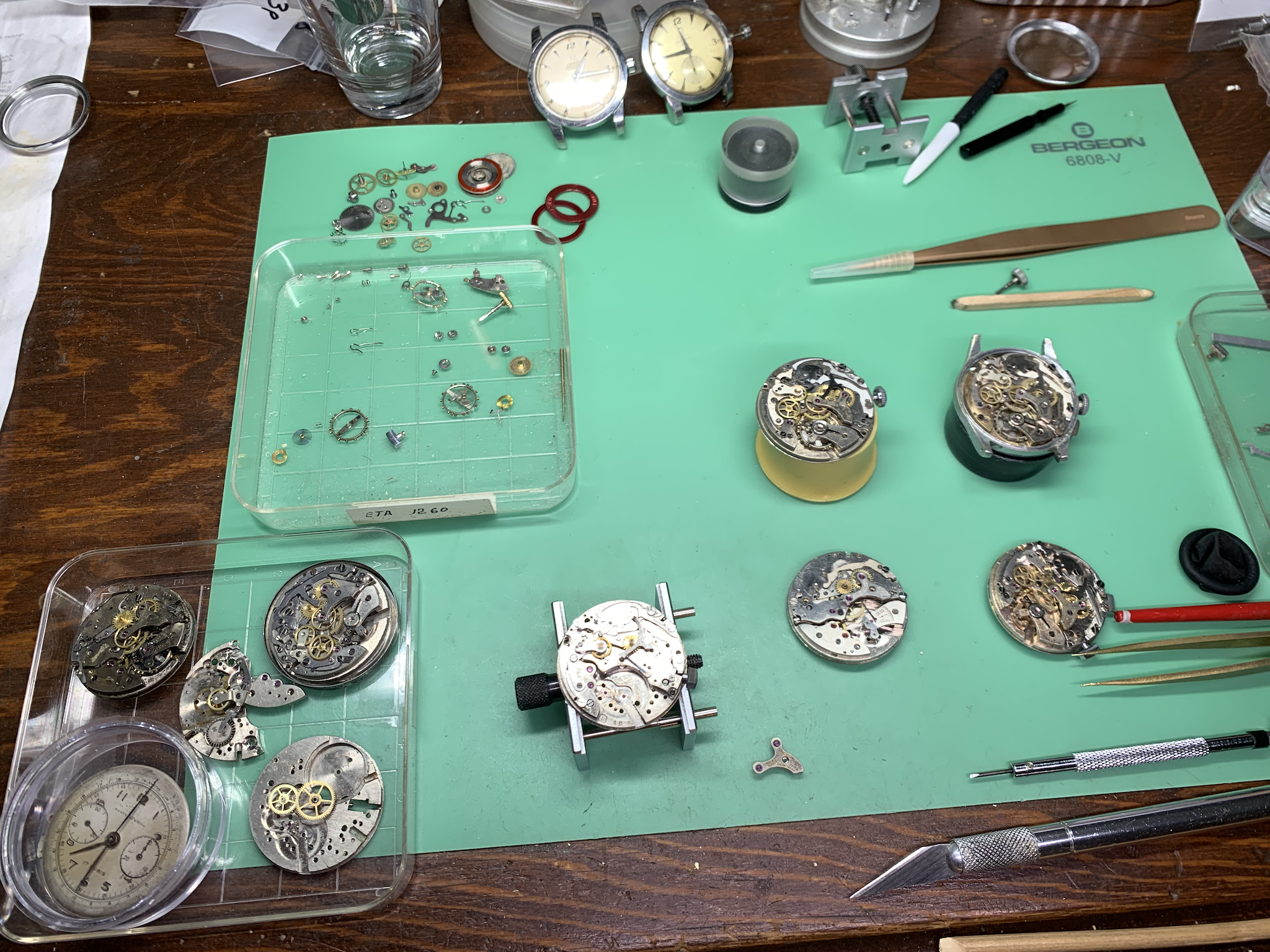 In the last six months many things were learned. The main one was that Landeron 48 and Landeron 51, which share a base caliber, do not have many parts in common. Much time was needed to sort though trays of watch parts and new materials intended to traverse this warren.
