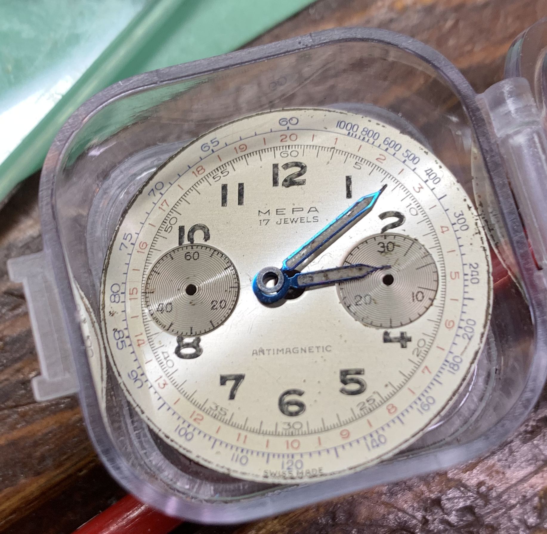 With this success, it was finally time to see if the Delbana 'Mouse' movement would tick using the case as an improvised movement stand.