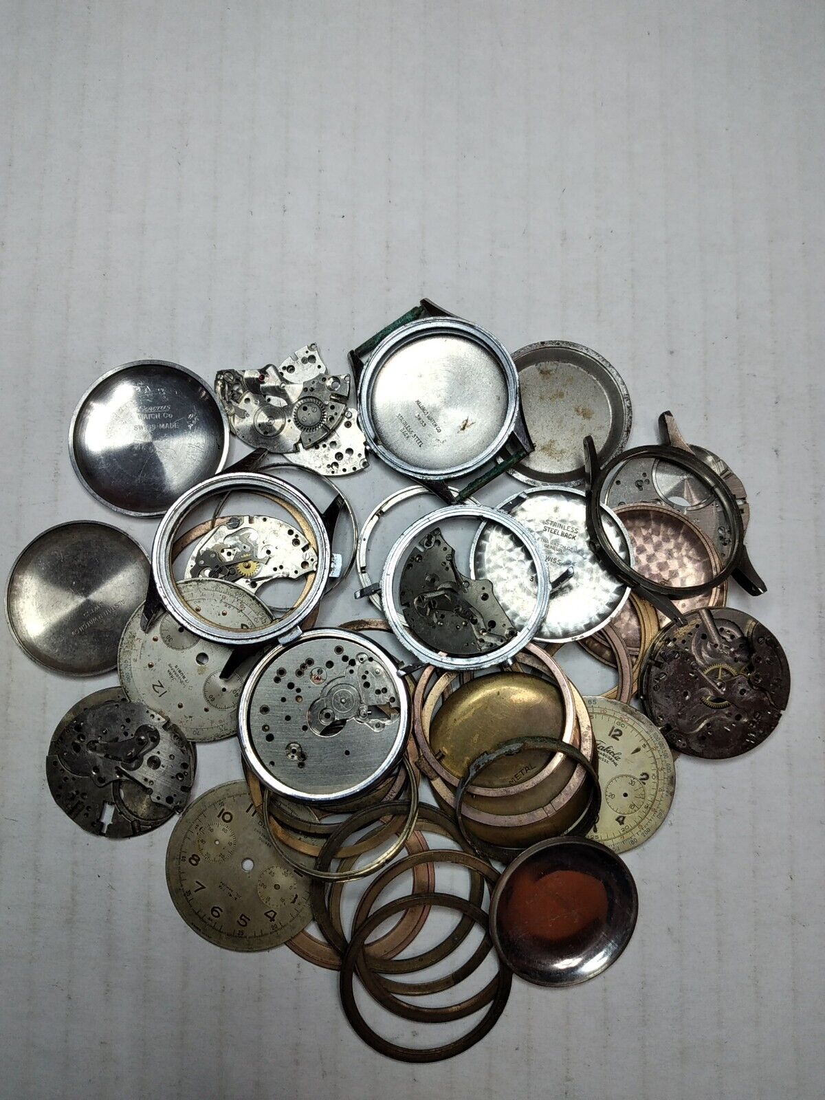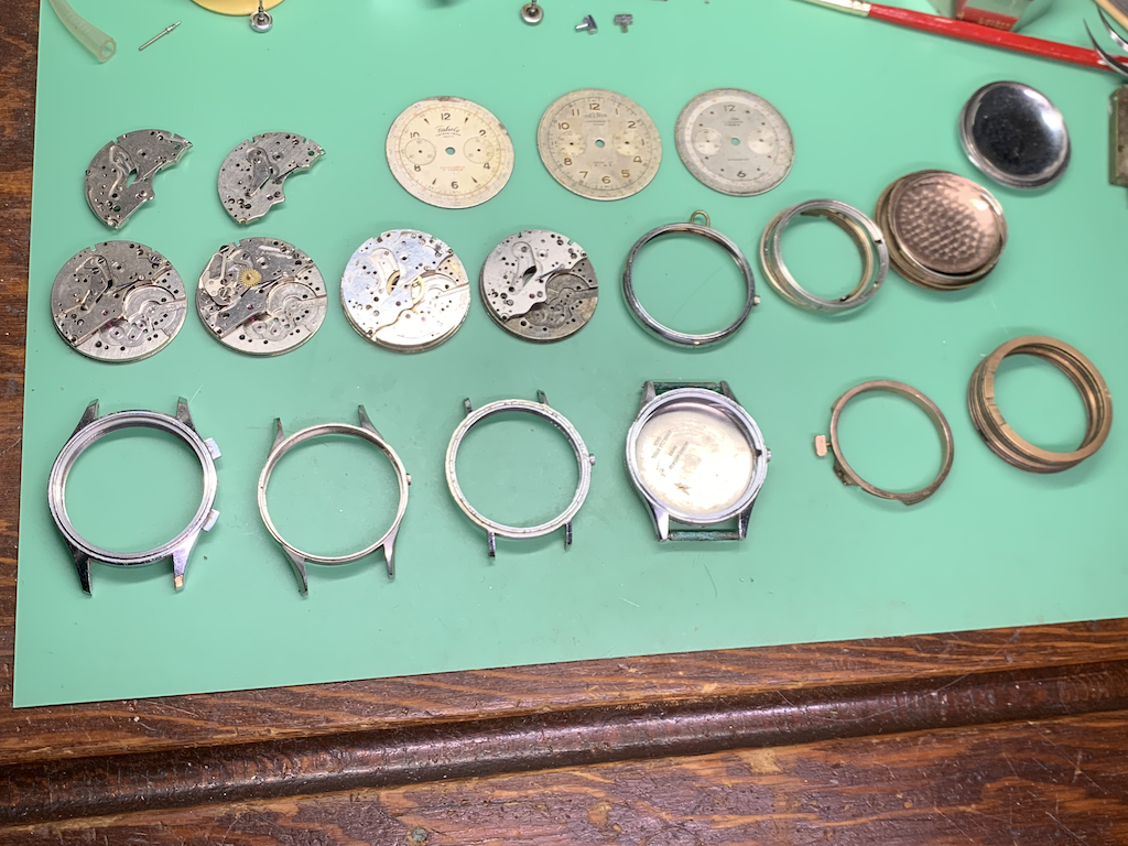 The above image shows one of the many iterations attempting to group these rabbits and spare parts. This shows 4 Landeron 51 and 5 Landeron 48 watches. One of the Landeron 51 watches (lower left) is mostly complete needing a case. The other three are basically parts movements.