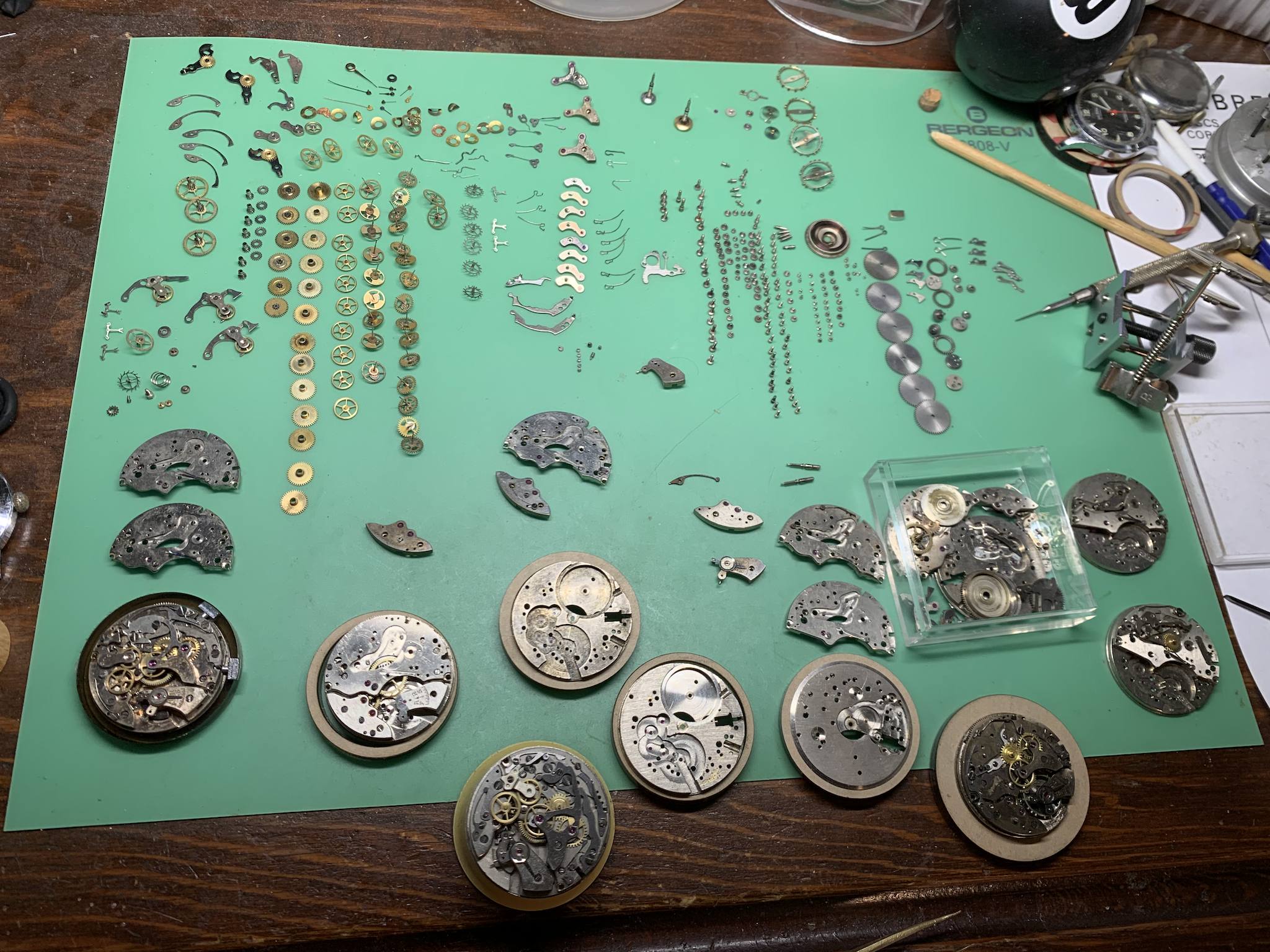 With some effort parts for 9 watches can be identified. (Pay no attention to the Omega side tracks waiting for parts.)