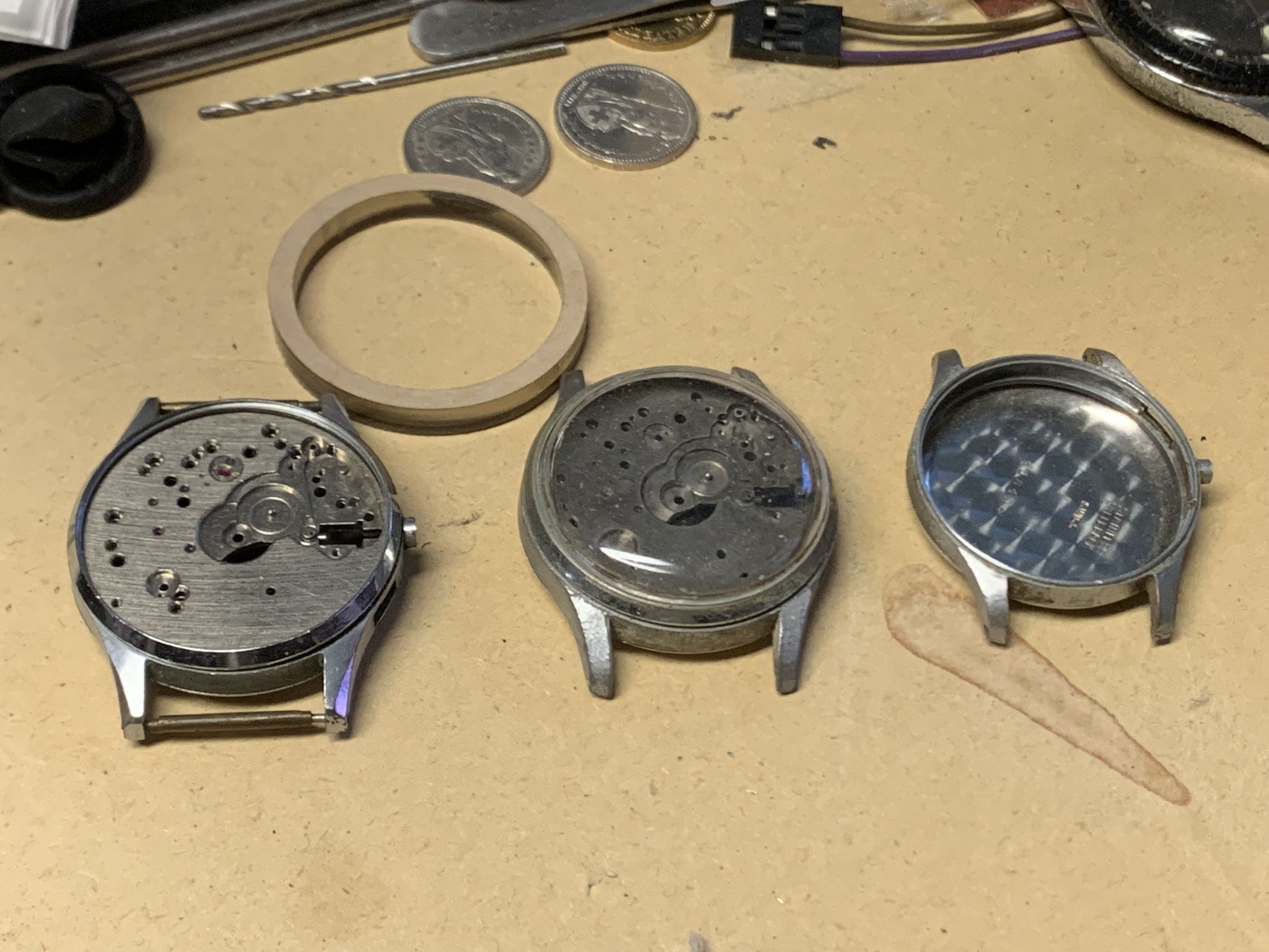 The lack of a pusher make wearing this impractical. The case has also seen some hard use. I actually was going to attempt some nickel plating on it. Projects like that seem to require too much overhead. Something as simple as replacing the staff in the spare balance becomes 'a Project.' The more flat work surfaces one has, the more they seem to accumulate 'stuff.'