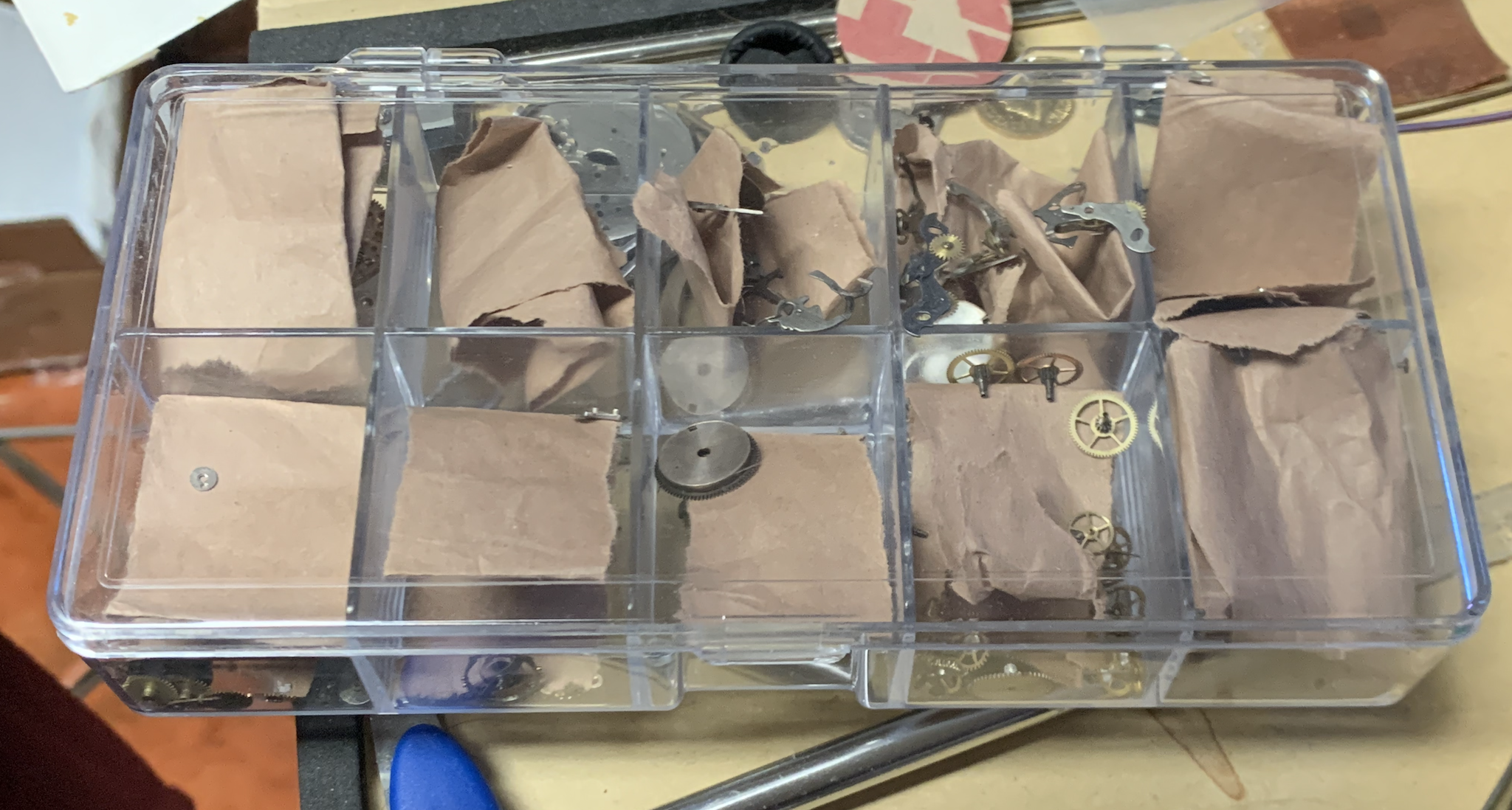 I repurposed one of those bestift type bottle assortment boxes to take the smaller parts sorting the screws, springs and some gearing into the bottles.
