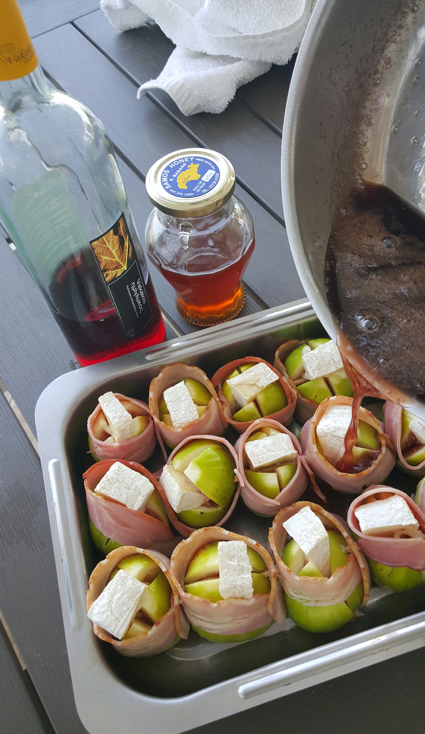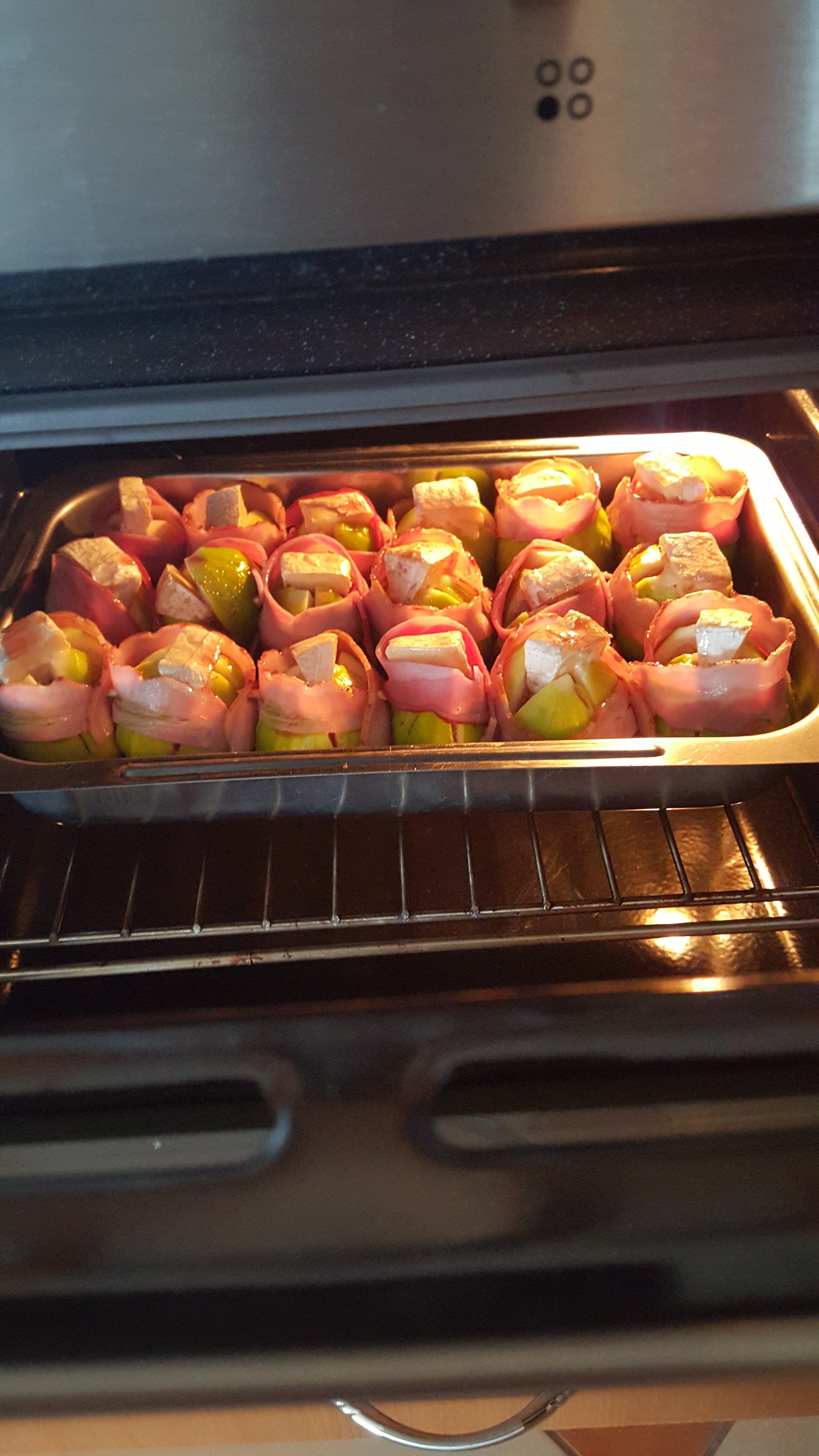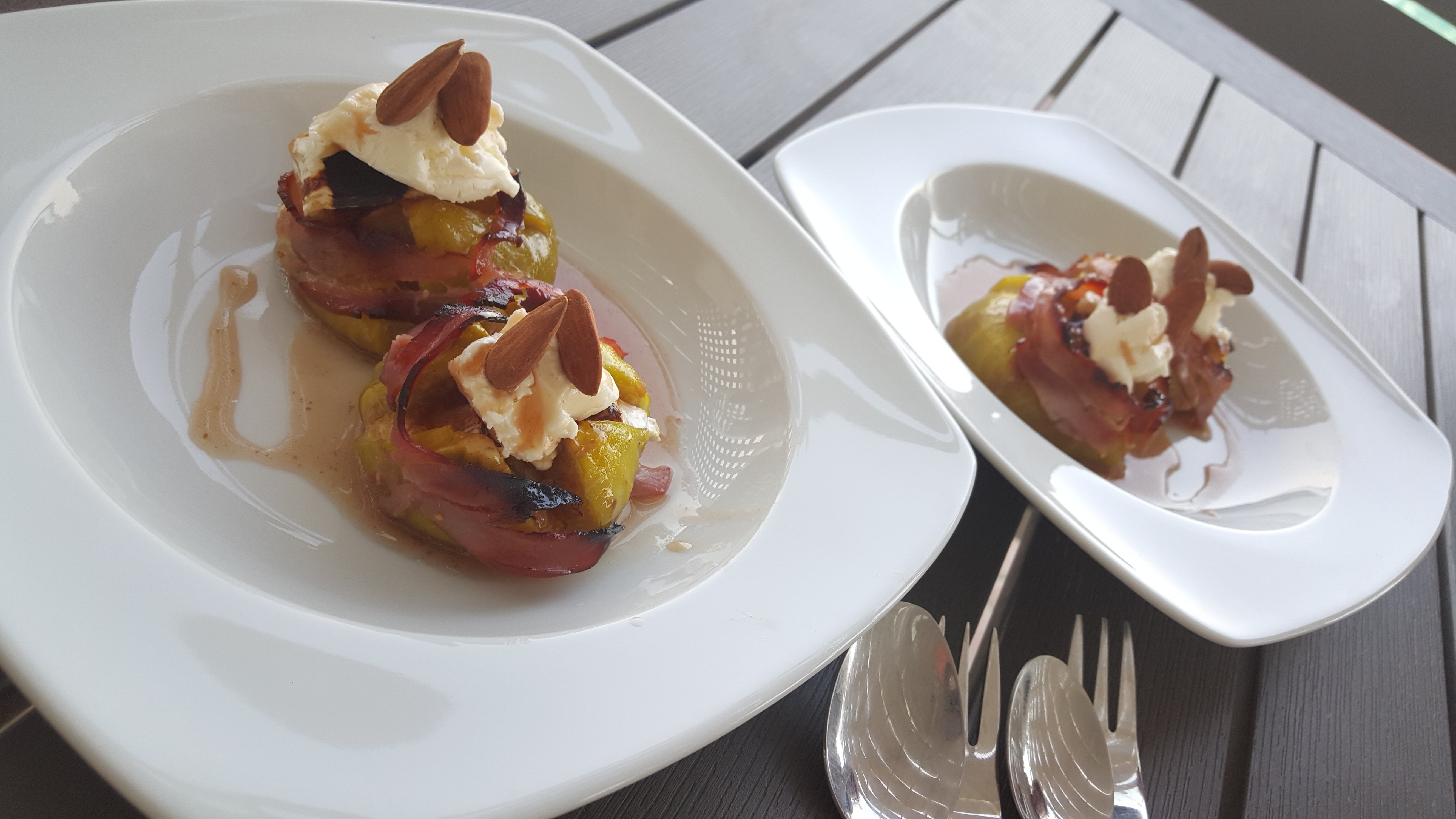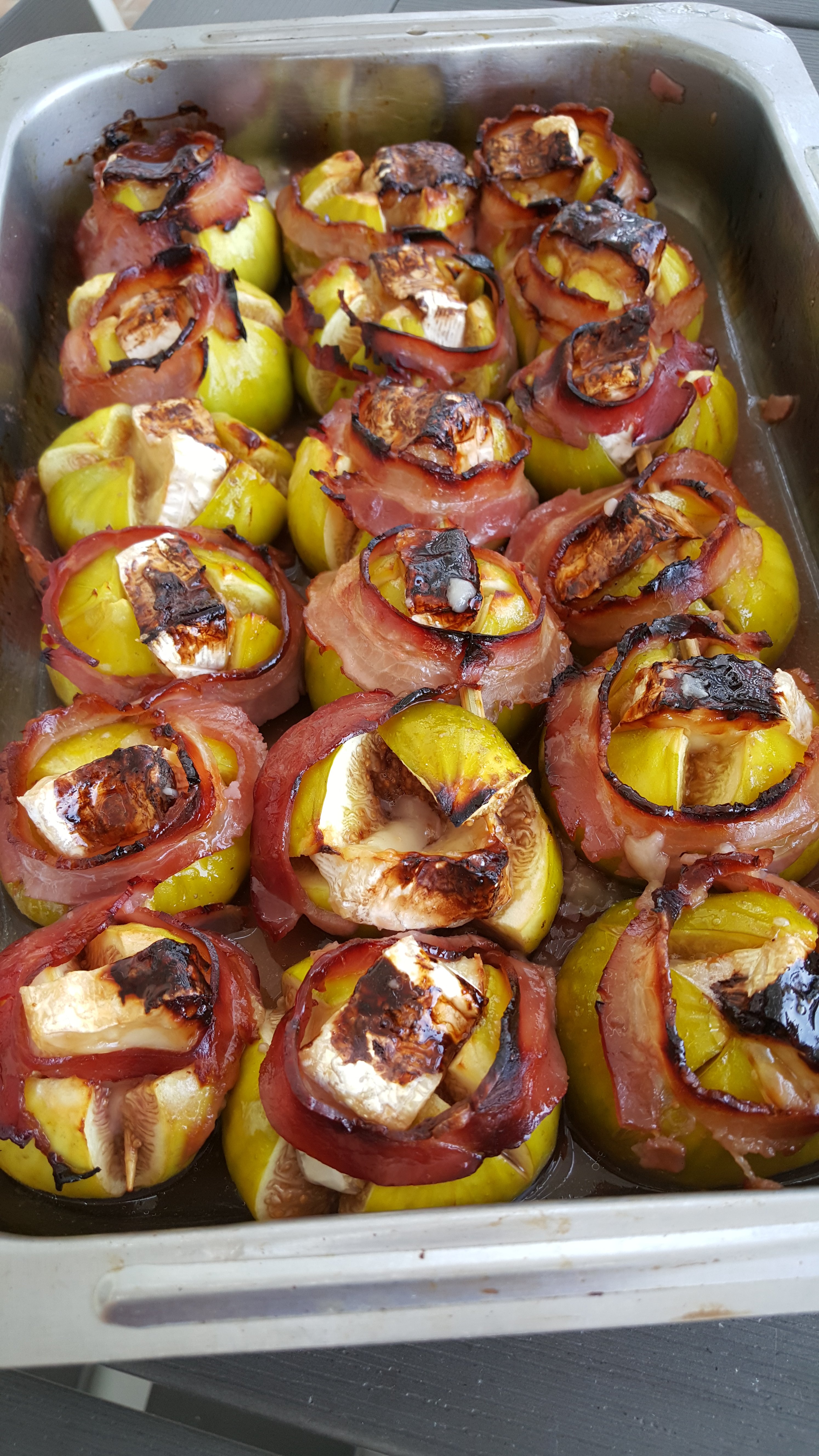 Figs stuffed with some soft goat cheese and wrapped in bacon