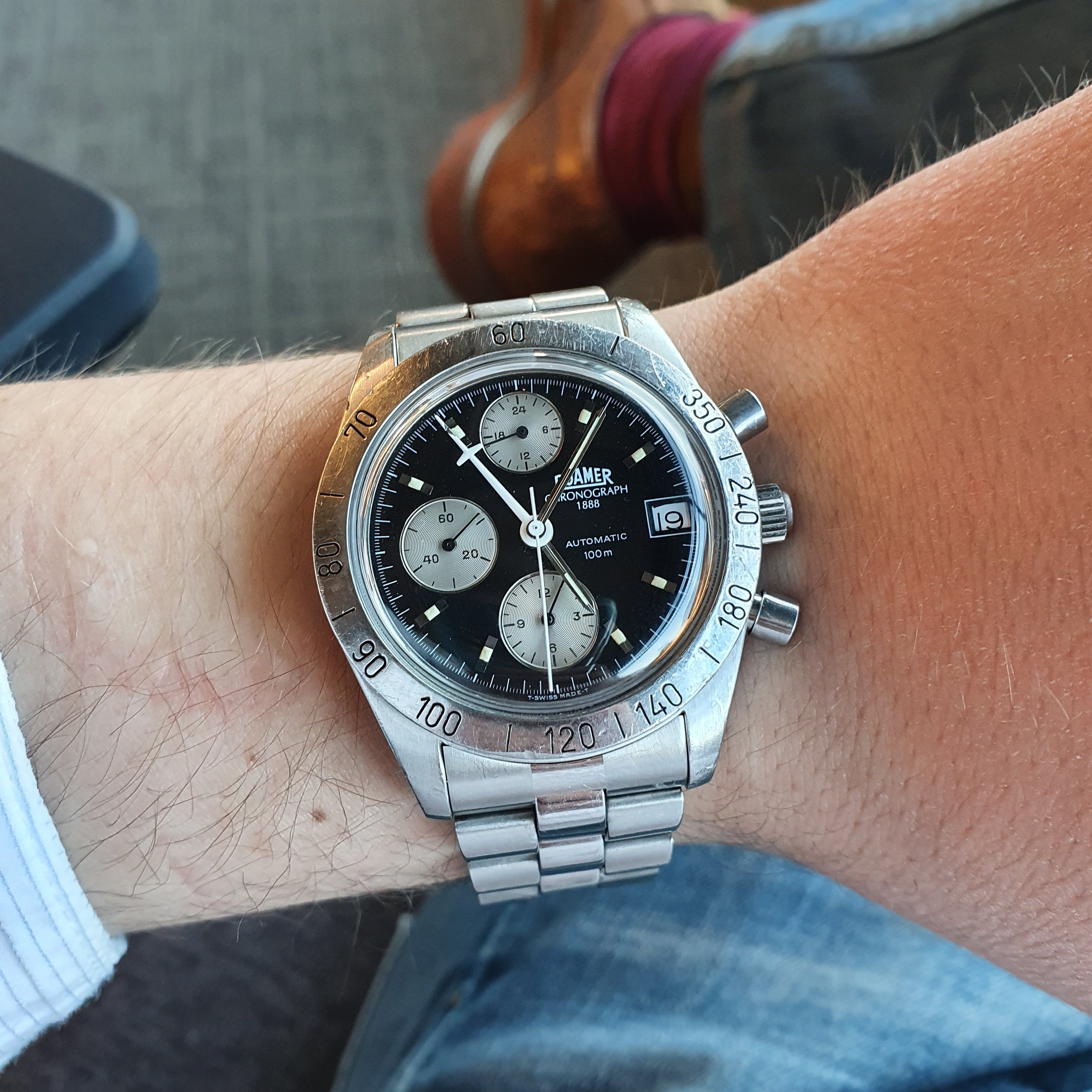 I have a very strong soft spot for nice chronos, or for what I see as being nice chronos. So when I saw this one with the Lemania 5100 ticking inside it, having a matte panda dial with tritium who started to age nicely, I bought it on the spot. All the other details like having plexiglass and the very nice size (38mm without crown) plus bracelet were the cherry on top. However, I'm trying to respect the one in/ one out rule and this one is next to go.