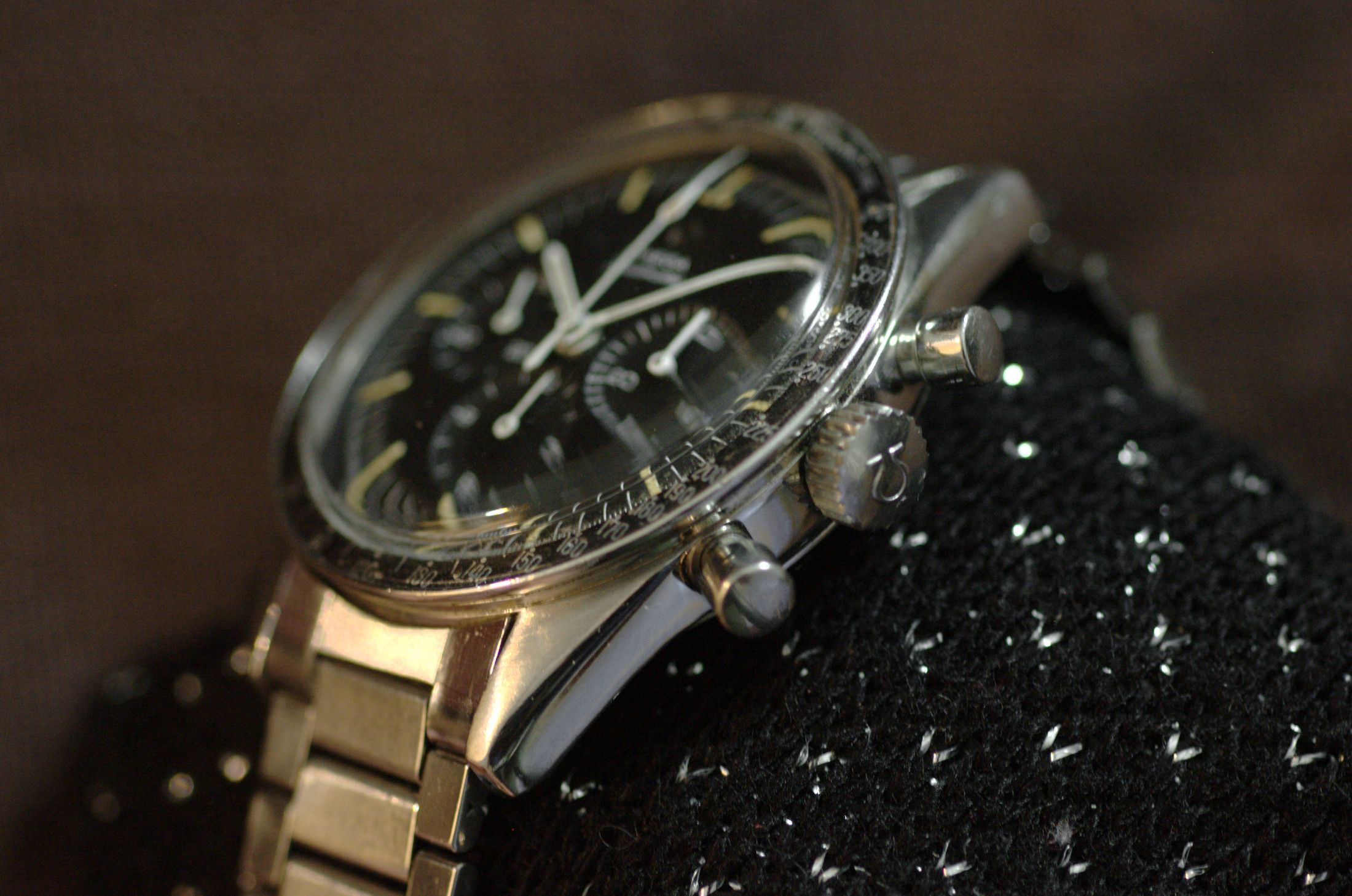 The case was incorrectly refinished at some point : sides were polished, bevels are still here but not crisp anymore, top is brushed. Must have been done by a Rolex fanboy 馃榿. Pushers are screw fit, not friction fit. Standard service pushers were replaced by me with smaller pushers, found in a box full of old discarded Speedy pushers among other things. Are they from a Speedy? Who knows.