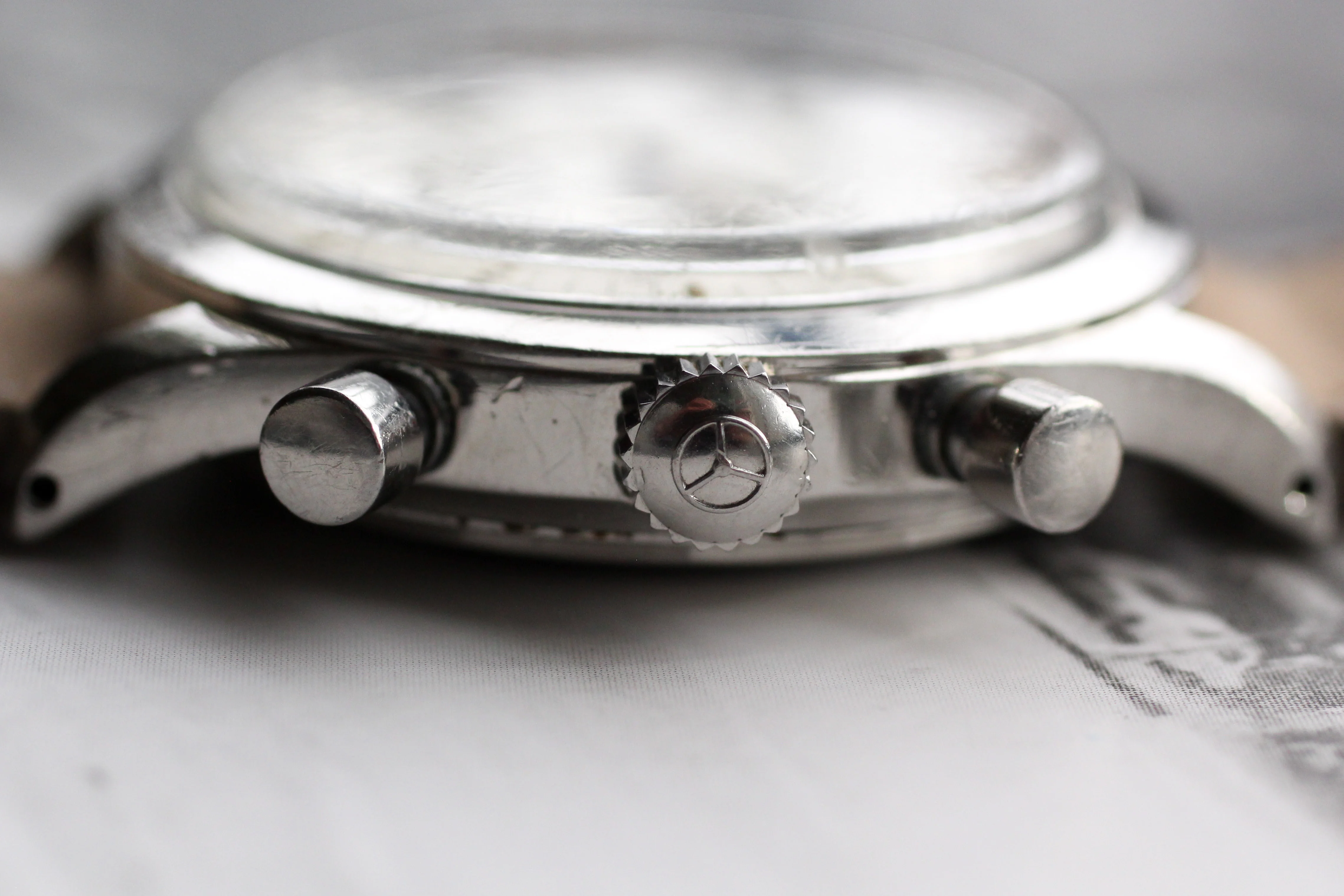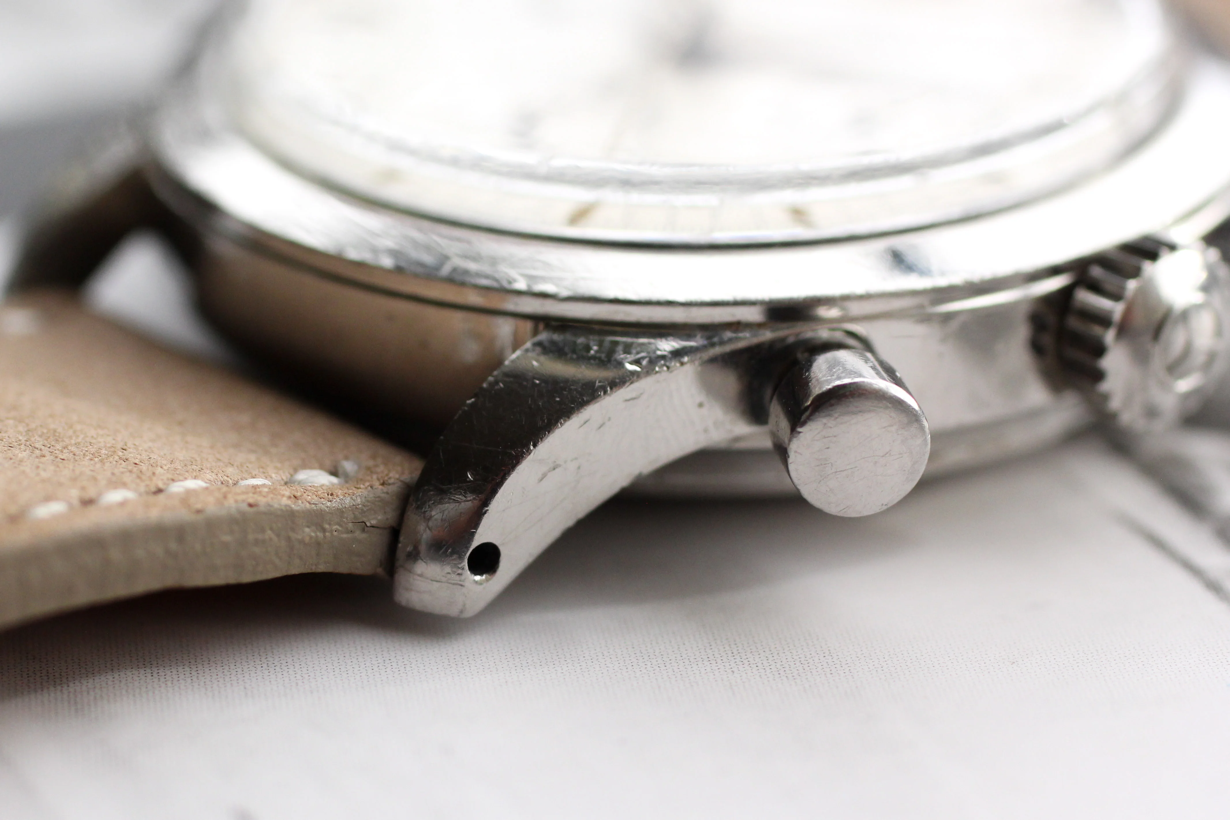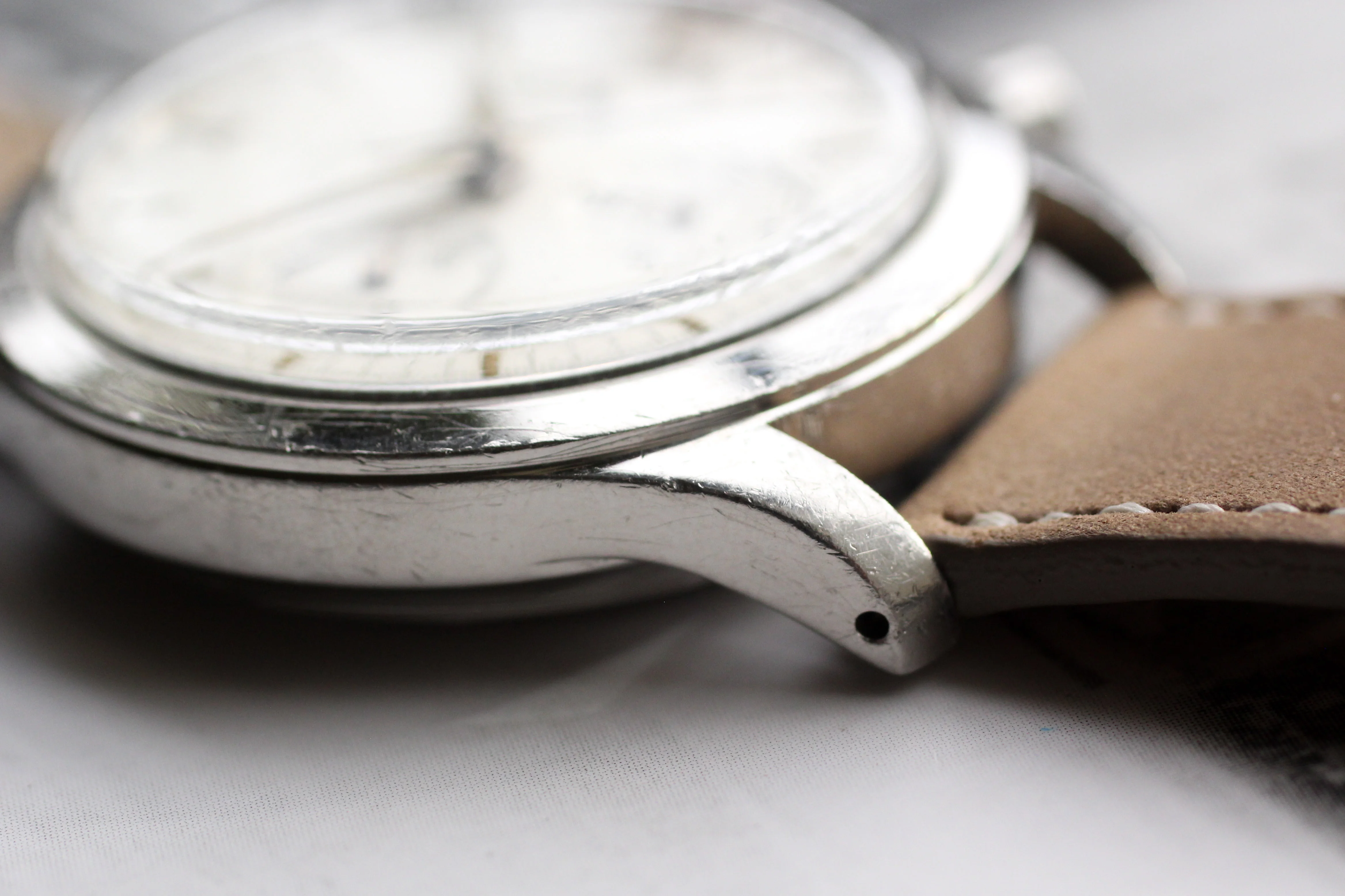 Dial: White dial has aged beautifully, with no dial damage, pitting, or marking. The lume plots have aged to a pleasant creamy shade and are fully intact with no damage. The dial shade is reminiscent of early white dialed 6239 Rolex Daytonas, in that it is neither metallic nor matte (somewhat of a cross between the two). Singer supplied both dials, so it would make sense that the finish is closely related.