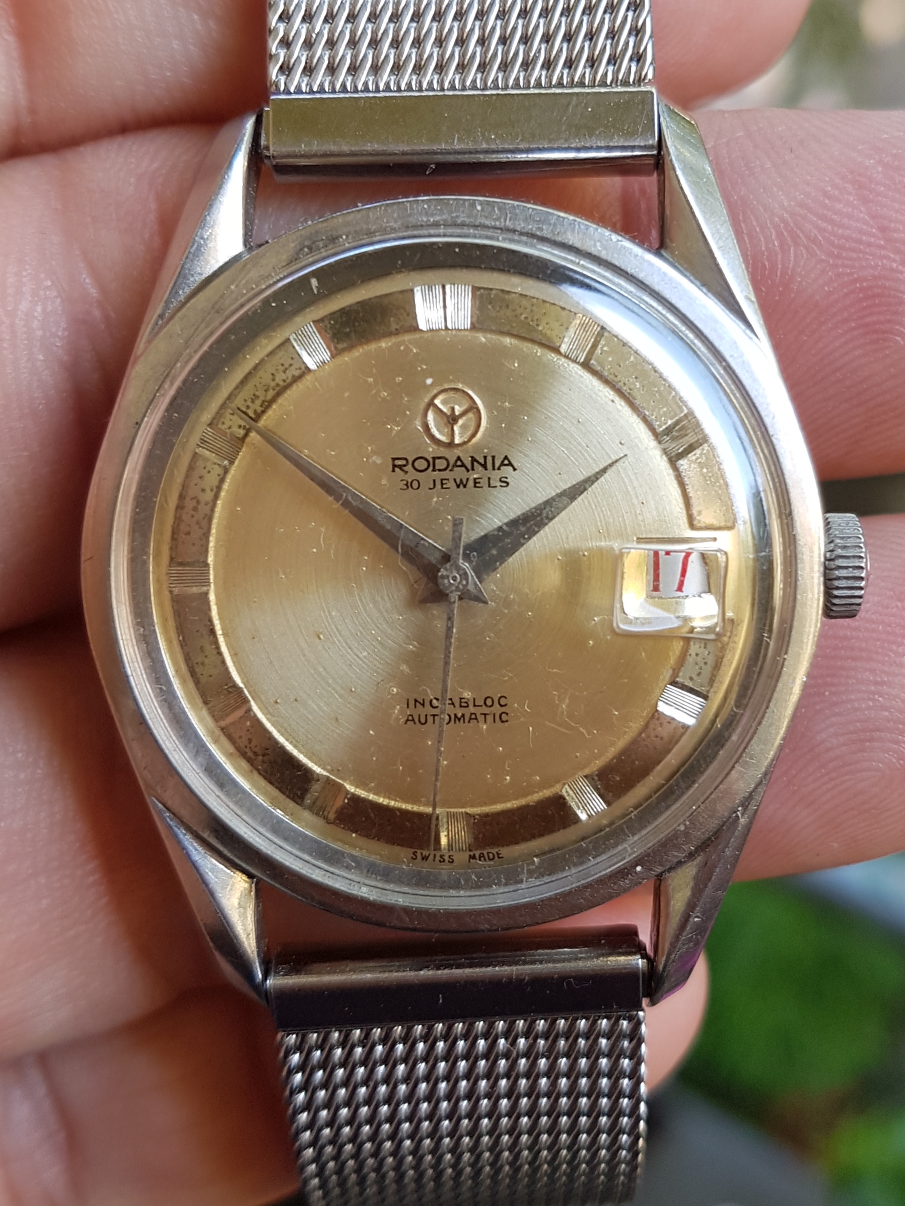 The all stainless steel Rodania has around 34,5mm diameter. Like the early UG Polerouters it has a broad ss bezel and twisted lugs. Nice dauphin hands and red date, the champagne dial with the applied logo shows some patina.