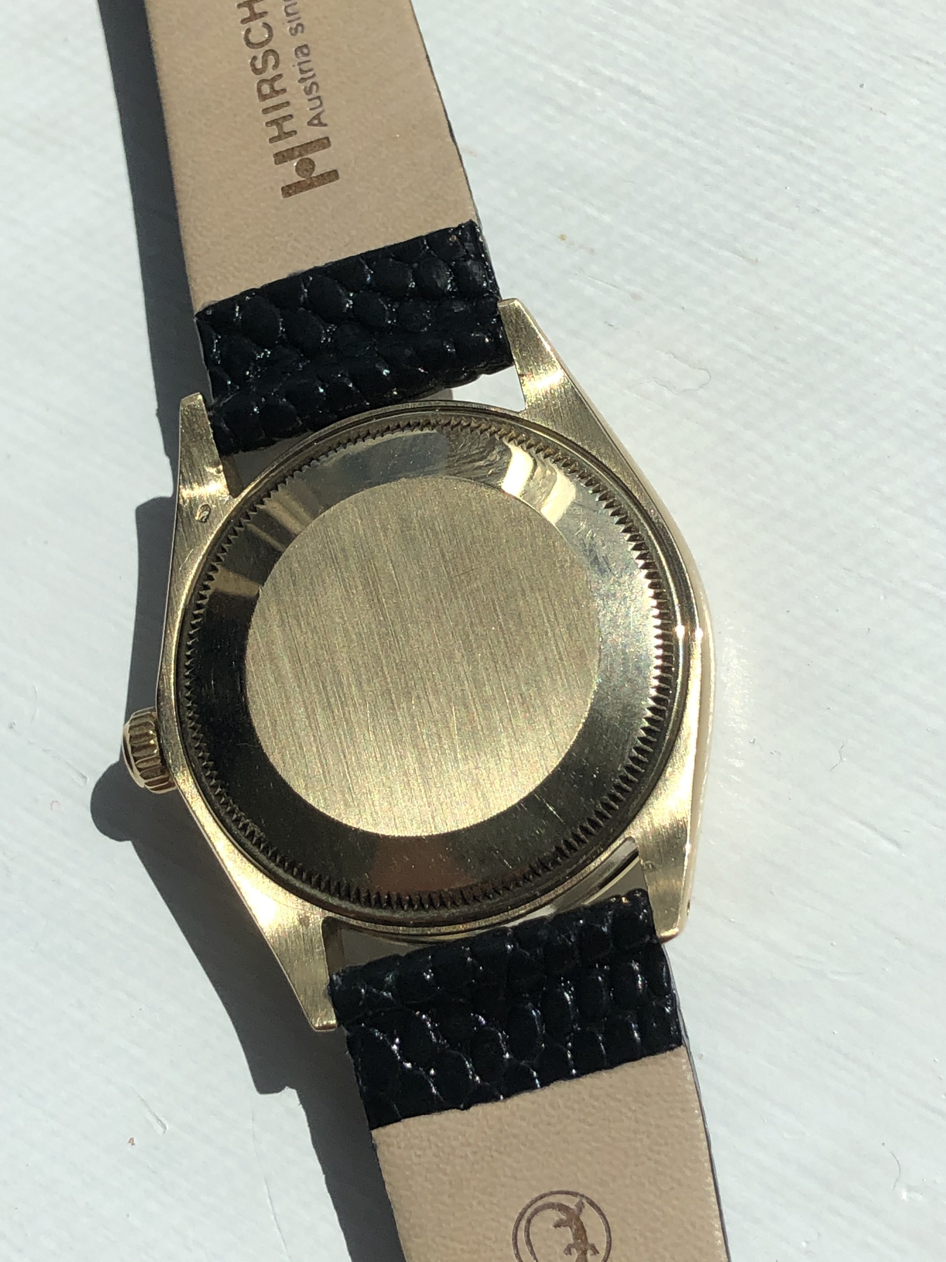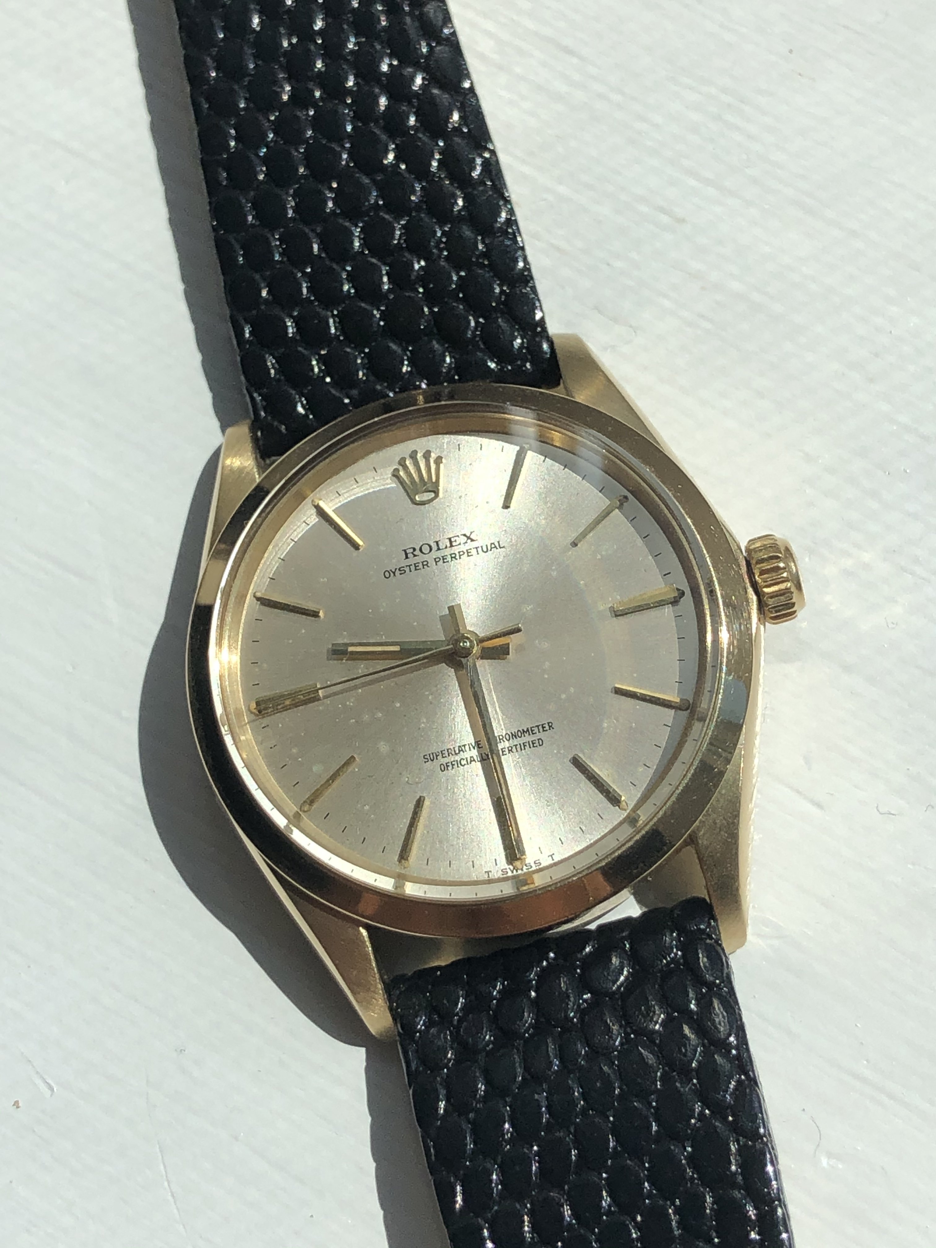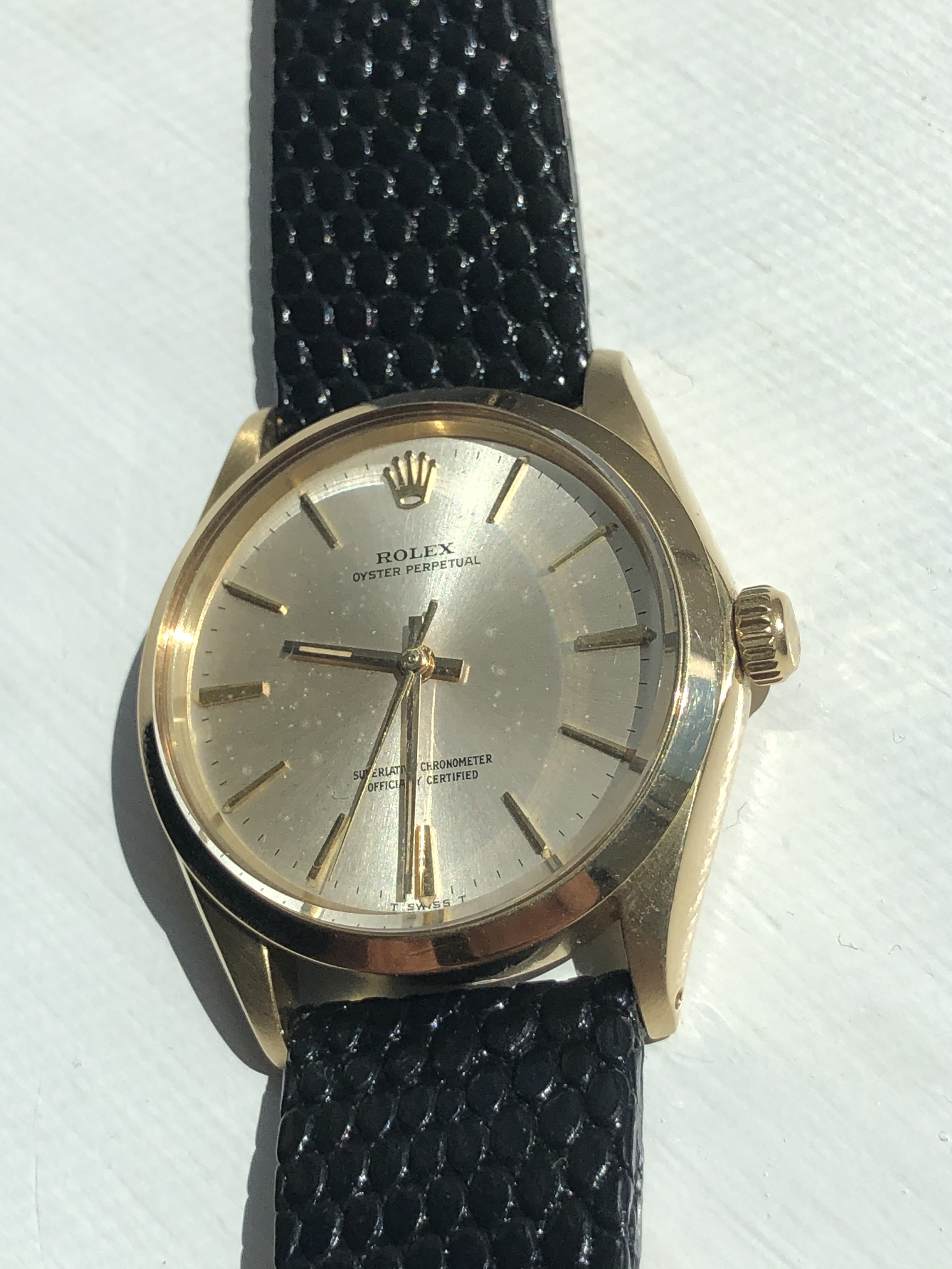 Up for grabs is an amazing unpolished condition solid gold Rolex. Super sharp lugs that are scratch free and so is the bezel. Some spotting on dial, but gives it character. 34mm without crown. Runs well but not serviced in my possession (previous owner claimed recent service). Ref 1002.