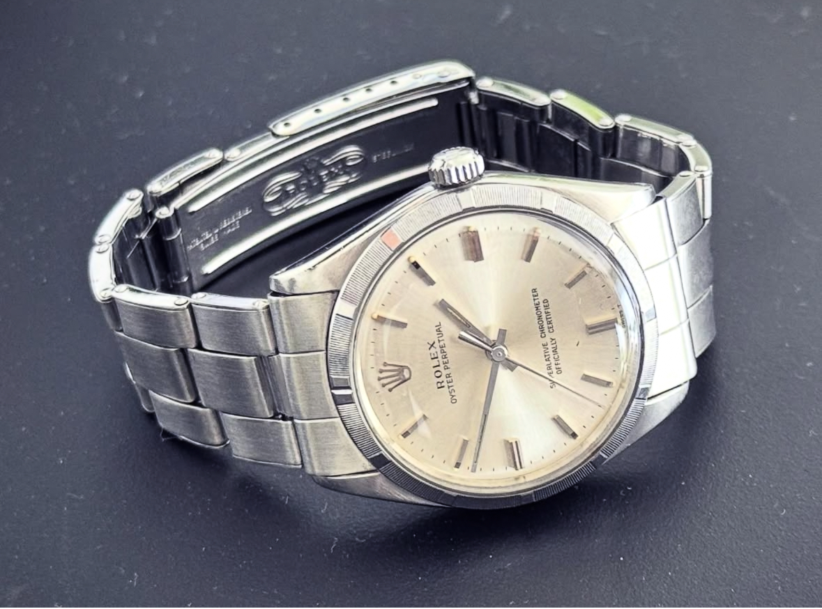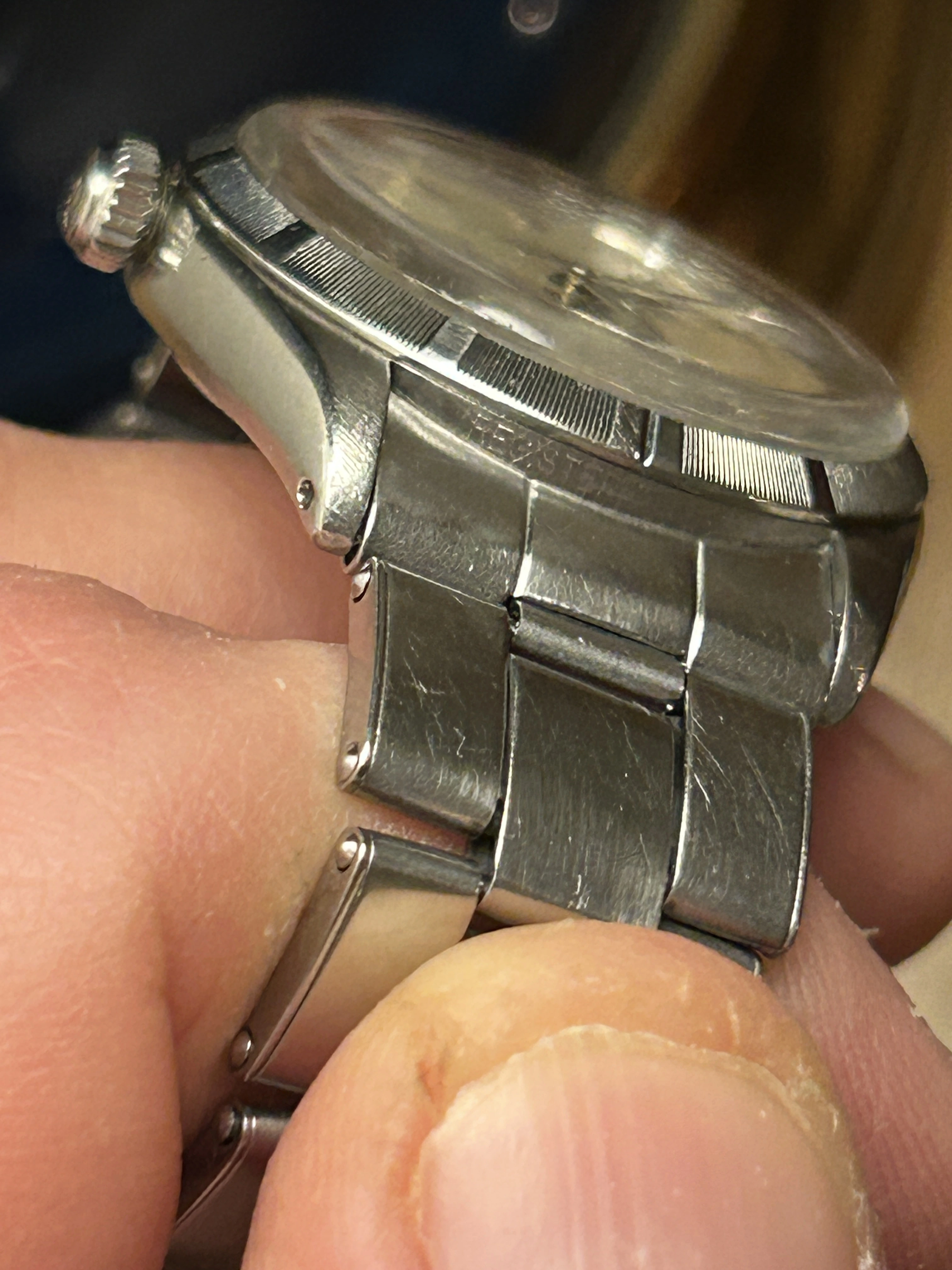 I have a 1003 on the riveted bracelet, and the same end links (different dial though). You can muck around with the protruding bits on the bottom of the end links to make it ‘grip’ the case a bit better by squeezing them in, but it’s always going to jangle (at least in my experience). Incidentally, I have a Seiko Lordmatic on the beads of rice bracelet from the same year, and it’s a far better made thing in my opinion, yet those riveted Guy Freres bracelets are highly coveted, for…Rolex reasons.