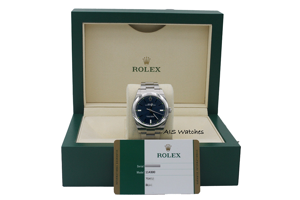 Up for sale is a Rolex 114300 Oyster Perpetual 39 MM Blue Dial with Watch and Card Only. The timepiece in good condition. **Box for display purpose only**