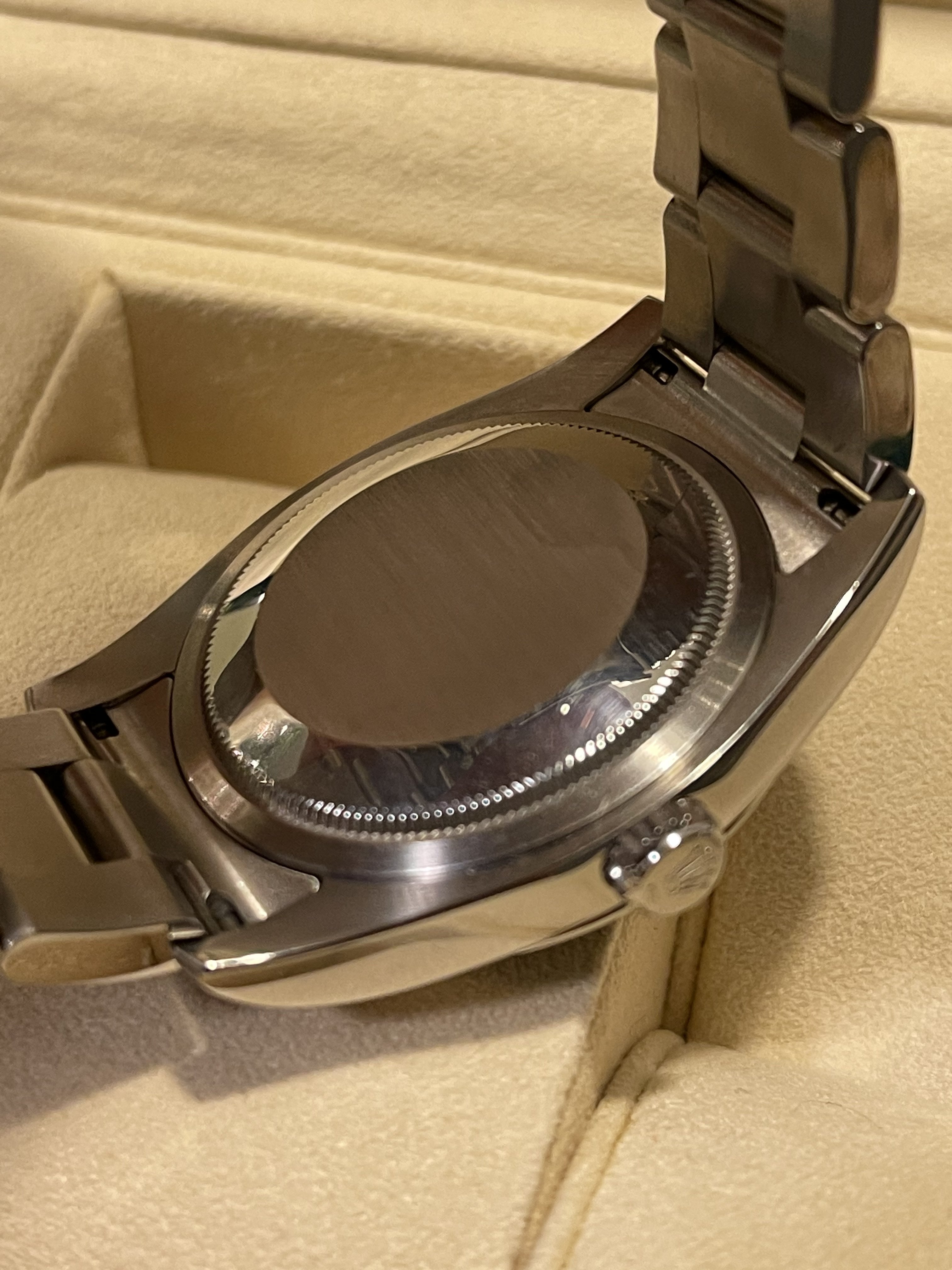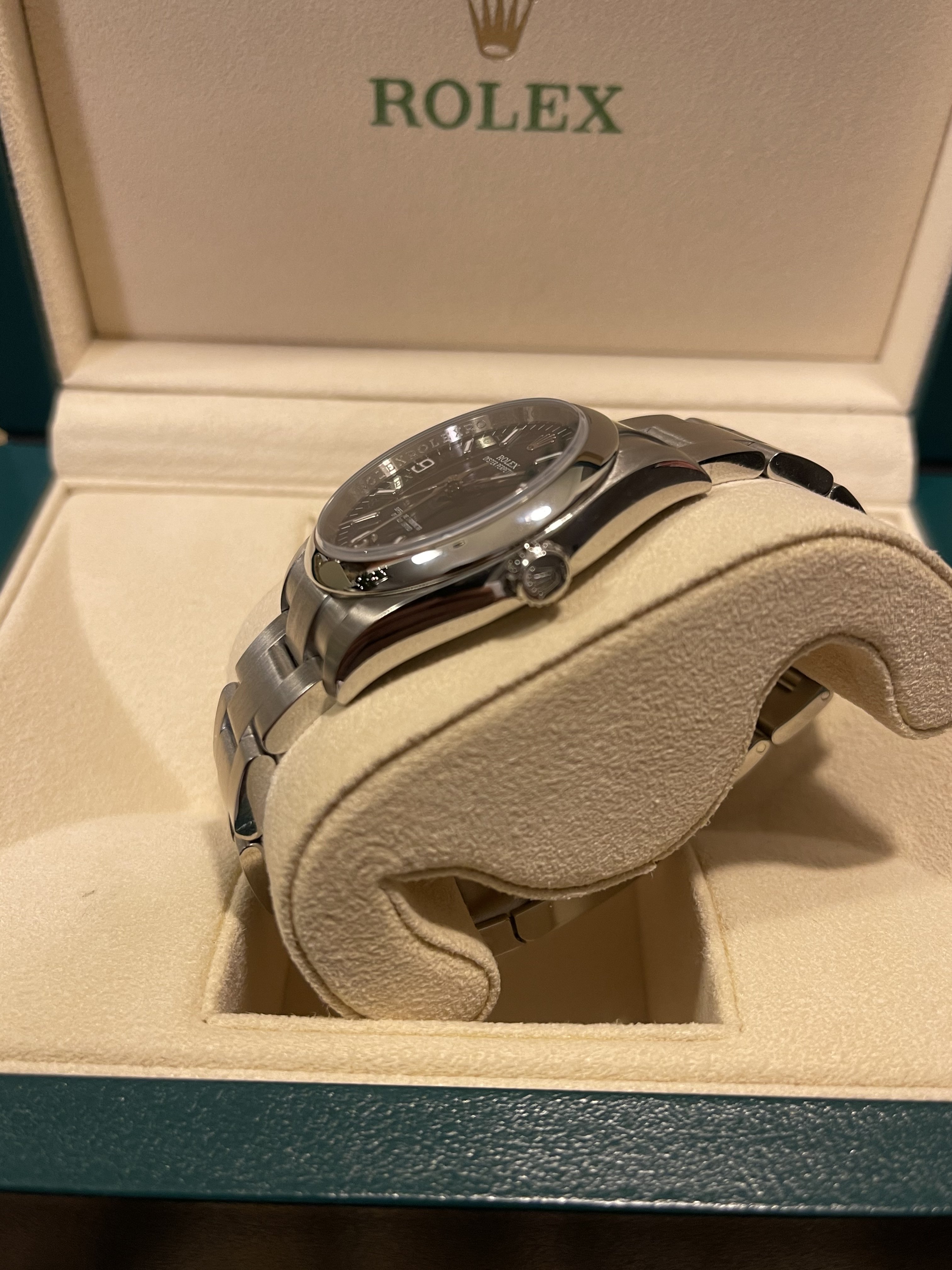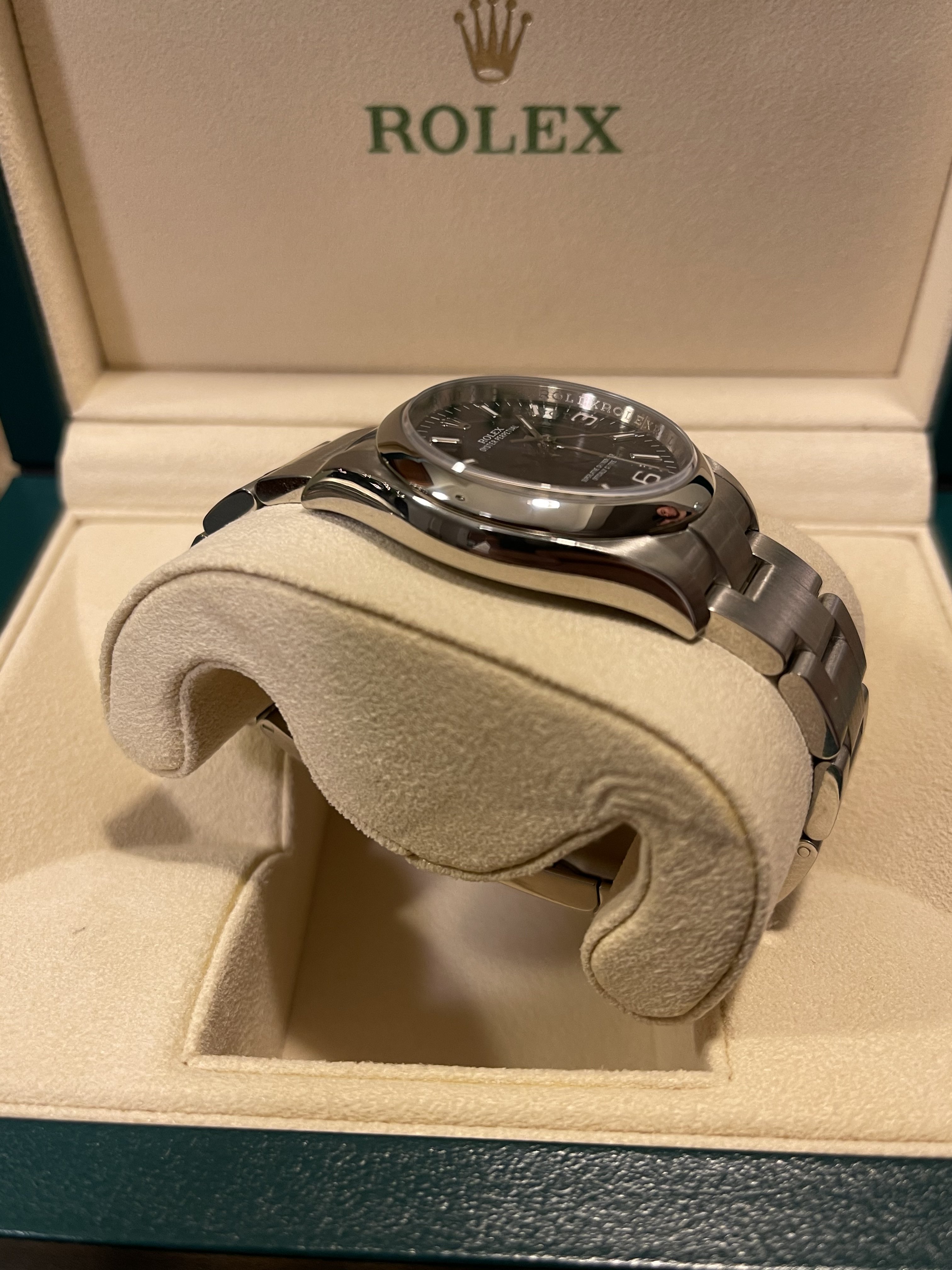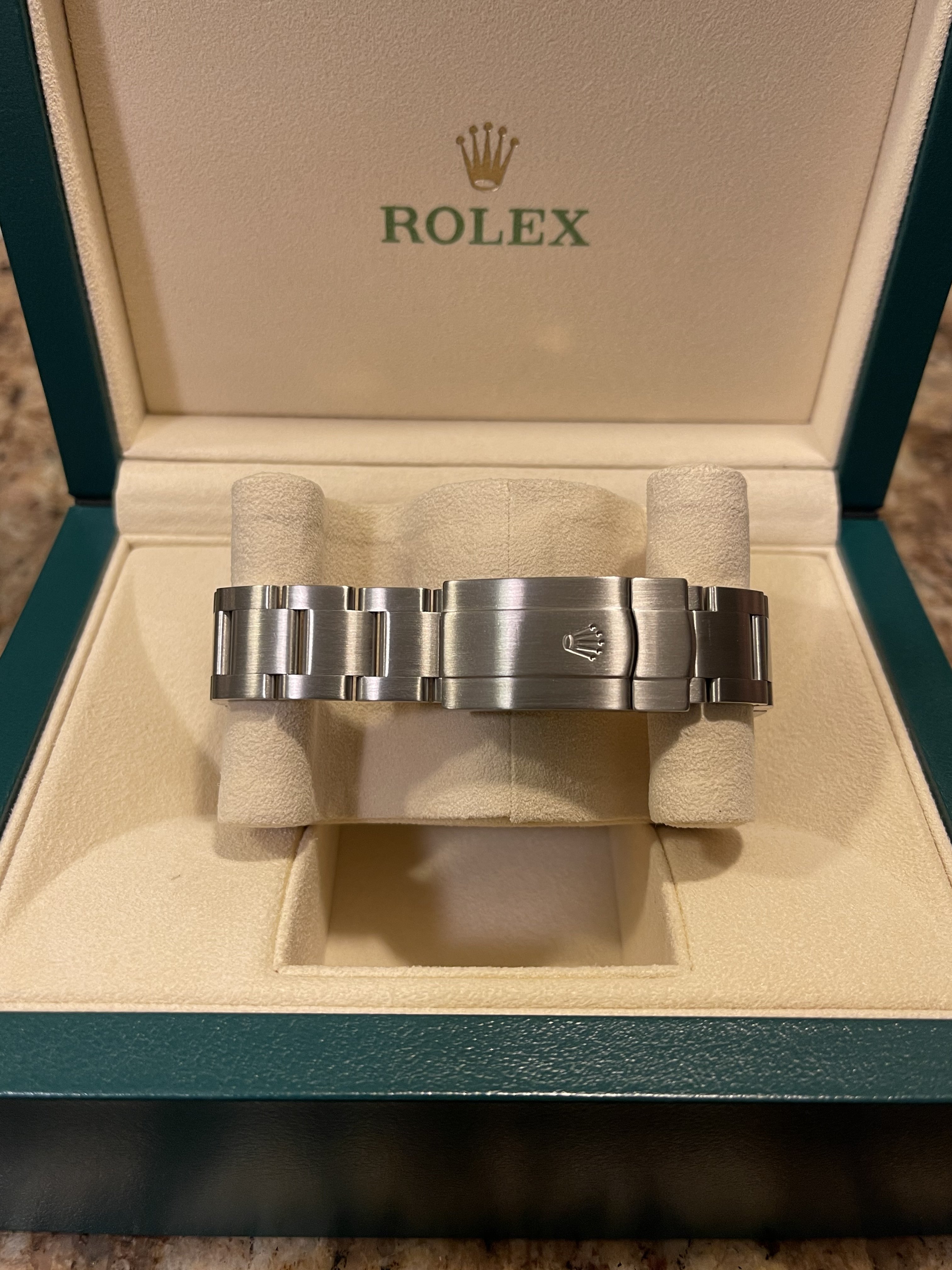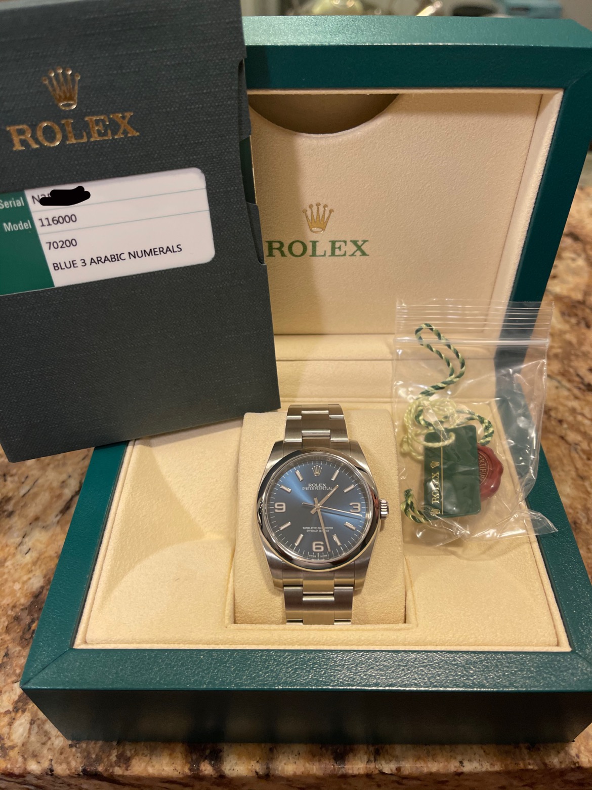 The watch comes with the original boxes—inner green Rolex box, outer Rolex box and outer protective sleeve, tag, manuals and stamped warranty card dated DEC 10 2016 from a Rolex Authorized Dealer. N Serial. Keeps time as well. Received in a trade from original owner which I remember when he bought the watch new.