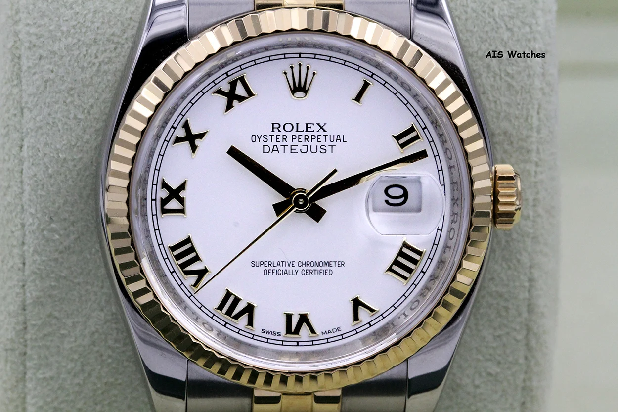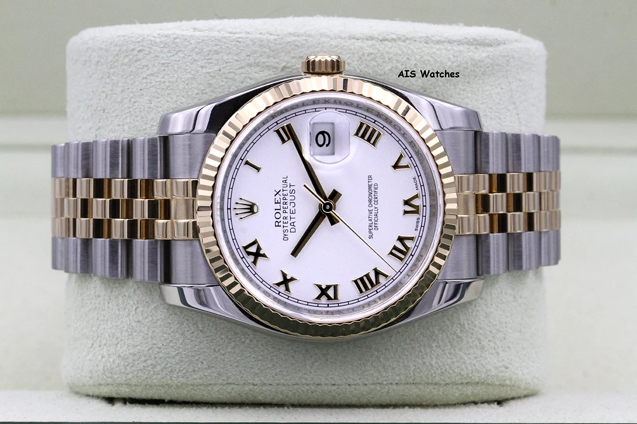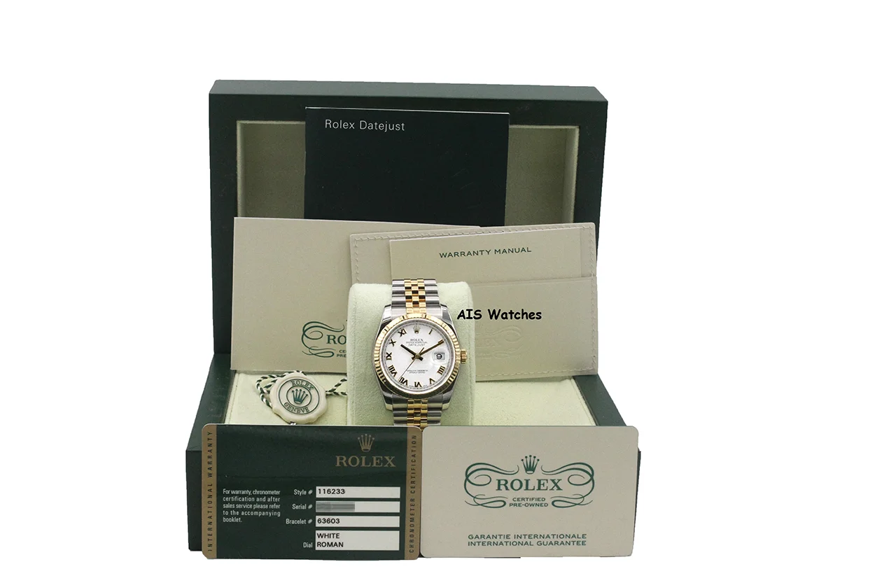 Up for sale is a Rolex 116233 DateJust 36MM 18K YG / SS White Roman Dial Jubilee Bracelet Box & Papers + Rolex CPO Card. The timepiece is in excellent condition.