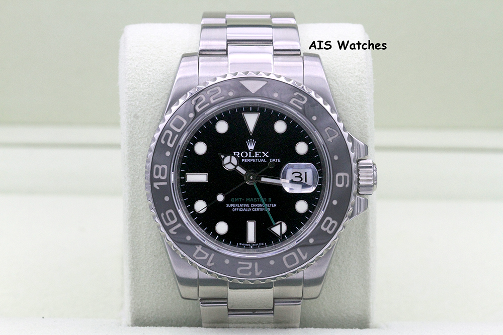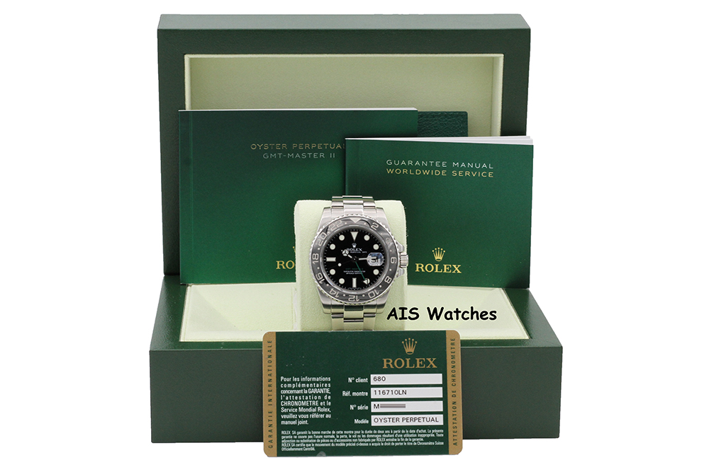 Up for sale is a Discontinued Rolex 116710 LN GMT Master II Black Ceramic Insert M Serial Box & Papers. The timepiece is in excellent condition.