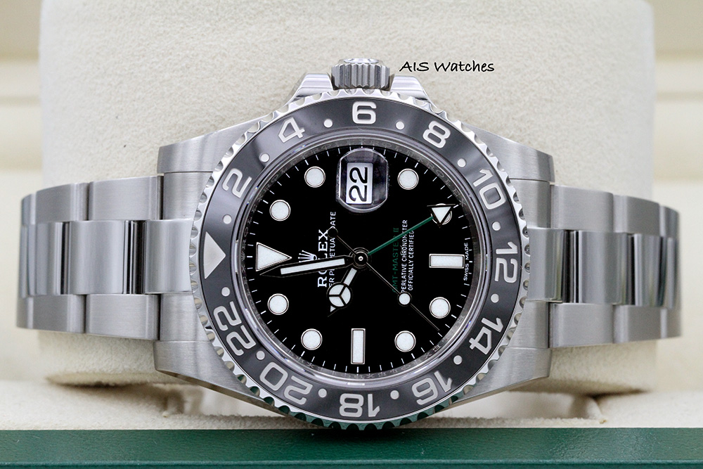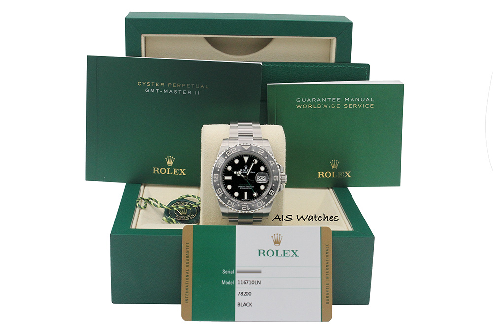 Up for sale is a Discontinued Rolex 116710 LN GMT Master II Black Ceramic Insert Random Serial Box & Papers. The timepiece is in clean condition.