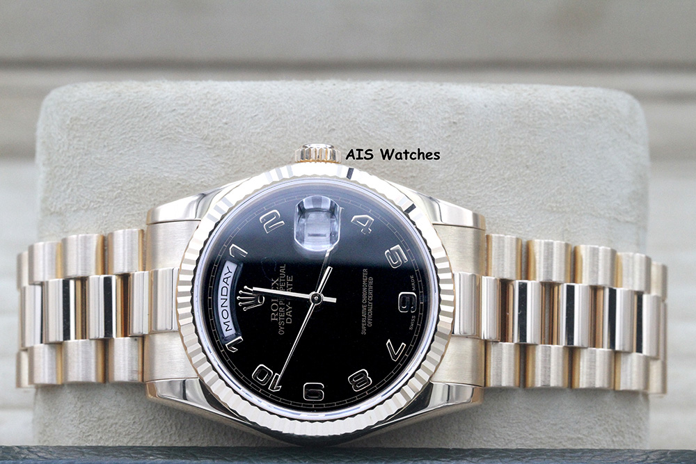 Up for sale is a Rolex 118235 DayDate 36MM Rose Gold Black Arabic Dial