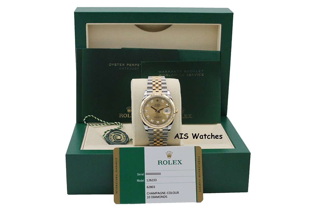 Up for sale is a Rolex 126233 Datejust 36MM 18K YG / SS Champagne Diamond Dial Jubilee Bracelet Box & Papers. The timepiece is in excellent condition.