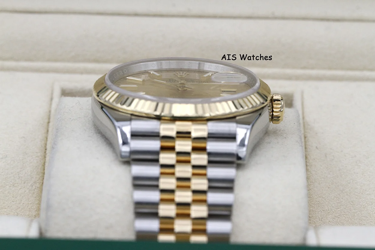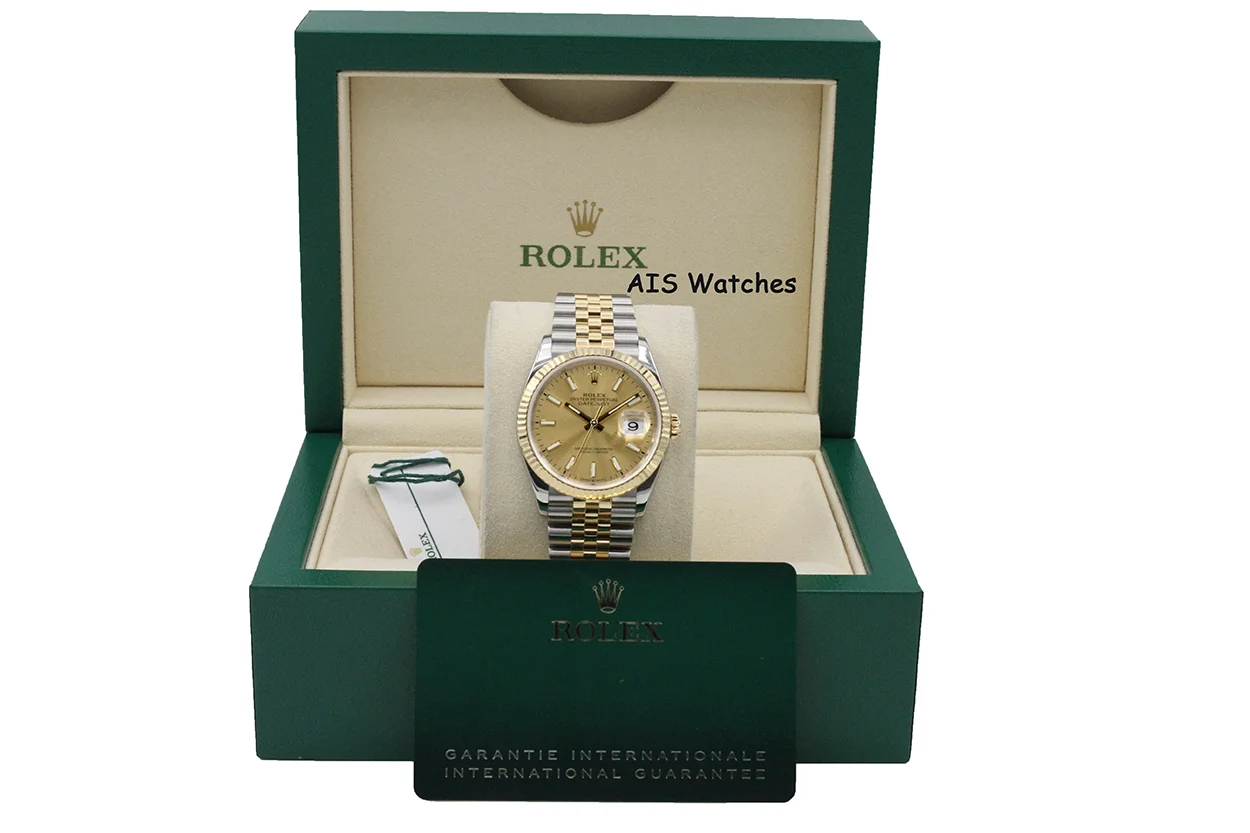 Up for sale is a Rolex 126233 DateJust 36MM 18K YG/SS Champagne Stick Dial Jubilee Bracelet Box & Papers. The timepiece is in excellent condition.