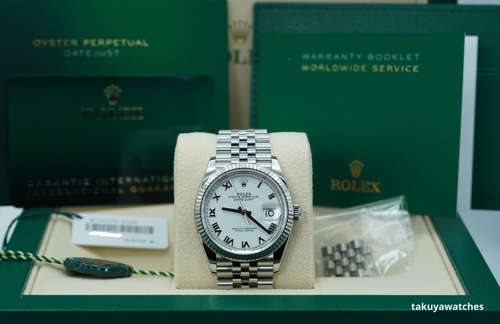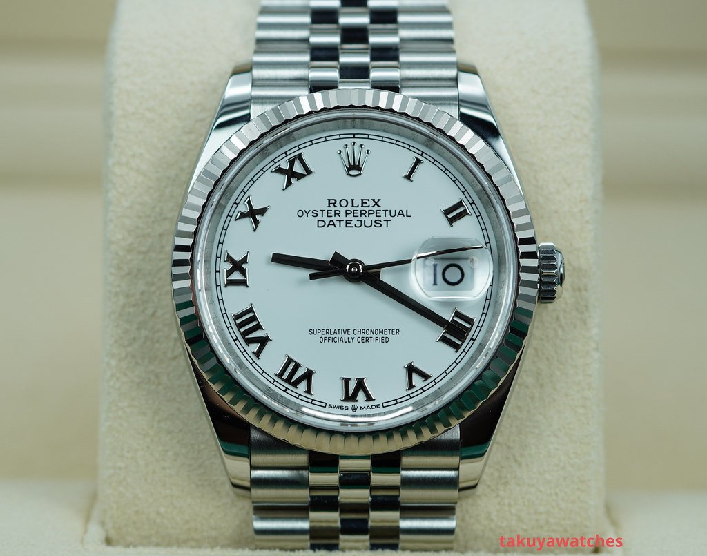 ·Rolex 126234 DATEJUST 36 FLUTED BEZEL WHITE ROMAN DIAL JUBILEE 2024 FULL SET