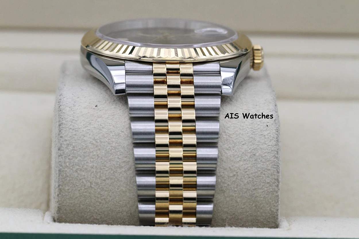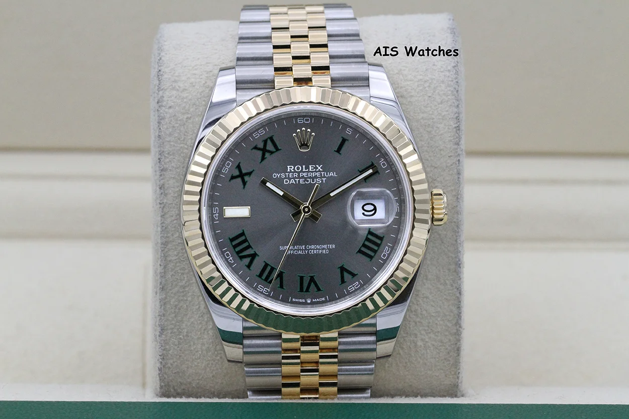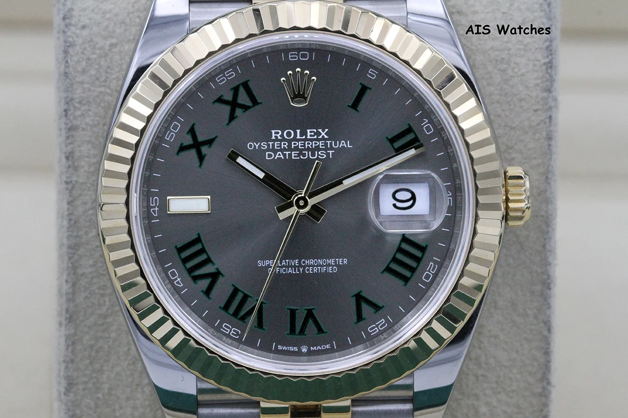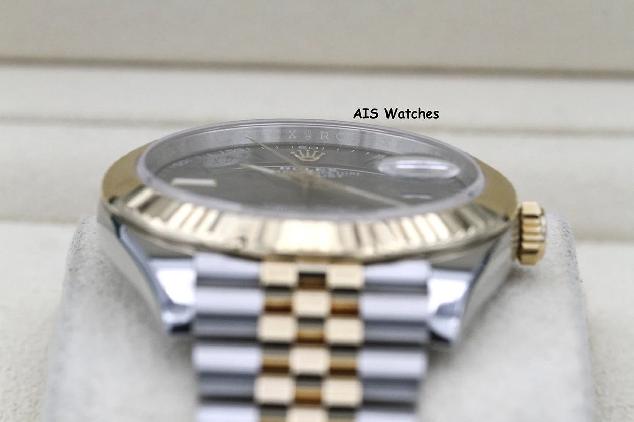 Up for sale is a Rolex 126333 DateJust 41MM 18K YG/SS Slate Roman / Wimbeldon Dial Jubilee Bracelet Box & Papers. The timepiece is in excellent condition.