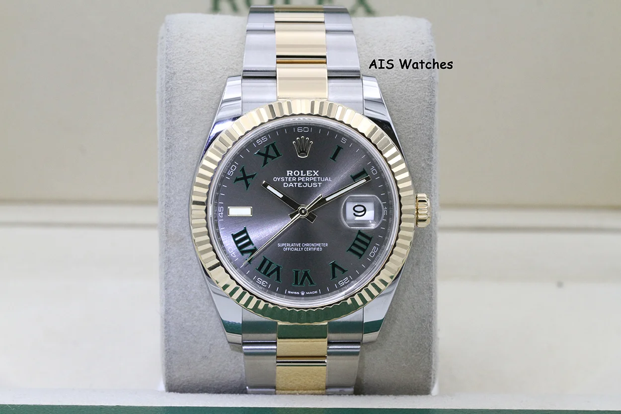Up for sale is a Rolex 126333 DateJust 41MM 18K YG/SS Slate Roman / Wimbeldon Dial Oyster Bracelet Box & Papers. The timepiece is in excellent condition.